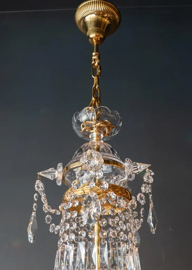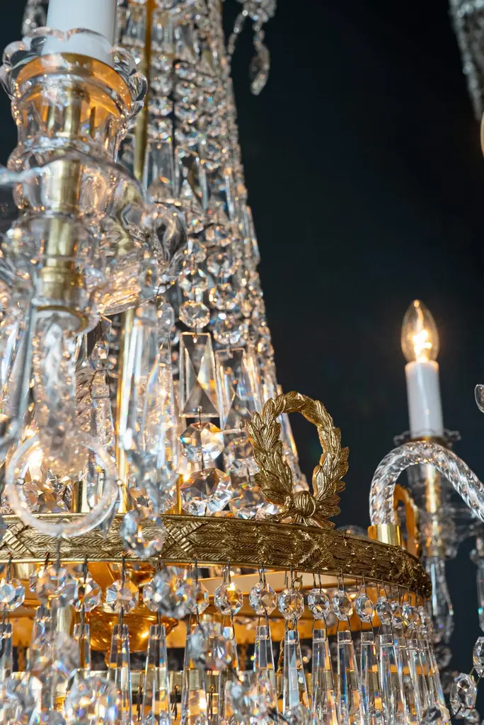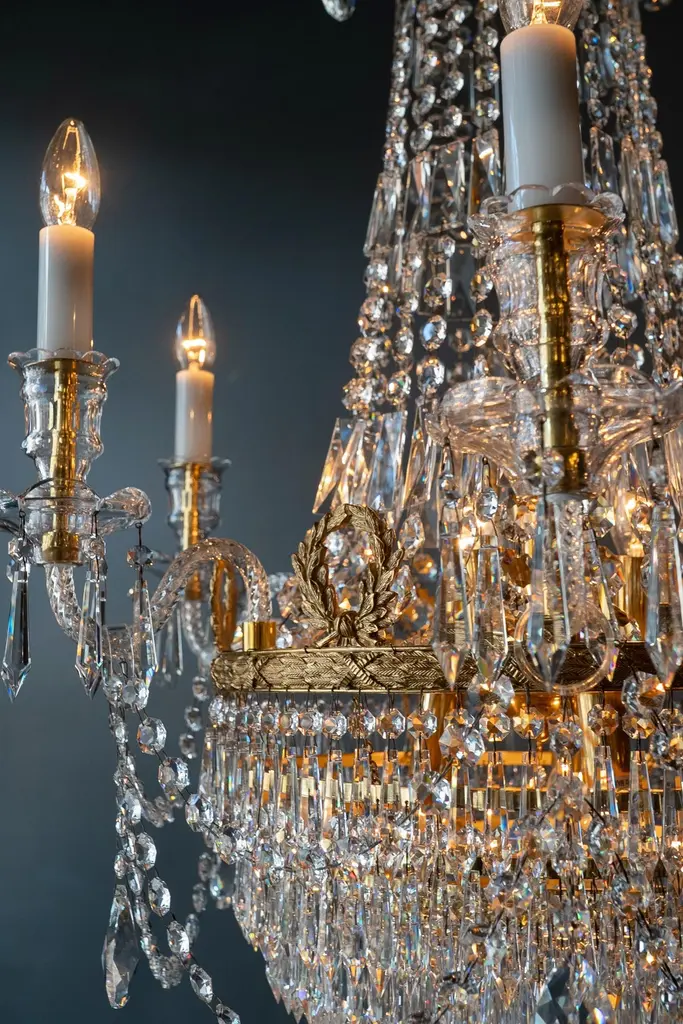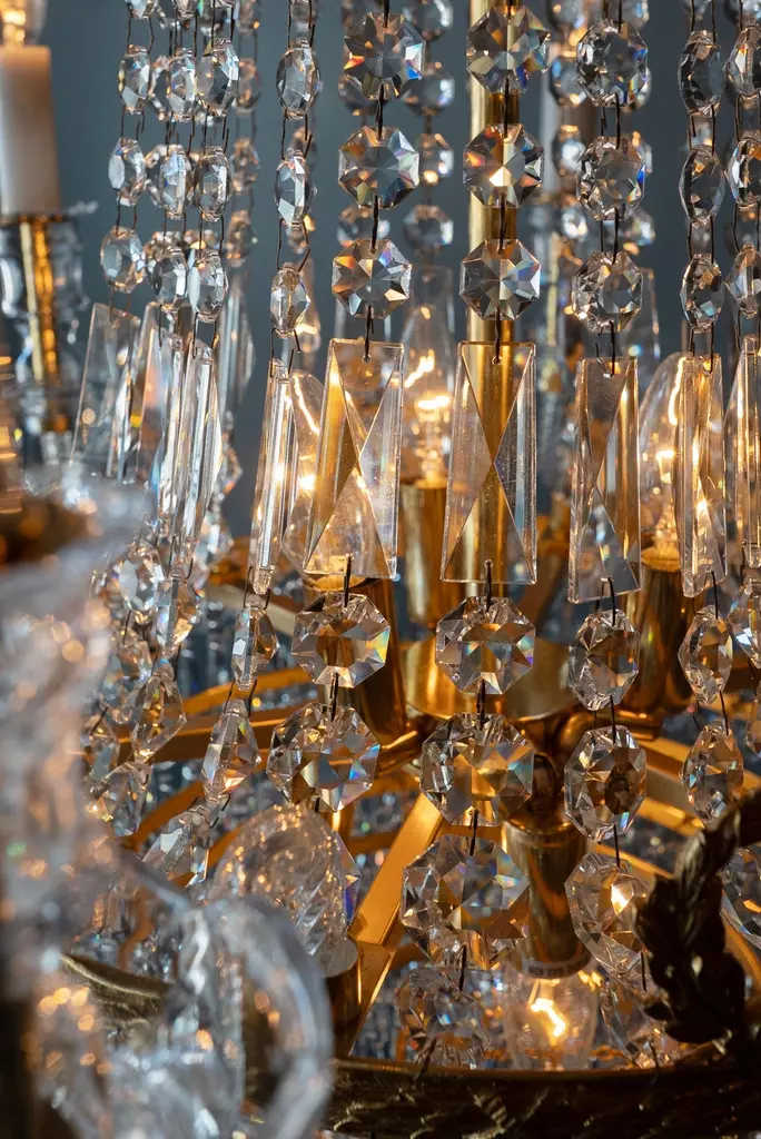 A Piece of History Recreated – Timeless Beauty, Faithfully RebornEvery now and then, you come across a piece that leaves a lasting impression. For me, it was this chandelier a stunning original from a castle by the Baltic Sea. Its elegance, its presence, and the craftsmanship behind it were simply unforgettable.When the original was no longer available, I made the decision to have it faithfully reproduced. Not redesigned. Not modernized. But rebuilt exactly as it once was, down to the smallest detail. The proportions, the materials, the arrangement of the crystals everything remains true to the original.Newly Crafted with the Spirit of the Past and the Standards of TodayThough newly produced, this chandelier carries the full character and charm of its historical predecessor. At the same time, its wiring and sockets have been built to meet today’s global electrical standards. It is fully compatible for use around the world, including in the US, and is ready to install immediately.SpecificationsTotal height: 140 cmHeight without chain: 110 cmDiameter: 71 cmWeight: approximately 17 kgNumber of lights: 12Bulb sockets: E14Materials: Brass, glass, crystalSafe Worldwide Shipping in Custom Wooden CratesEach chandelier is carefully packed in a custom-built wooden crate to ensure safe delivery anywhere in the world. Before shipping, it will be thoroughly checked, and any missing crystals will be replaced so it arrives in flawless condition.A Chandelier Meant to Last for GenerationsThis chandelier is more than just a light fixture it is a tribute to timeless design and traditional craftsmanship. By staying completely true to the original, it brings the soul of a historic piece into modern interiors. A captivating blend of history and elegance, ready to light up your space.