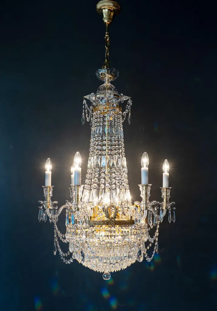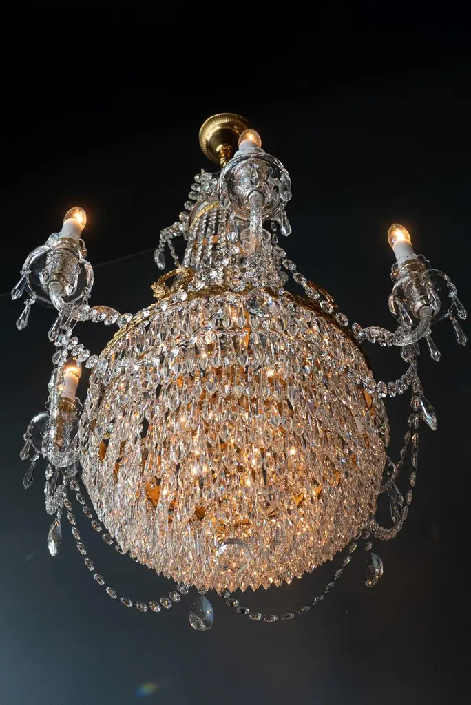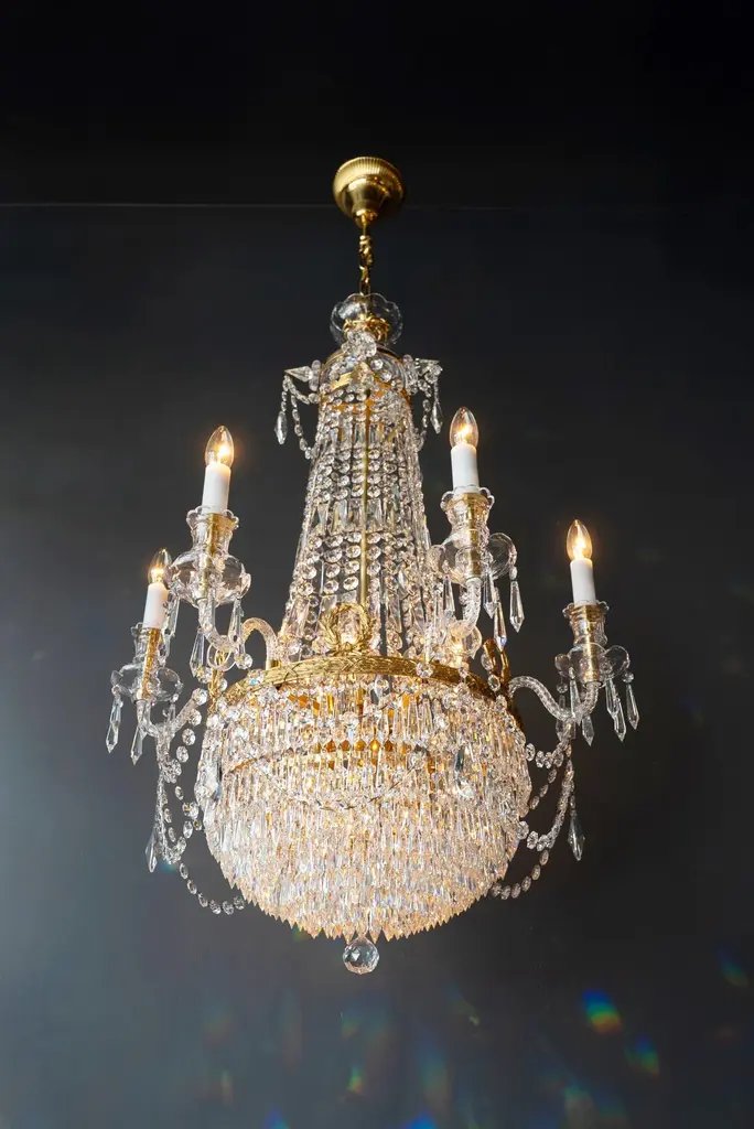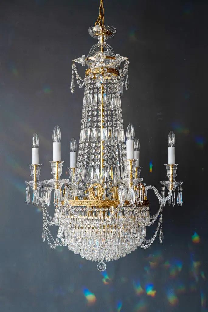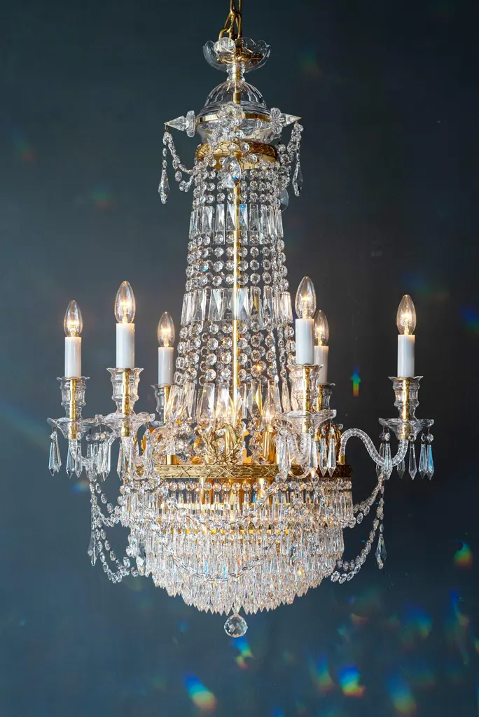 A Piece of History Recreated – Timeless Beauty, Faithfully RebornEvery now and then, you come across a piece that leaves a lasting impression. For me, it was this chandelier a stunning original from a castle by the Baltic Sea. Its elegance, its presence, and the craftsmanship behind it were simply unforgettable.When the original was no longer available, I made the decision to have it faithfully reproduced. Not redesigned. Not modernized. But rebuilt exactly as it once was, down to the smallest detail. The proportions, the materials, the arrangement of the crystals everything remains true to the original.Newly Crafted with the Spirit of the Past and the Standards of TodayThough newly produced, this chandelier carries the full character and charm of its historical predecessor. At the same time, its wiring and sockets have been built to meet today’s global electrical standards. It is fully compatible for use around the world, including in the US, and is ready to install immediately.SpecificationsTotal height: 140 cmHeight without chain: 110 cmDiameter: 71 cmWeight: approximately 17 kgNumber of lights: 12Bulb sockets: E14Materials: Brass, glass, crystalSafe Worldwide Shipping in Custom Wooden CratesEach chandelier is carefully packed in a custom-built wooden crate to ensure safe delivery anywhere in the world. Before shipping, it will be thoroughly checked, and any missing crystals will be replaced so it arrives in flawless condition.A Chandelier Meant to Last for GenerationsThis chandelier is more than just a light fixture it is a tribute to timeless design and traditional craftsmanship. By staying completely true to the original, it brings the soul of a historic piece into modern interiors. A captivating blend of history and elegance, ready to light up your space.