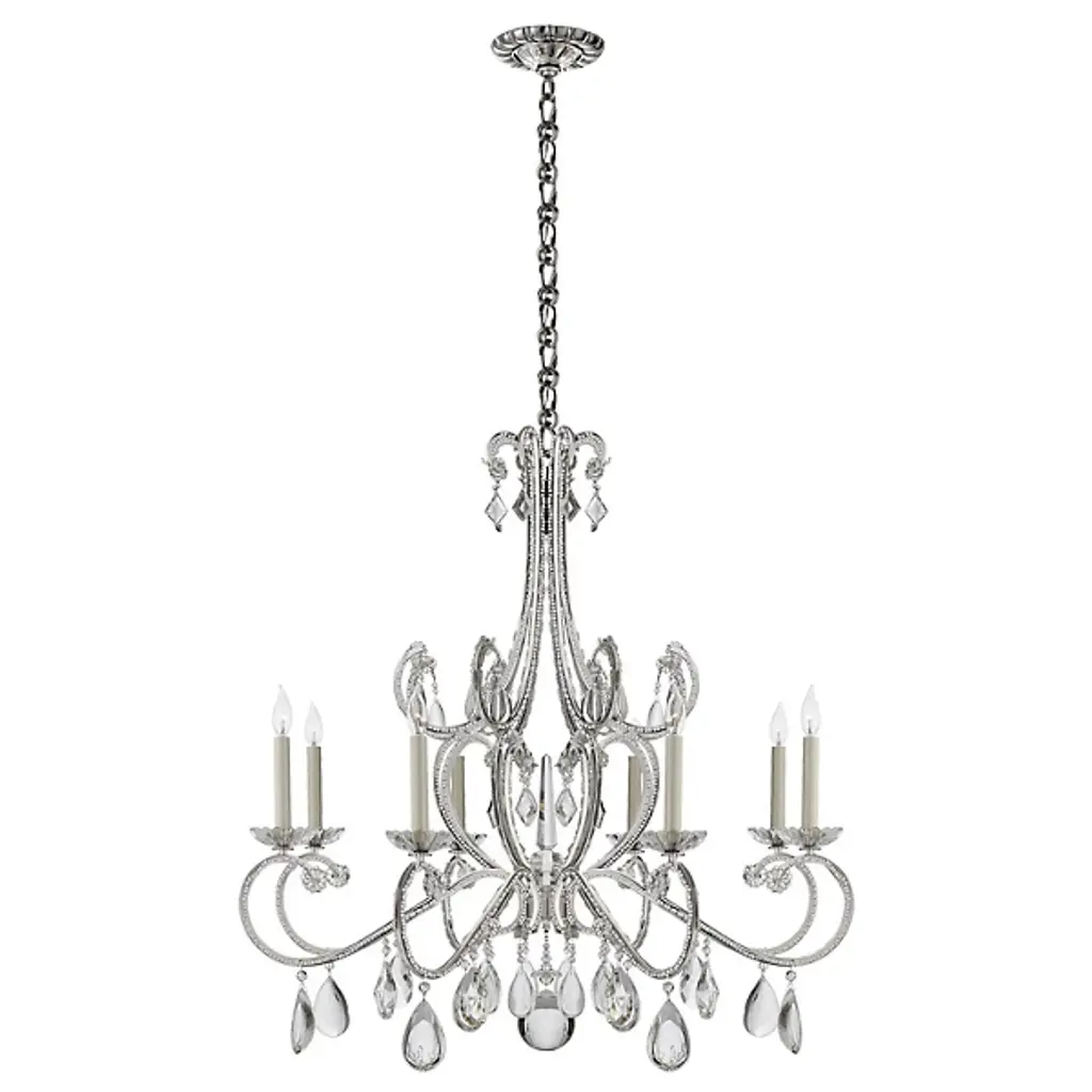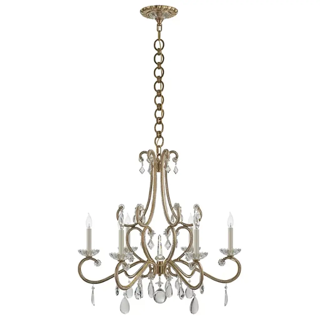 Fine crystals, sweeping curves, and candle-inspired lamping come together to create the cheerful and magical Montmartre Chandelier from Visual Comfort Signature, formerly known as Visual Comfort, The chandelier draws from the elaborate and, at times, unbelievable decoration of traditional design. This energetic piece looks perfect in the foyer, living room, or dining room. It draws one’s attention with a metal framework of curvy contours that evokes a graphical drawing. Teardrop, floral, and pointy crystal forms dotting the framework charm in their diversity. The candle-inspired lamping on top adds vibrant highlights to the crystal, creating a pleasant, golden aura.