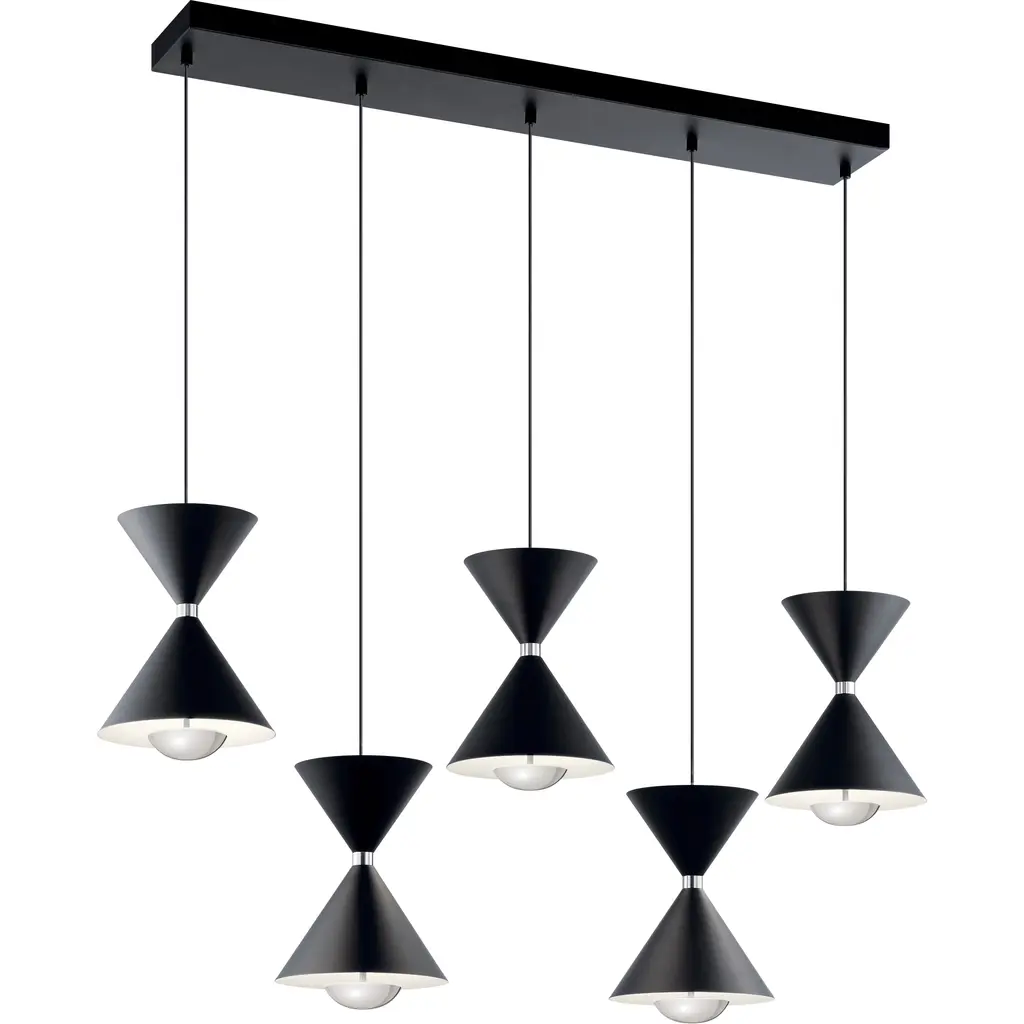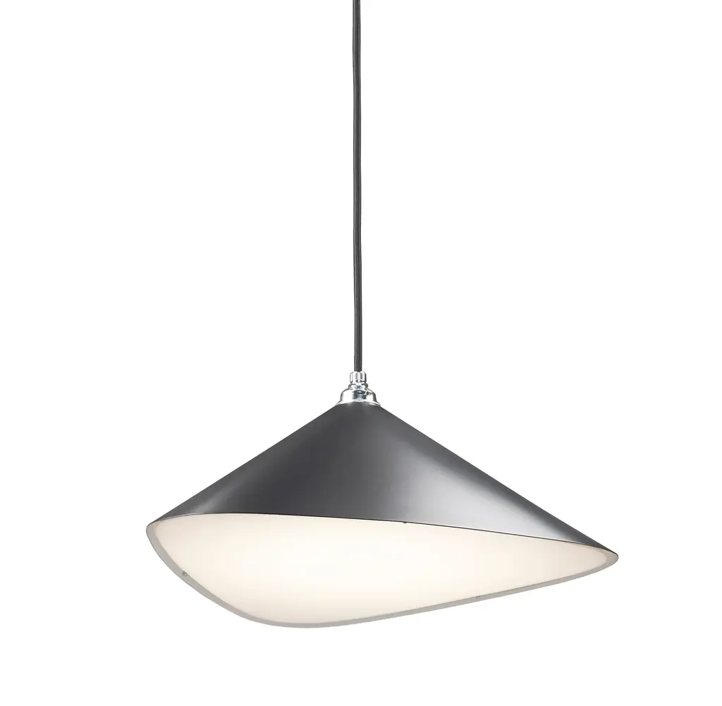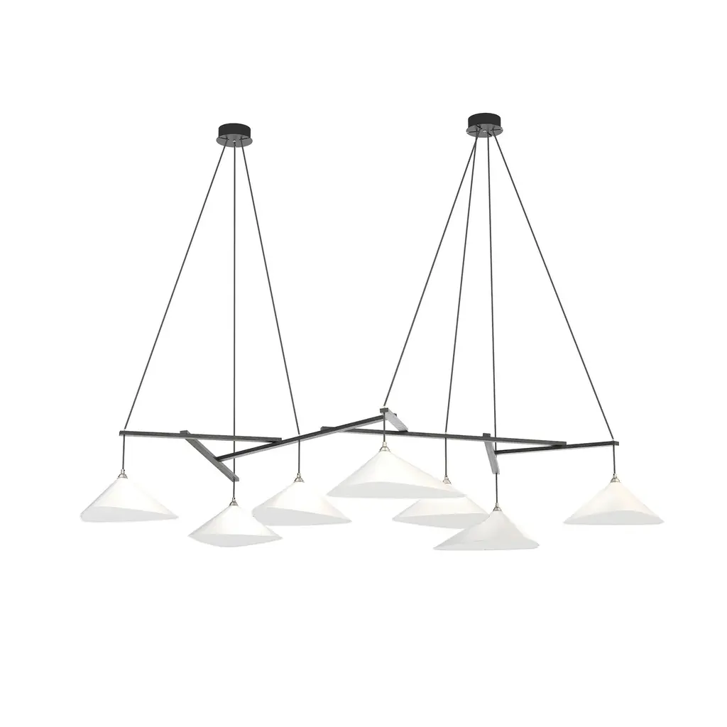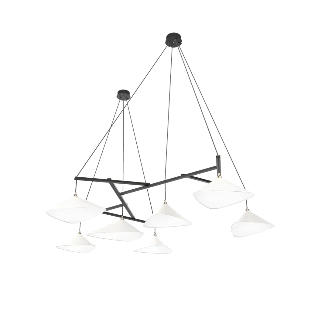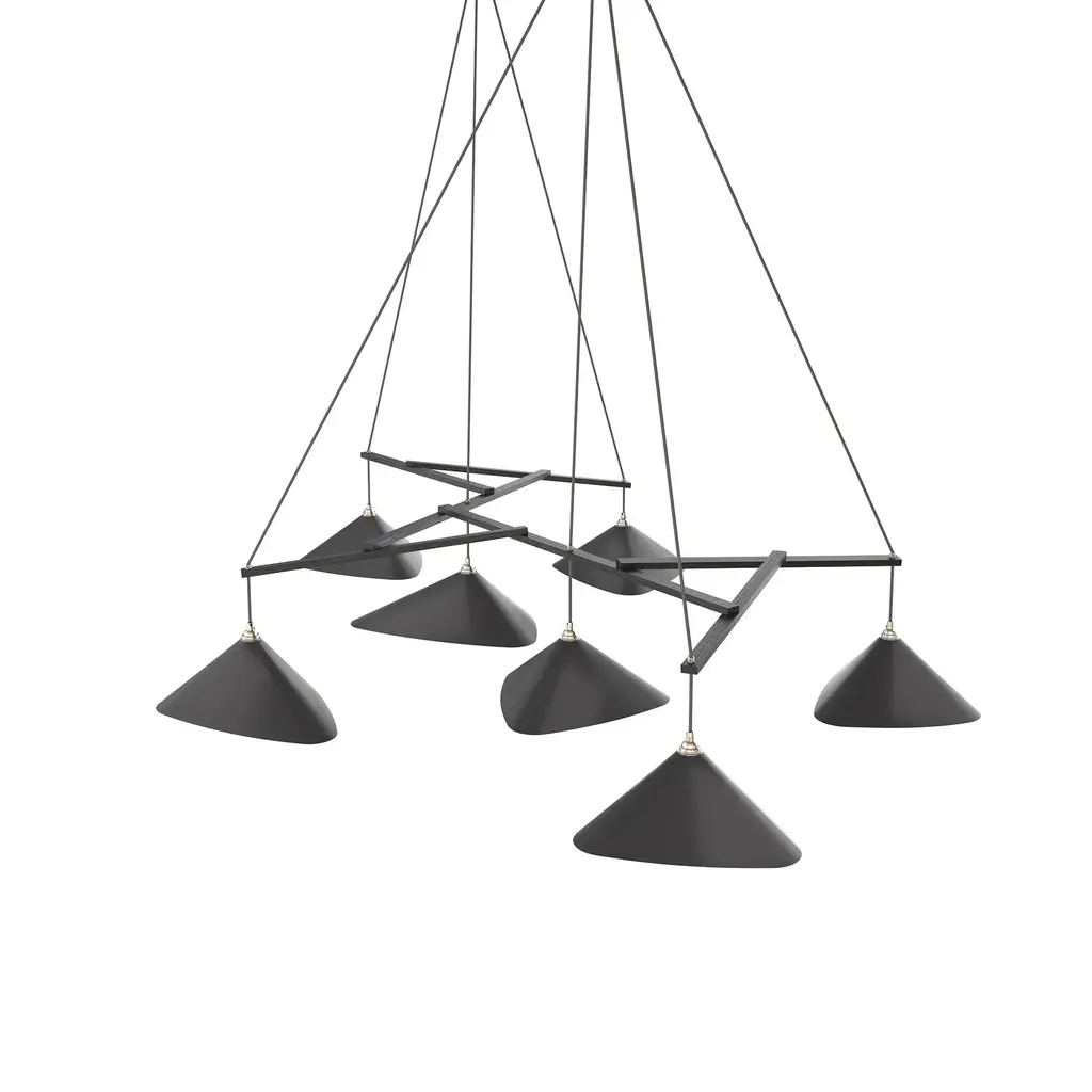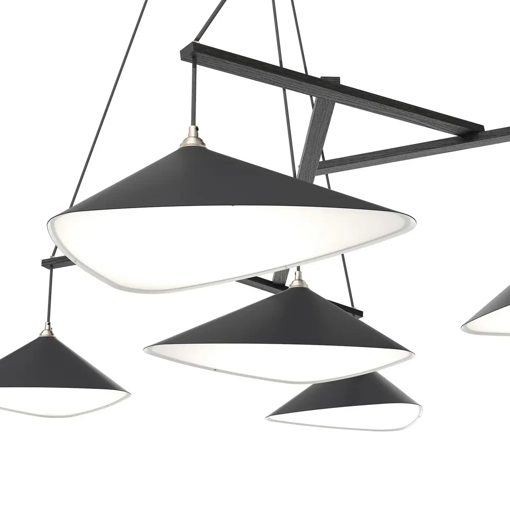 Monumental Daniel Becker Emily 7 Chandelier in Anthracite/Black for Moss Objects. Designed by Berlin luminary Daniel Becker and handmade to order using modern and mid-century manufacturing techniques, the Emily Series won the prestigious German Design Award 2019. The high quality sheet steel shades are cut, bent, formed, welded and sanded by hand in a complex process to build natural, organic shapes before they are painted semi-matte anthracite and fitted with opaline PMMA diffusers. Then they are arranged in a mobile like fashion around a sculptural frame of waxed black painted oak timber. Price per item. Shades available in ultra-high gloss black as well as semi-matte anthracite or white. Custom colors available upon request for an additional fee. This listing is for the Emily 7 chandelier in semi-matte black gray with black oak frame. Please note that the photos in this listing also shows other color and finish options. Prices vary. Standard in-stock lead time 5-6 weeks. Out of stock lead time up to 8 weeks or more. Please note in-stock availability subject to change. Handmade to order. All sales are final. Emily Group of 7 consists of: 4x Emily I (L x W x H 13.5 x 9.5 x 6.5 in.) 3x Emily II (L x W x H 15.5 x 14.5 x 6.5 in.) Measures: 2x 5.5 inch diameter x 2 inch deep black painted metal ceiling canopies spaced 40.6 inches apart. 9.8 feet of black textile cord. Wired for US electrical, each shade accommodates a single e26 medium base maximum 75 Watt Equivalent LED bulb. Bulb not included. Not UL listed, but recommended UL listing possible from an authorized 3rd party vendor upon request for an additional fee. Made to order. All sales are final.