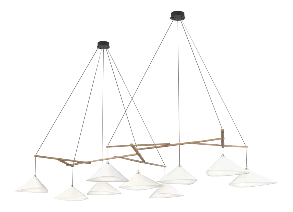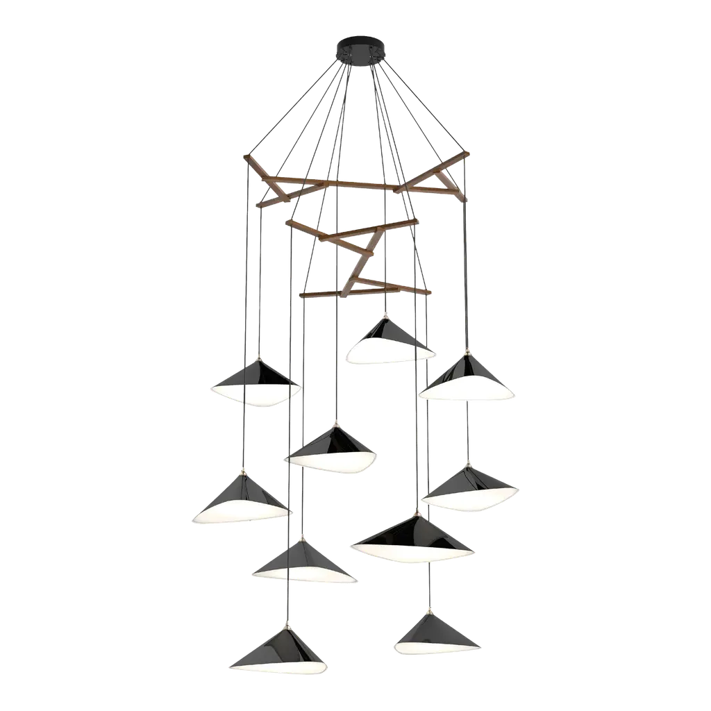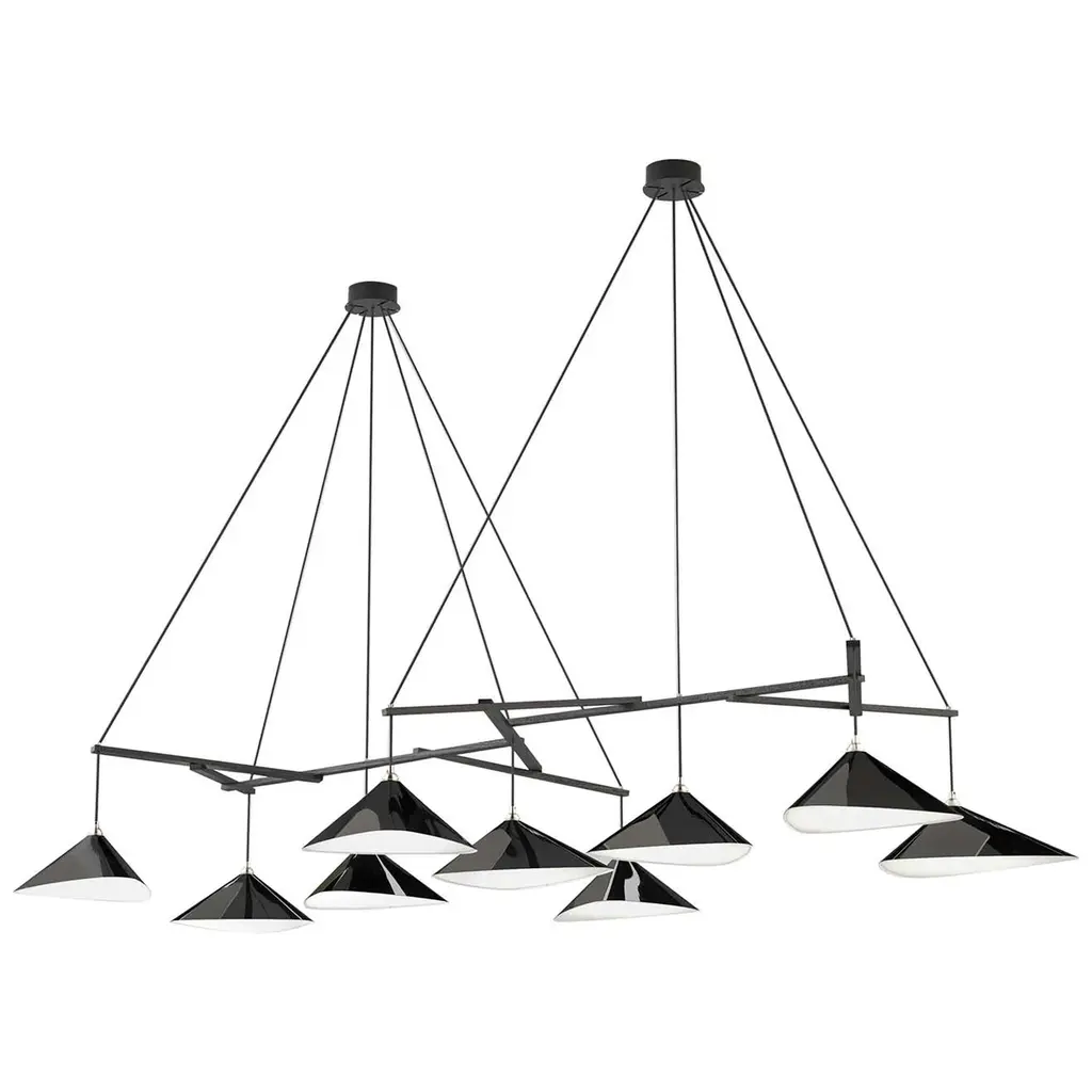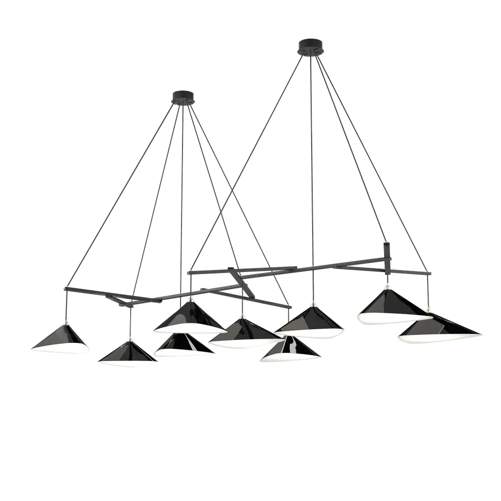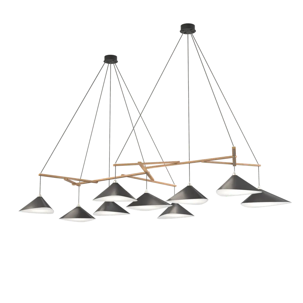 Monumental Daniel Becker Emily 9 Chandelier in Matte Anthracite for Moss Objects. Designed by Berlin luminary Daniel Becker and handmade to order using mid-century manufacturing techniques. Executed in high-quality sheet metal with matte anthracite paint, a sculptural frame of black oak timber and opaline Perspex diffusers. Price per item. Shades available in ultra-high gloss black as well as matte finish in anthracite or white. Custom colors available upon request for an additional fee. This listing is for the Emily 9 chandelier in matte anthracite with black oak frame. Please note that the photos in this listing also show the other size, color and finish options. Prices vary. Standard in-stock lead time 5-6 weeks. Out of stock lead time up to 8 weeks or more. Please note in-stock availability subject to change. Handmade to order. All sales are final. Group of 9 consists of: 4x Emily I (L x W x H 13.5 x 9.5 x 6.5 in.) 5x Emily II (L x W x H 15.5 x 14.5 x 6.5 in.) Wired for US electrical, each shade accommodates a single e26 medium base maximum 75 Watt Equivalent LED bulb. Bulb not included. Not UL listed, but recommended UL listing possible from an authorized 3rd party vendor upon request for an additional fee. Made to order. All sales are final.