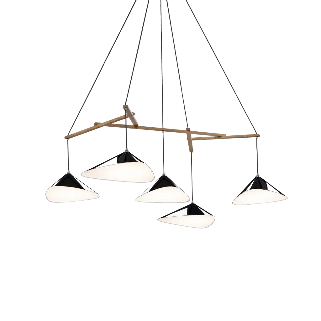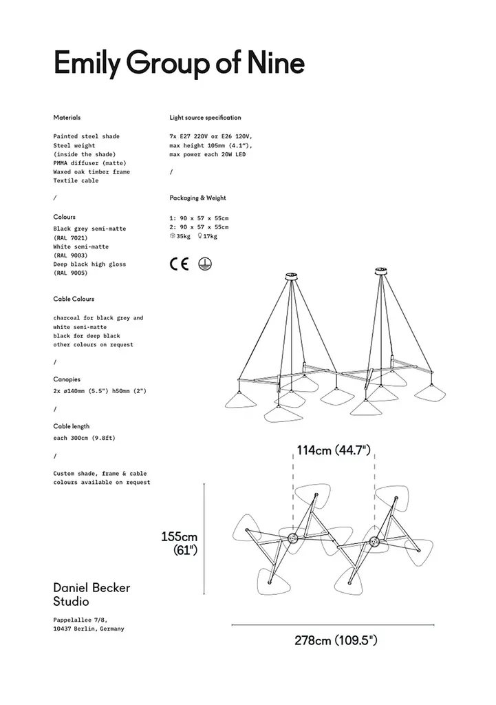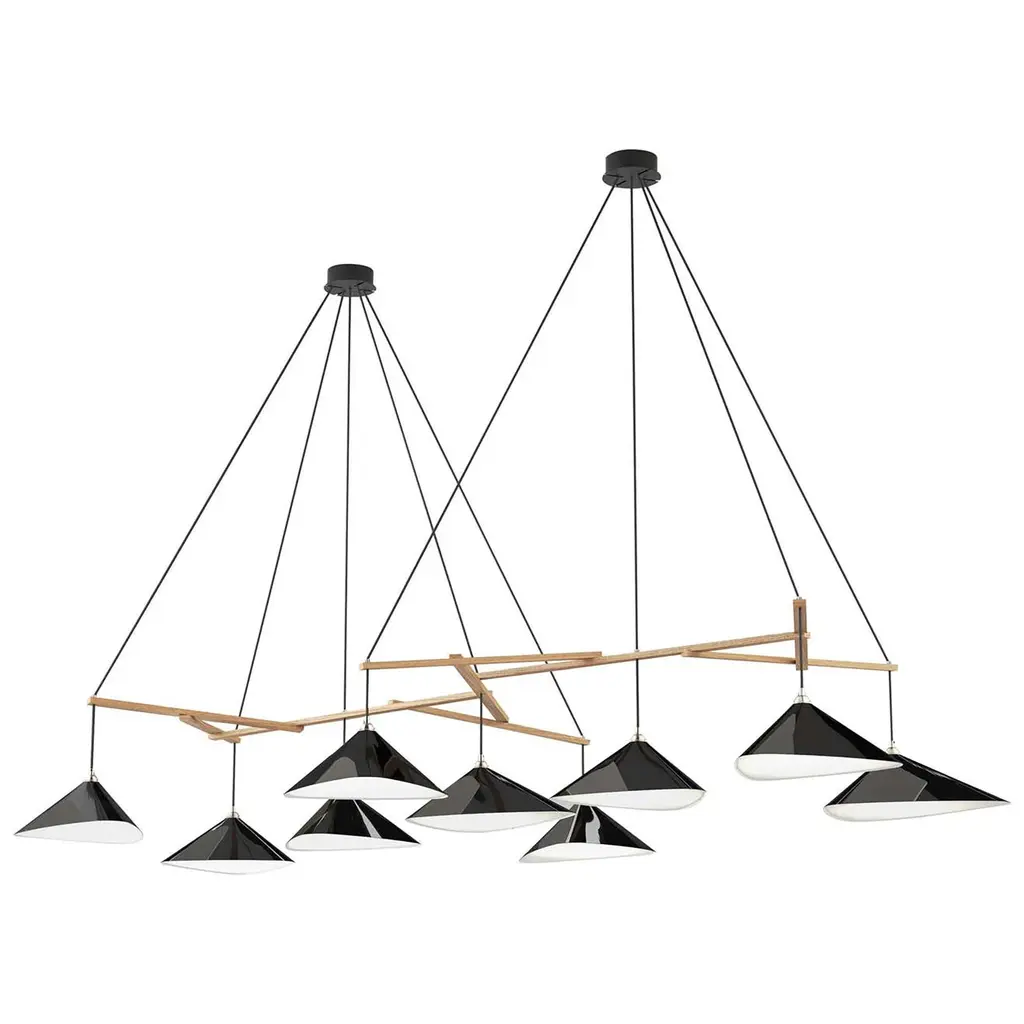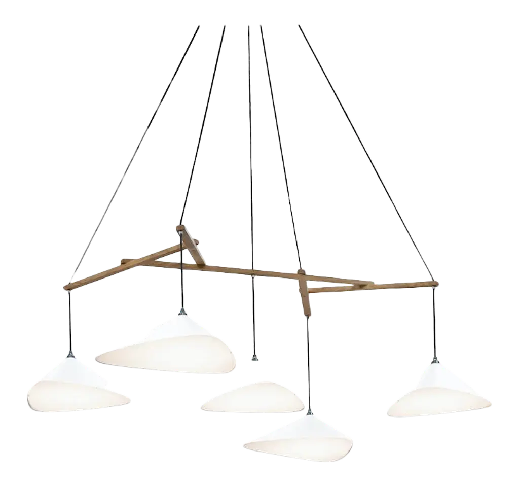 Monumental Daniel Becker Emily 9 Chandelier in Matte White/Oak for Moss Objects. Designed by Berlin luminary Daniel Becker and handmade to order using mid-century manufacturing techniques. Executed in high-quality sheet metal with matte white paint, a sculptural frame of natural oak timber and opaline Perspex diffusers. Price per item. Shades available in ultra-high gloss black as well as matte finish in anthracite or white. Custom colors available upon request for an additional fee. This listing is for the Emily 9 chandelier in matte white with natural oak frame. Please note that the photos in this listing also show the other size, color and finish options. Prices vary. Standard in-stock lead time 5-6 weeks. Out of stock lead time up to 8 weeks or more. Please note in-stock availability subject to change. Handmade to order. All sales are final. Group of 9 consists of: 4x Emily I (L x W x H 13.5 x 9.5 x 6.5 in.) 5x Emily II (L x W x H 15.5 x 14.5 x 6.5 in.) Wired for US electrical, each shade accommodates a single e26 medium base maximum 75 Watt Equivalent LED bulb. Bulb not included. Not UL listed, but recommended UL listing possible from an authorized 3rd party vendor upon request for an additional fee. Made to order. All sales are final.