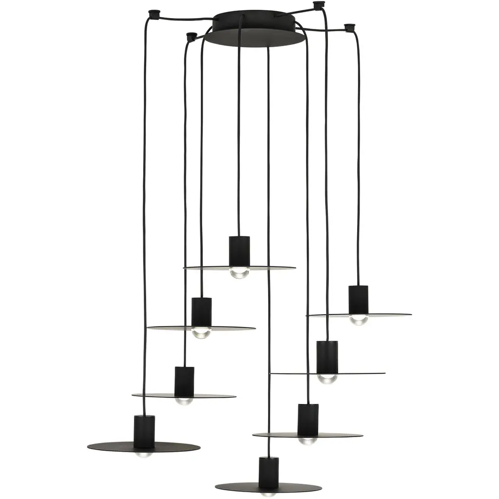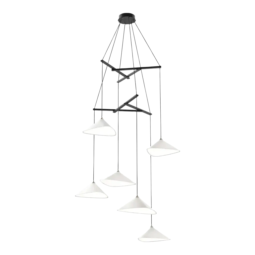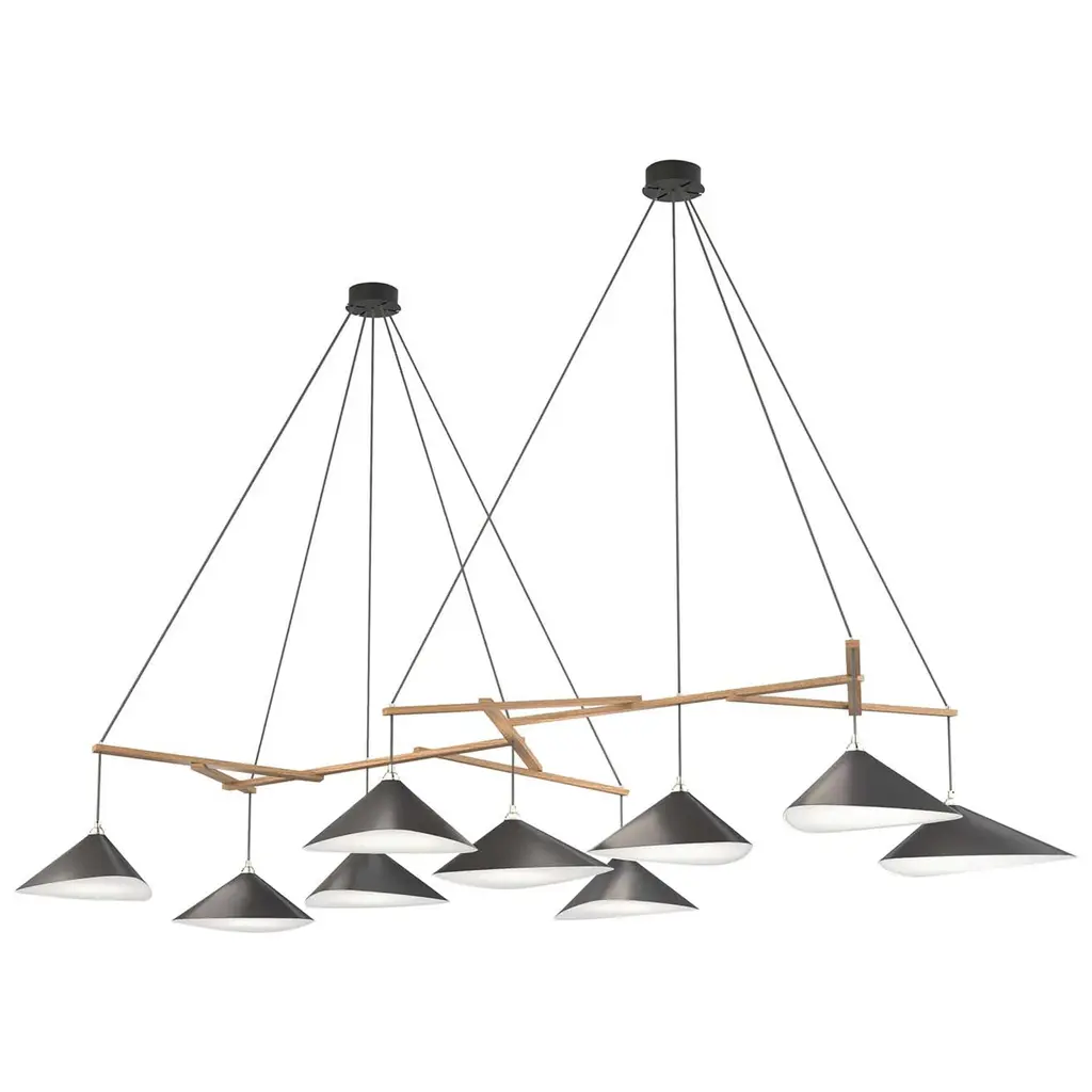 Monumental Daniel Becker Emily 9 Chandelier in Matte White/Oak for Moss Objects. Designed by Berlin luminary Daniel Becker and handmade to order using mid-century manufacturing techniques. Executed in high-quality sheet metal with matte white paint, a sculptural frame of natural oak timber and opaline Perspex diffusers. Price per item. Shades available in ultra-high gloss black as well as matte finish in anthracite or white. Custom colors available upon request for an additional fee. This listing is for the Emily 9 chandelier in matte white with natural oak frame. Please note that the photos in this listing also show the other size, color and finish options. Prices vary. Standard in-stock lead time 5-6 weeks. Out of stock lead time up to 8 weeks or more. Please note in-stock availability subject to change. Handmade to order. All sales are final. Group of 9 consists of: 4x Emily I (L x W x H 13.5 x 9.5 x 6.5 in.) 5x Emily II (L x W x H 15.5 x 14.5 x 6.5 in.) Wired for US electrical, each shade accommodates a single e26 medium base maximum 75 Watt Equivalent LED bulb. Bulb not included. Not UL listed, but recommended UL listing possible from an authorized 3rd party vendor upon request for an additional fee. Made to order. All sales are final.