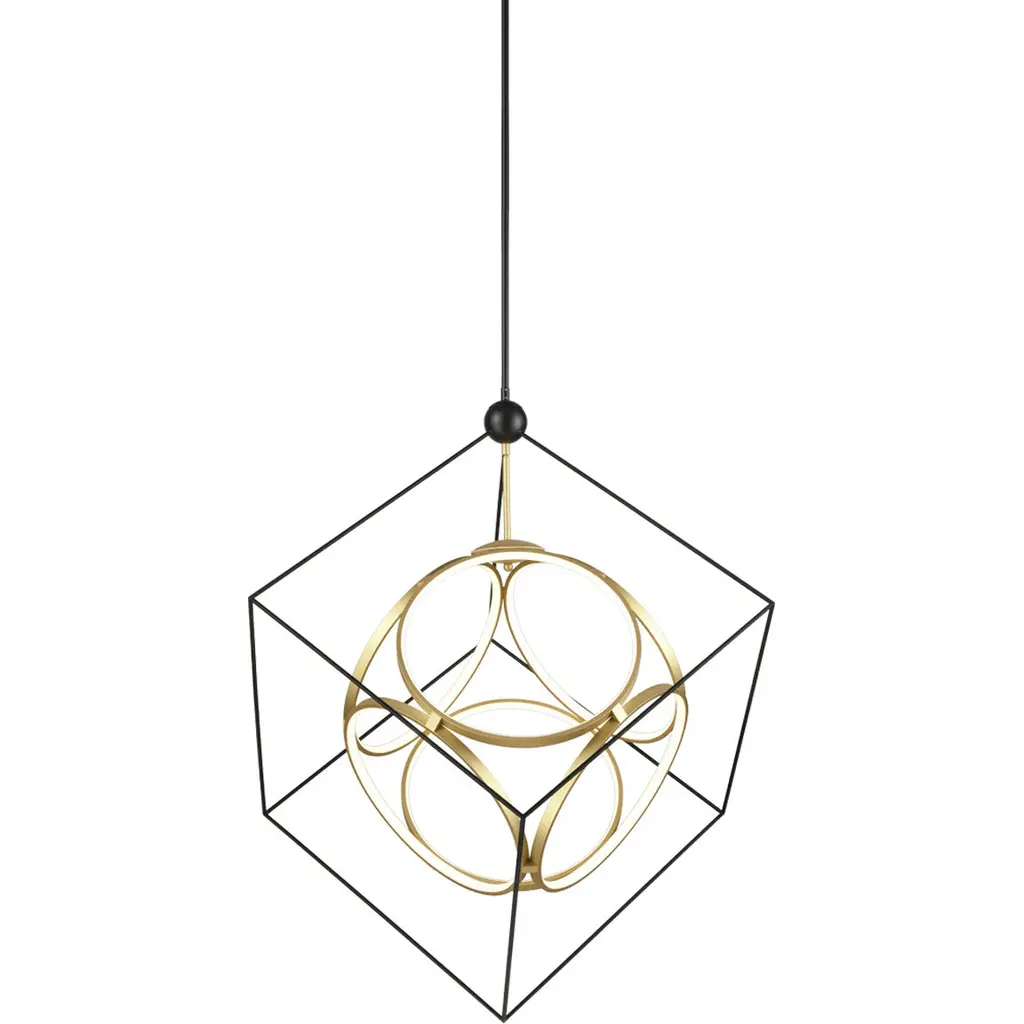 Your new floating geometric contemporary luminary A brilliant contrast of geometric shapes outfitted with powerful LED lighting, the Monza Chandelier from Kuzco Lighting brings contemporary perfection to any room in your home. Showcasing interconnecting aluminum rings within a steel frame cube, this chandelier offers a finely textured metallic and satin powder-coated finish with an opal silicon circular diffuser for that perfect glow. Install multiple across your kitchen island countertop for a well-lit morning routine or hang several at varying heights and sizes for a unique and welcoming lighting design in your entryway or staircase area. Why We Love It: Features