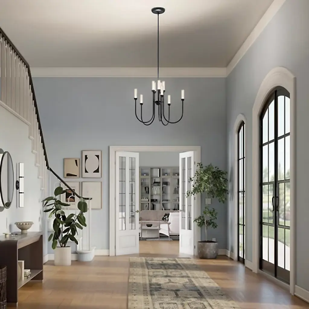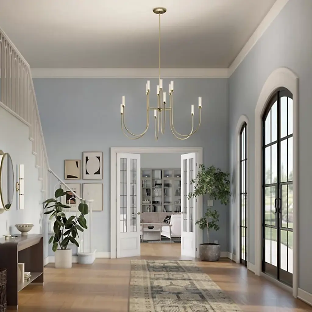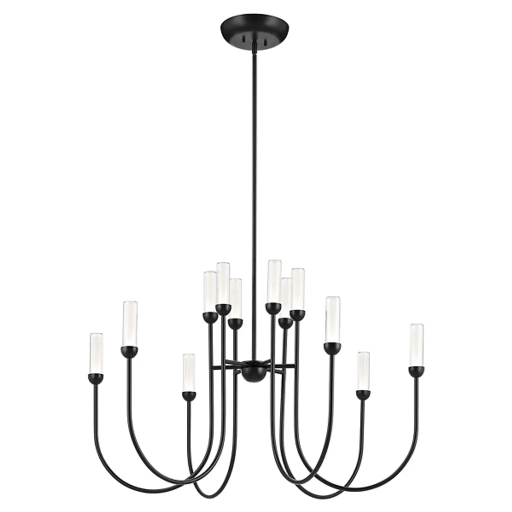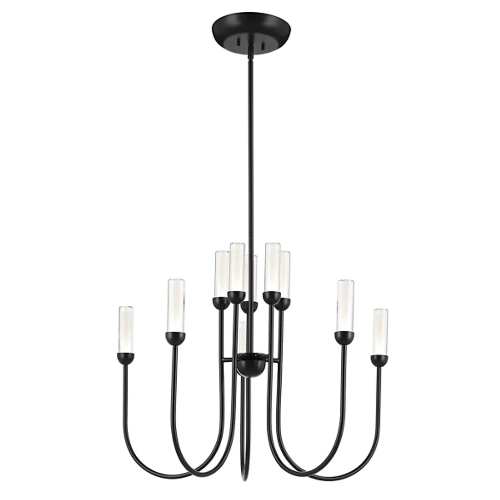 The Moraine LED Chandelier from Kichler blends trendy design with timeless elegance. Graceful concentric curves offer a modern take on the classic chandelier, bringing sculptural sophistication to any space. Each candle-like holder holds an integrated LED light, surrounded by layered glass—clear on the outside with an etched interior—to create the warm, ambient glow of traditional candlelight. Sleek yet refined, this chandelier adds a touch of contemporary charm while illuminating your space with soft, inviting light.