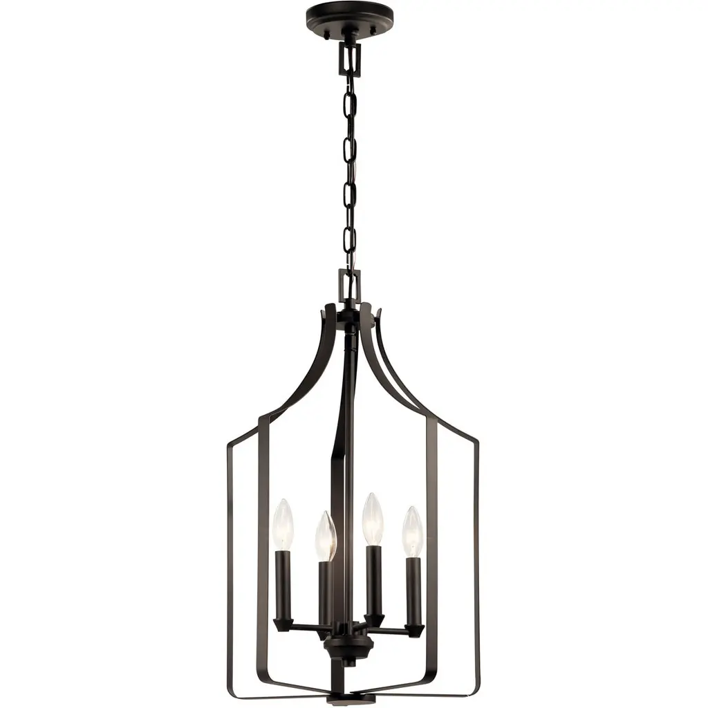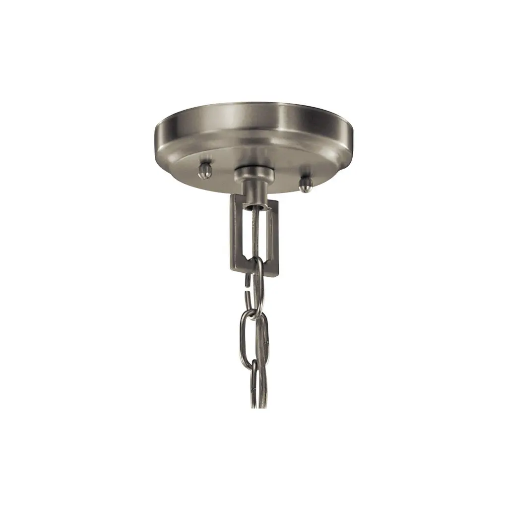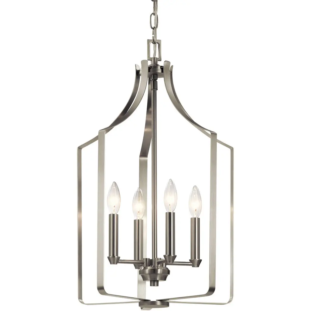 The MorriganTM 4-light mini chandelier in Brushed Nickel finish highlights the beauty of candelabras with a modern twist of clean lines, an open cage structure, and curved design detail. Its traditional inspired style mixes nicely with a variety of looks.