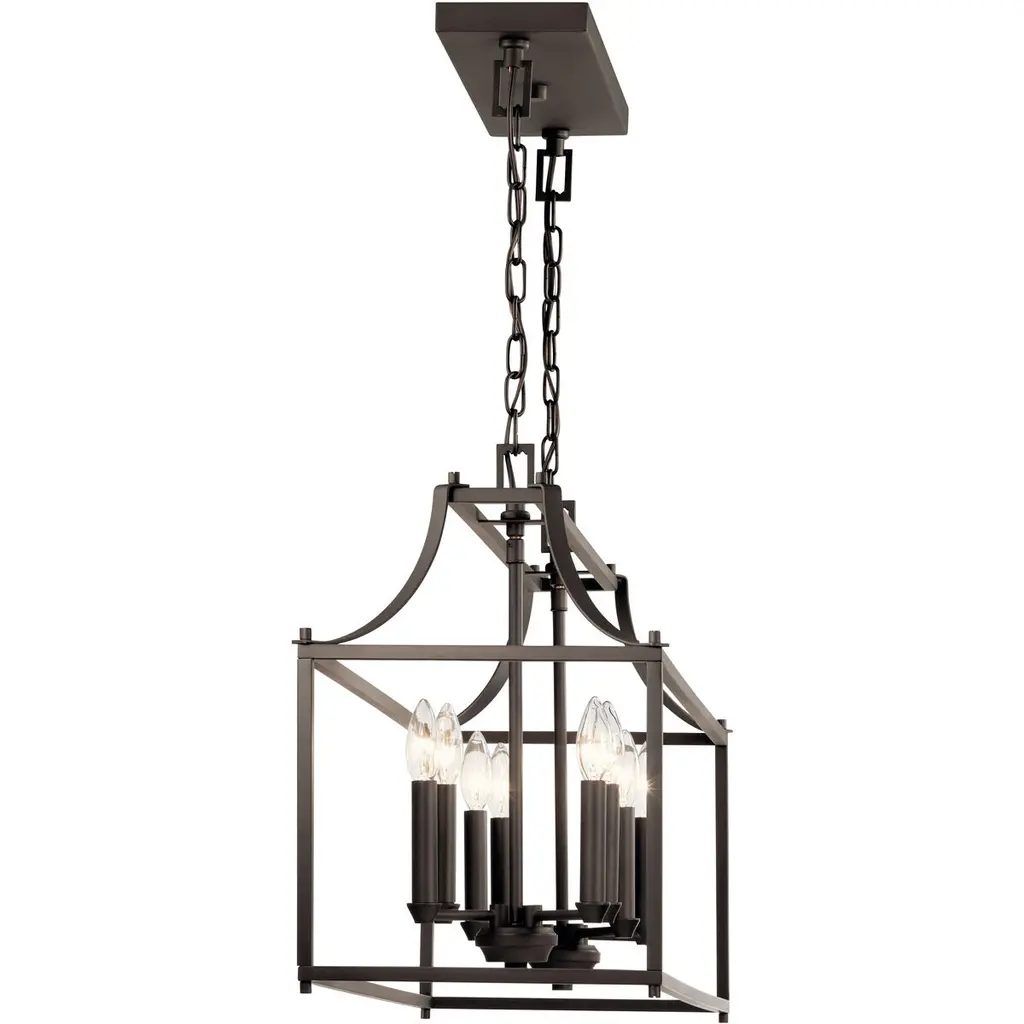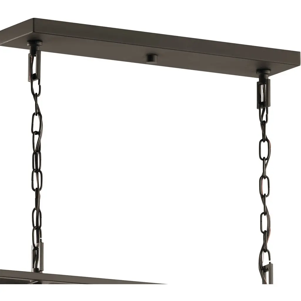 The MorriganTM 8-light linear chandelier in Old Bronze finish highlights the beauty of candelabras with a modern twist of clean lines, an open cage structure, and curved design detail. Its traditional inspired style mixes nicely with a variety of looks.
