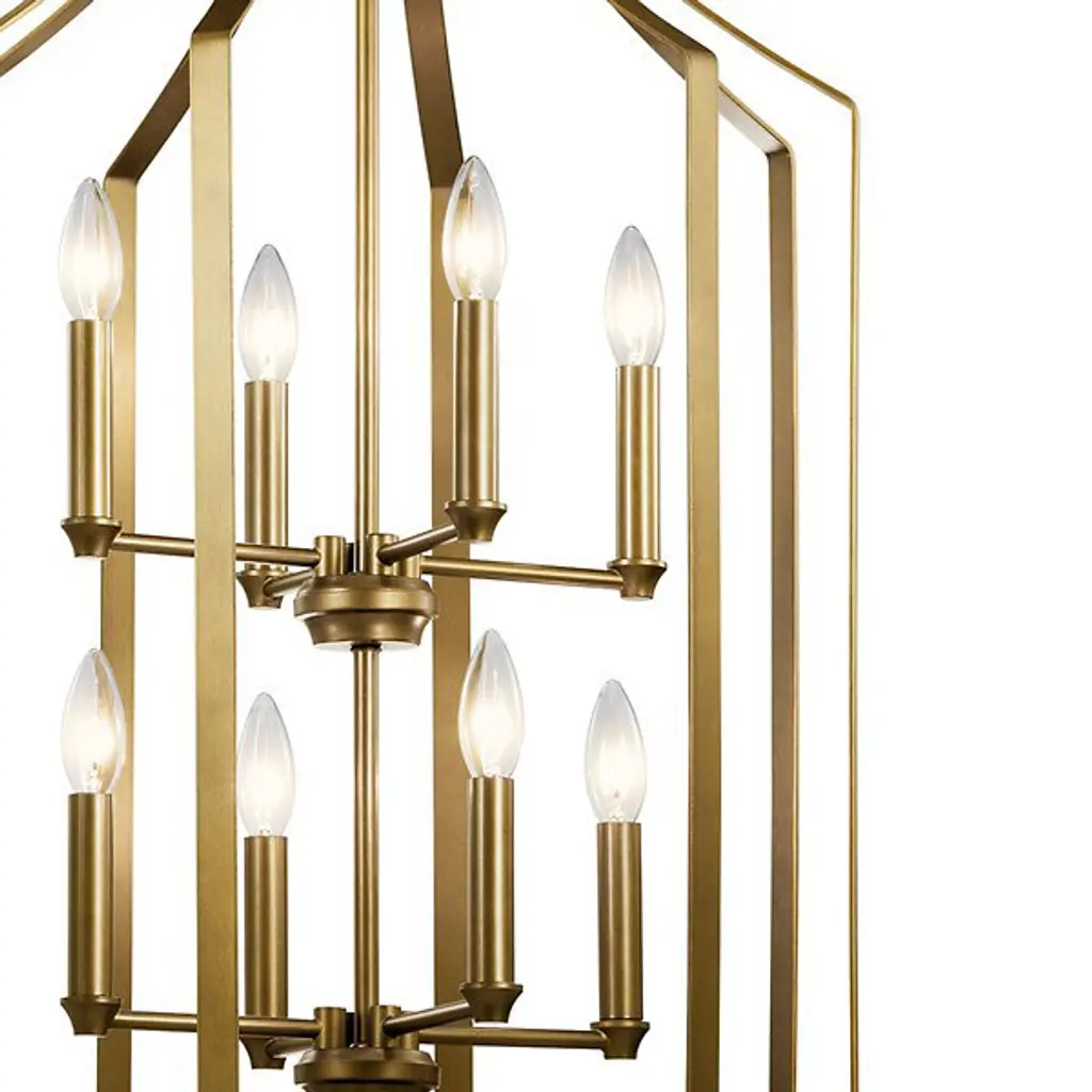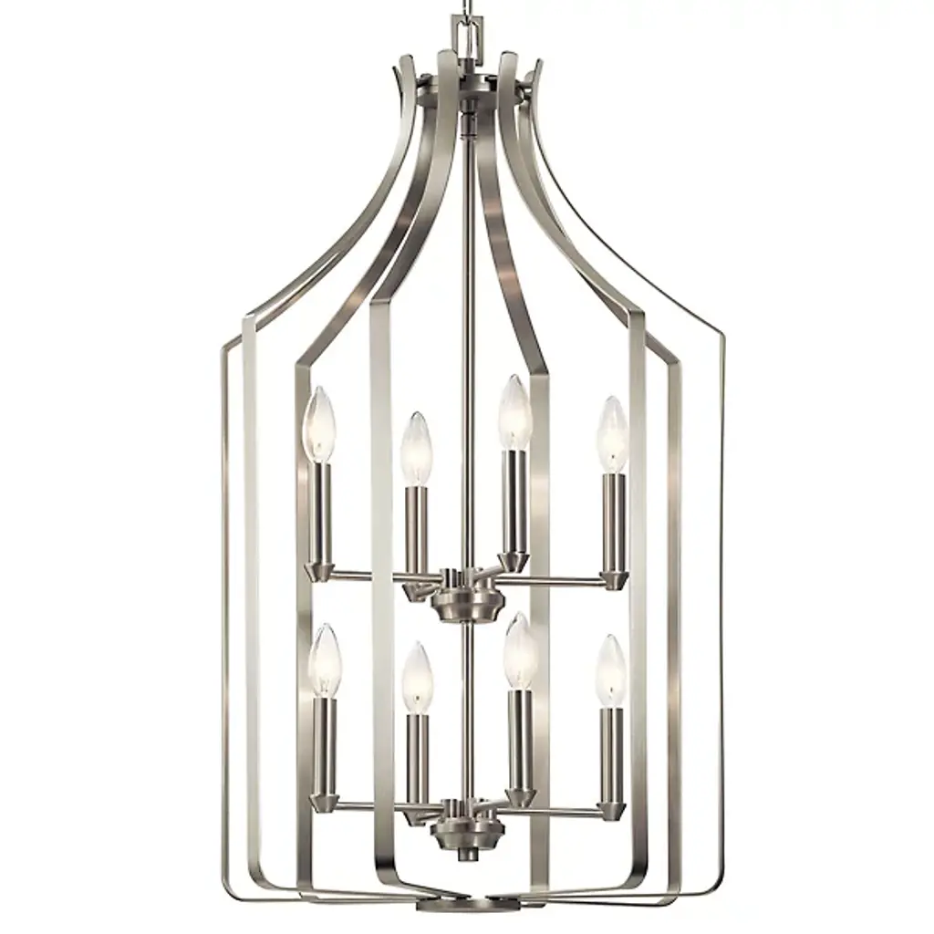 Its crisp vertical structure mimics architectural lines, while its lamping mimics figural forms in this charming piece of transitional design. The Morrigan Foyer Chandelier from Kichler is a layered composition that towers over dining tables and kitchen islands with sheer grace. The construction feels elegantly uniform through the radiating design of its outside metal structure, as well as its attractive lamp holders inside. When lit with candelabra bulbs, heads of gorgeous light translate into a mesmerizing glow, silho