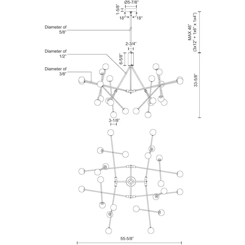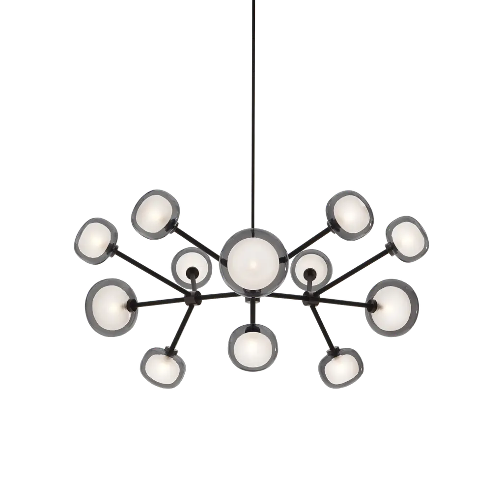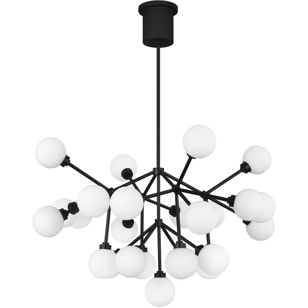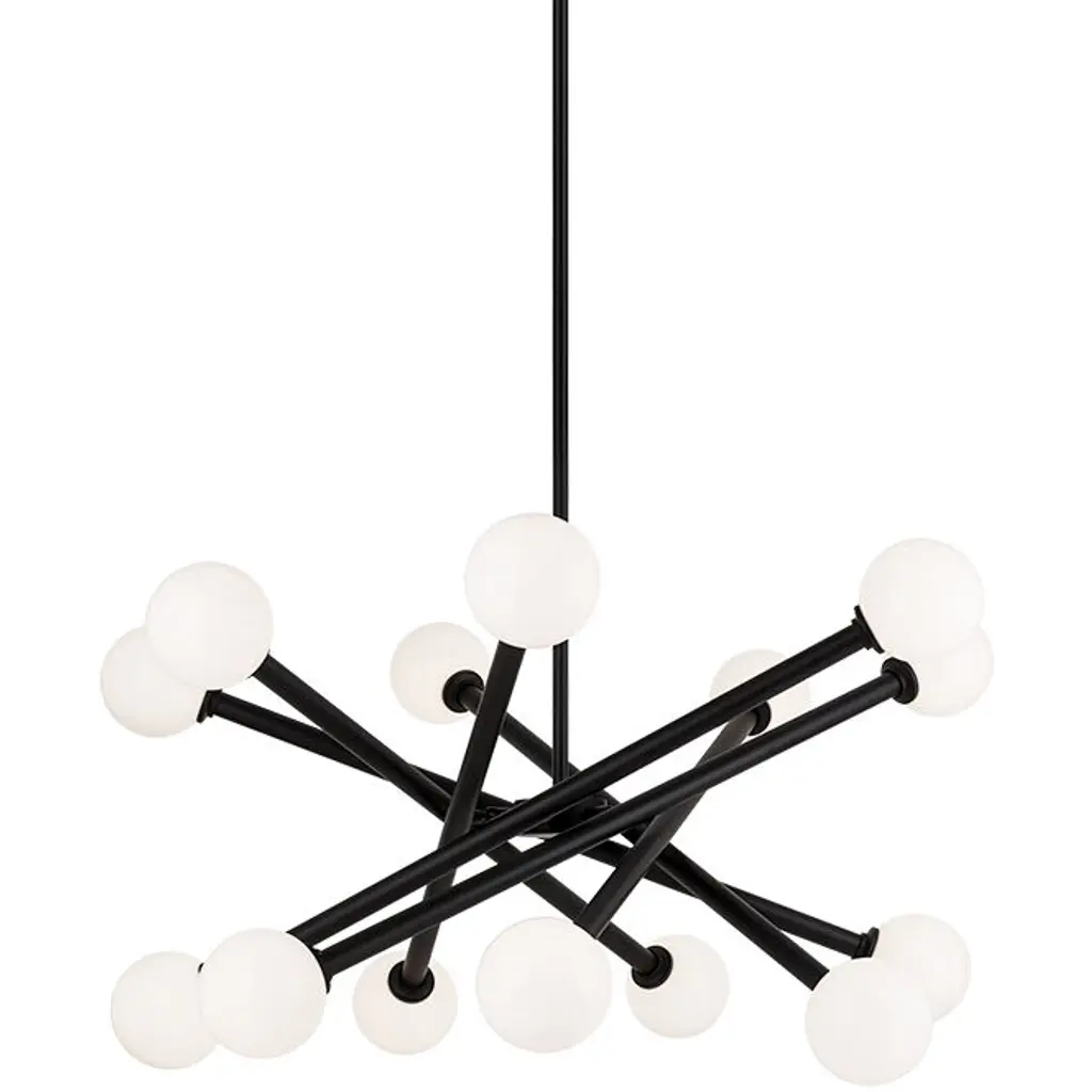 A chaotic constellation of radiant globes seemingly levitate about the center of the Moto geometric structure. Fine intersecting metal arms project the opal glass globes from the gravitational center and allow for positional adjustment during assembly. The contemporary statement piece is available in two sizes.