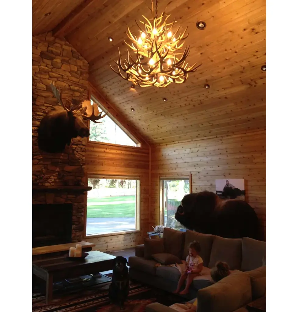Real Antler Double Tier Mule Deer Chandelier (38-42"D x 39-41"H), 12 light sockets, 6 feet of rustic bronze chain.With Rawhide Shades.Handmade in North America using top quality naturally shed real antlers.Sockets are made to resemble real antler, each socket rated up to 60 Watts.Comes balanced and ready to hang.Frosted Bent Tip Candelabra Bulbs included.Certified in U.S & Canada (CSA listed to comply with UL 1598)