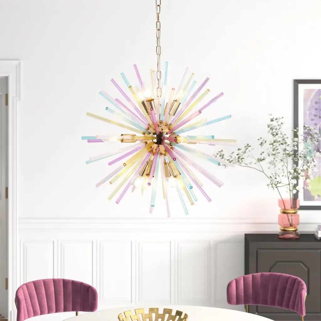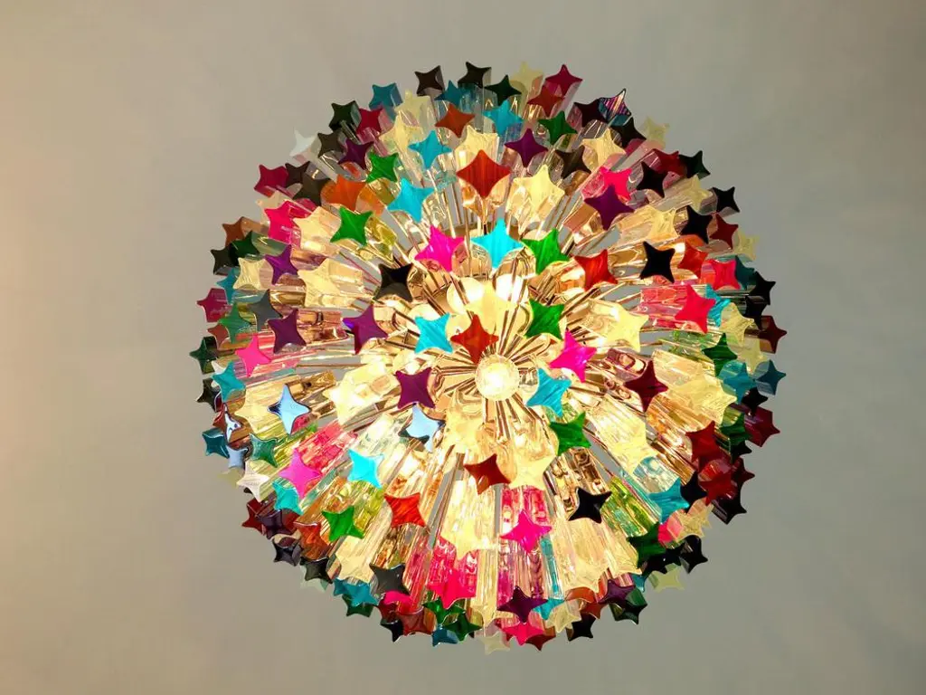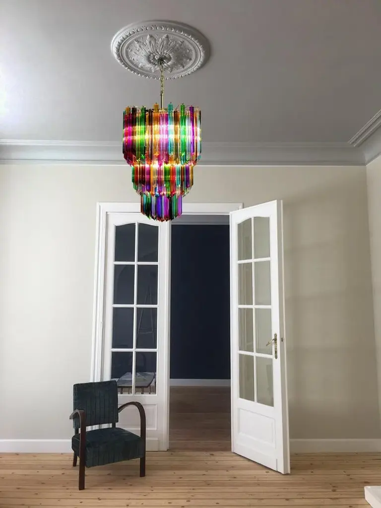 Fantastic vintage Murano chandelier made by 184 Murano crystal multicolored prism (Quadriedri) in a nickel metal frame. The glasses are transparent, blue, smoky, purple, green, yellow and pink. The glasses have two different sizes. Period: 1980s Dimensions: 66.90 inches height (170 cm) with chain; 37.40 inches height (95 cm) without chain; 23.60 inches diameter (60 cm) Dimension glasses: 184 triedri: 11 inches (28 cm) height x 1,20 inches (3 cm) length + 77 triedri: 13.80 inches (35 cm) height x 1.20 inches (3 cm) length - weight of chandelier 50 kg. Light bulbs: 23 lights bulbs (E14 dimension not including); Condition: Perfect condition and fully working. The metal structure has been perfectly restored and is therefore in excellent condition. Up to 250V (Europe/UK Standard).The wiring of this item may be original and might need replacement, if not specified otherwise.