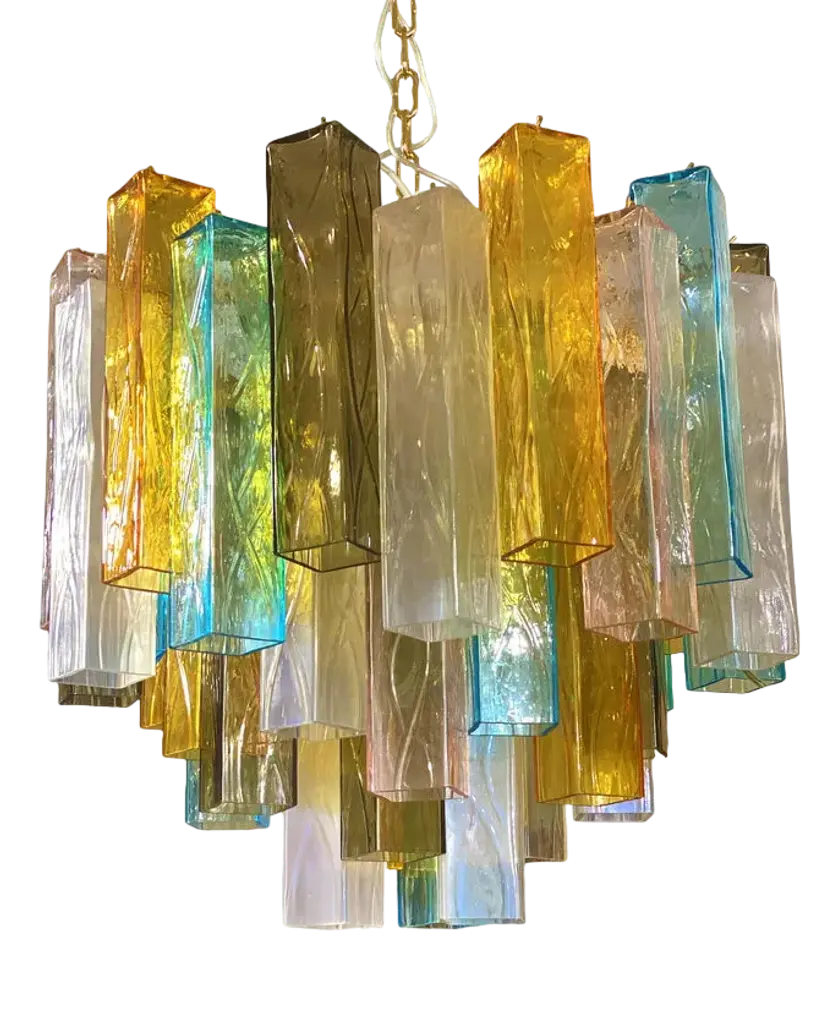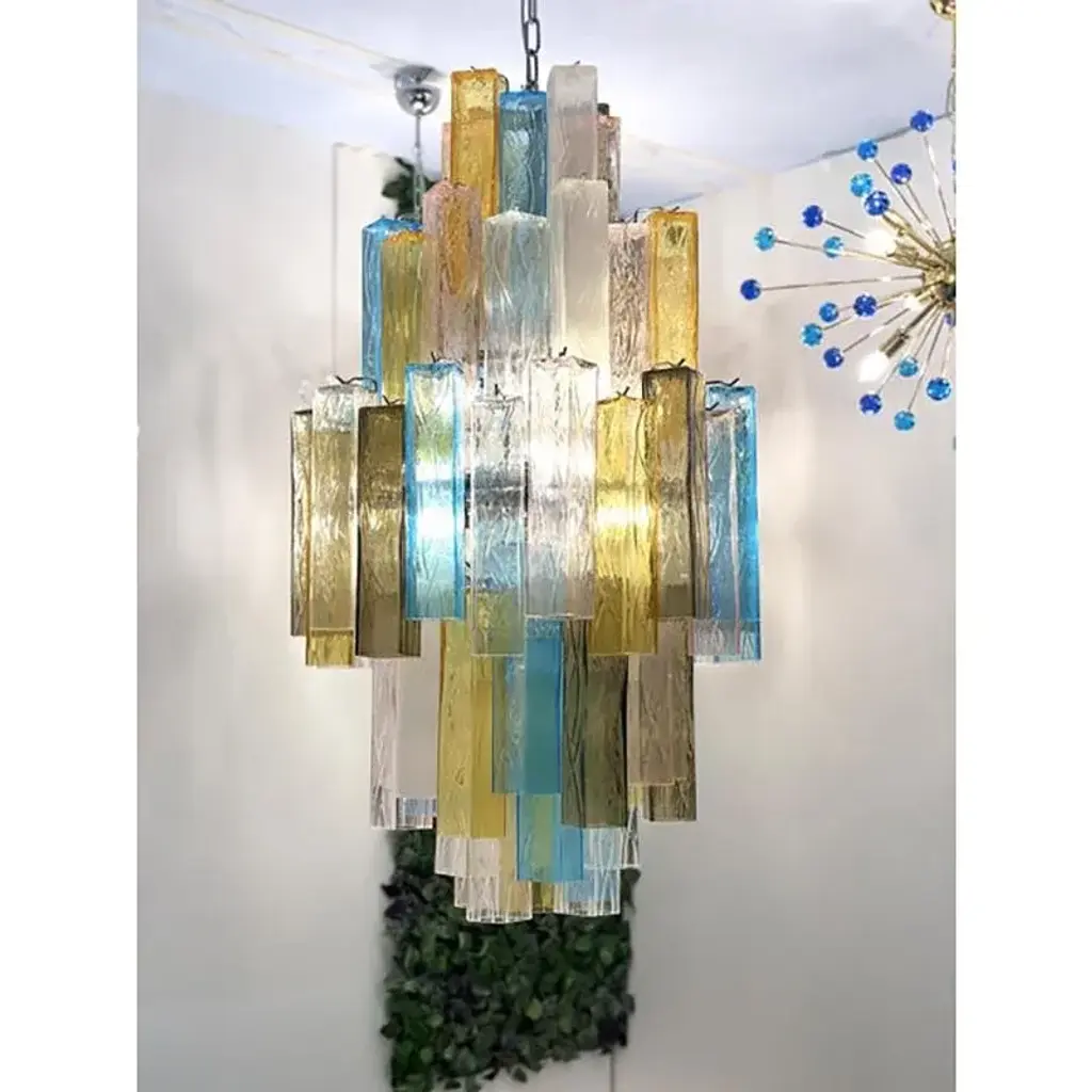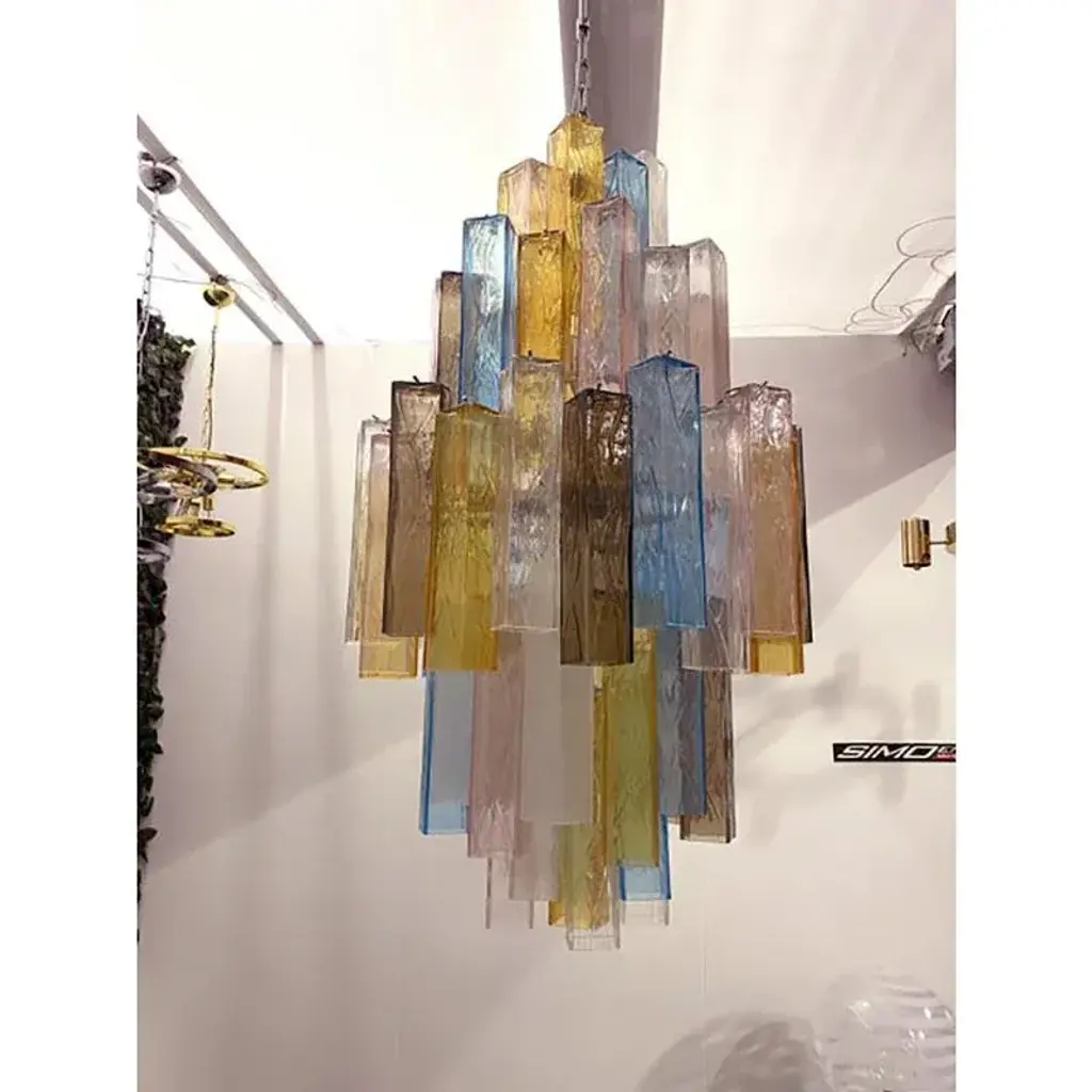 Impressive contemporary chandelier made with murano glass "squared" elements. huge lively multicolor murano glass chandelier. “squared ” are blown inside a wooden mold, into which the hot glass slides. metal frame in chromed plating bath. entirely made in italy, made in murano glass fruit of of high italian know-how. d 60 cm h 110cm/ d 23.6″ h 43.3″ us plug (up to 110v).