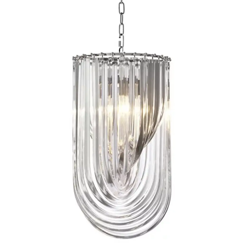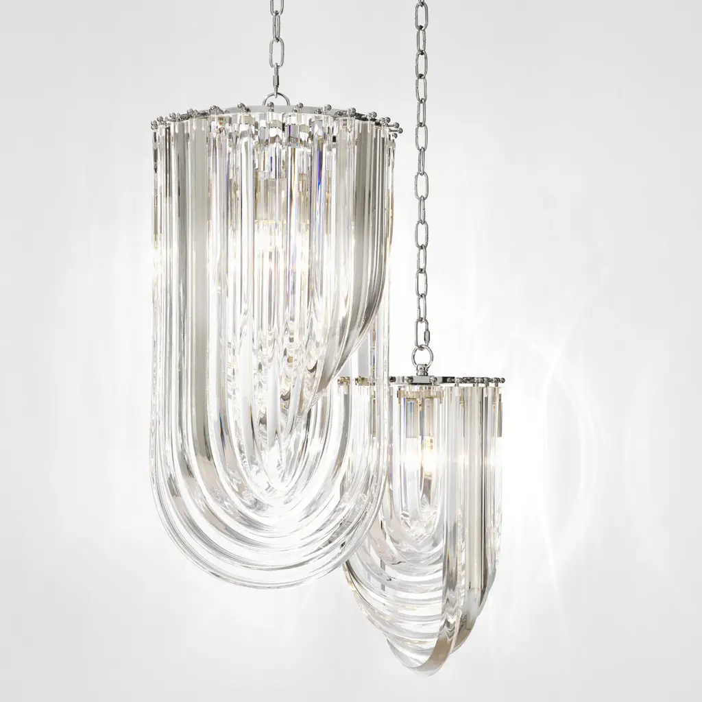 Inject Art Deco glamour into your interior with the nickel finished Murano L Chandelier. This high-class luxury chandelier with a twist features a series of long sculptural acrylic drops which let reflected light sparkle from the internal light fittings. Perfect for adding vintage style to your home.