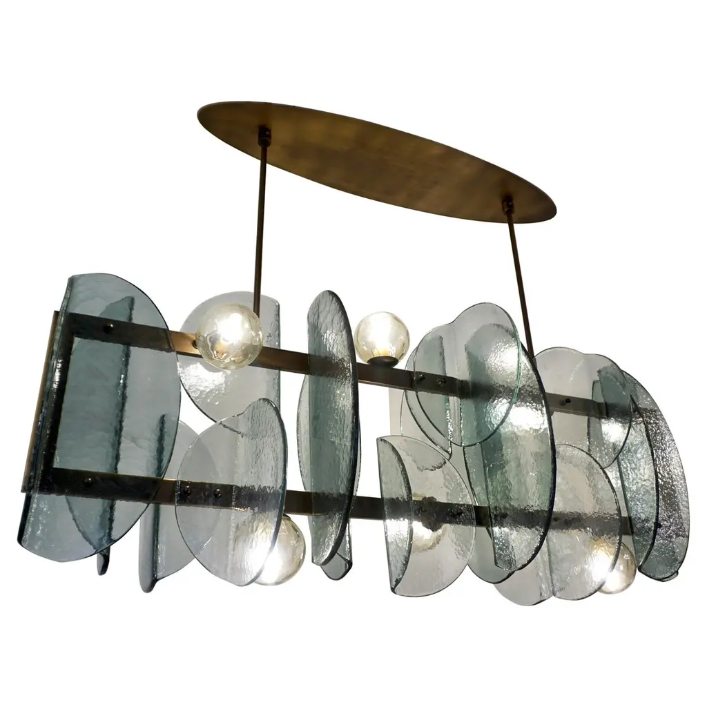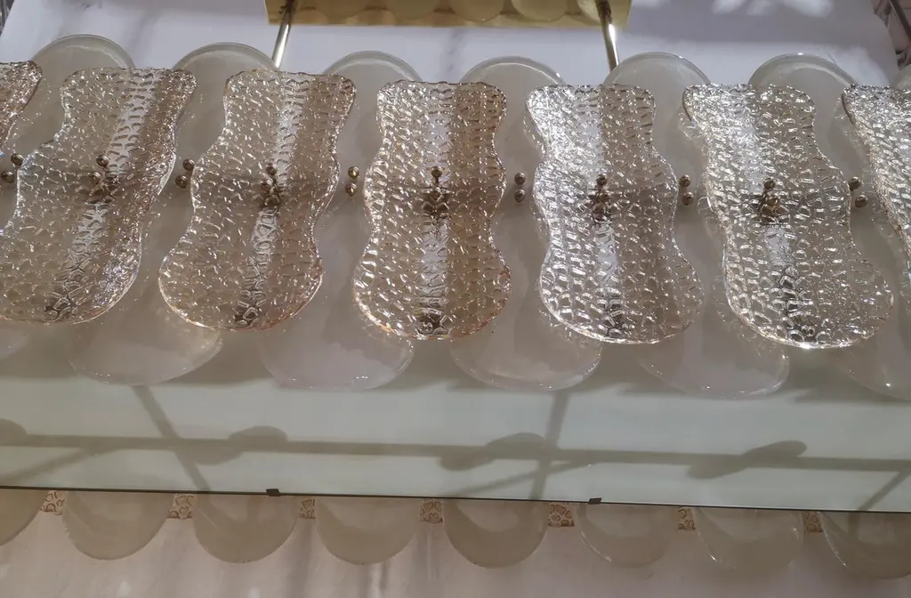 Murano chandelier with an elongated design with a brass structure and unique glass champagne color and sandblasted.All in Murano glass with a brass structure. The glasses are treated with a particular procedure which give them a lively surface. As you can see from the photos, its color is of a beautiful champagne for the glass above while a sandblasted color for the glass below. The chandelier is made up of a double layer of tiles, a larger one below and a smaller one above, all the tiles are fixed with brass screws. The height of the large tile is 40 cm (15.7 inches). Twelve are the interior lights, six above and six below. A very light color tone will not overwhelm your home.