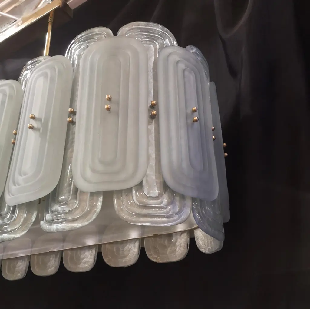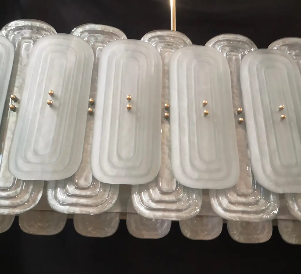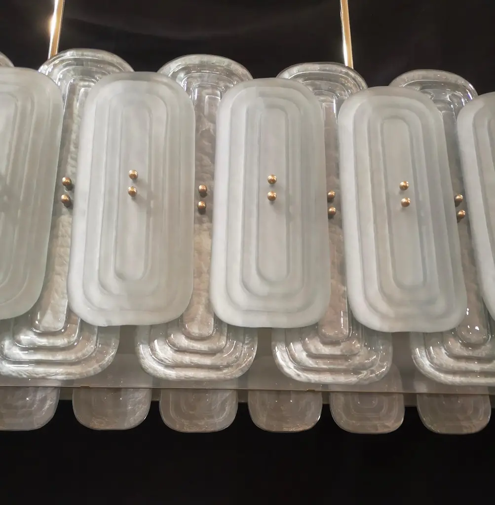 Murano chandelier with an elongated design with a brass structure and unique glass teal color.All in Murano glass with a brass structure. The glasses are treated with a particular procedure which give them a lively surface. As you can see from the photos, its color is of a beautiful teal for all the glasses. The chandelier is made up of a double layer of tiles, a larger one below and a smaller one above, all the tiles are fixed with brass screws. The height of the large tile is 40 cm (15.7 inches). Twelve are the interior lights, six above and six below.