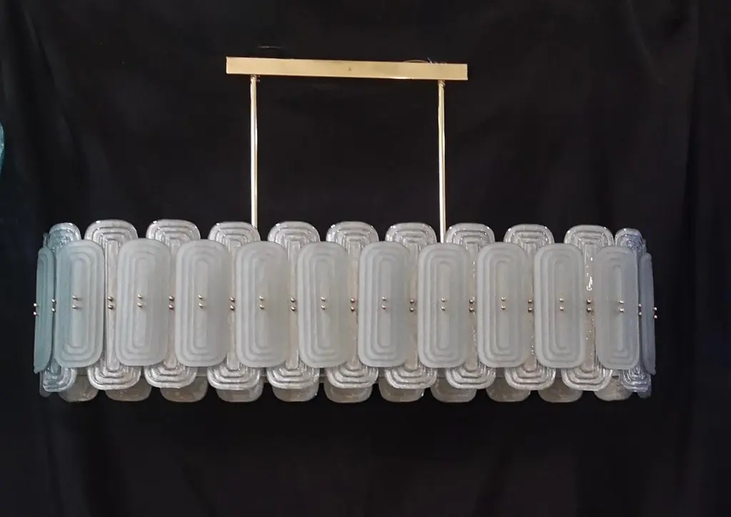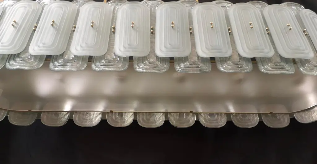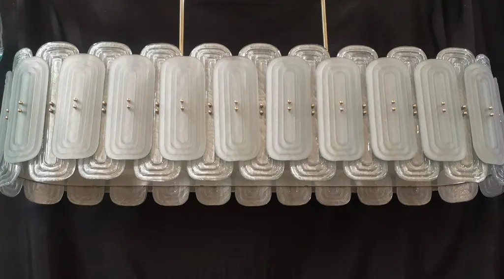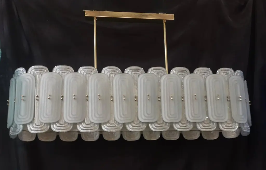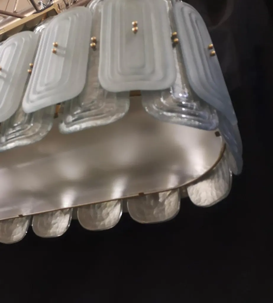 Murano chandelier with an elongated design with a brass structure and unique glass teal color.All in Murano glass with a brass structure. The glasses are treated with a particular procedure which give them a lively surface. As you can see from the photos, its color is of a beautiful teal for all the glasses. The chandelier is made up of a double layer of tiles, a larger one below and a smaller one above, all the tiles are fixed with brass screws. The height of the large tile is 40 cm (15.7 inches). Twelve are the interior lights, six above and six below.