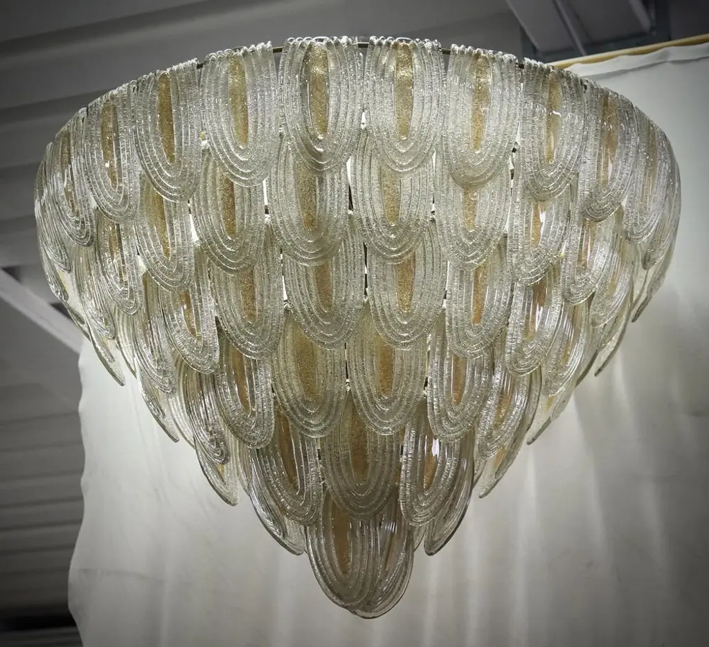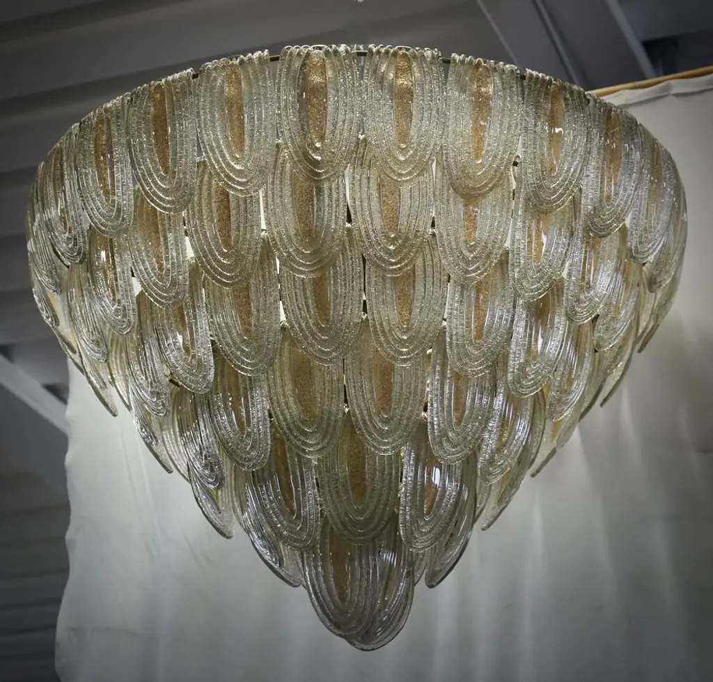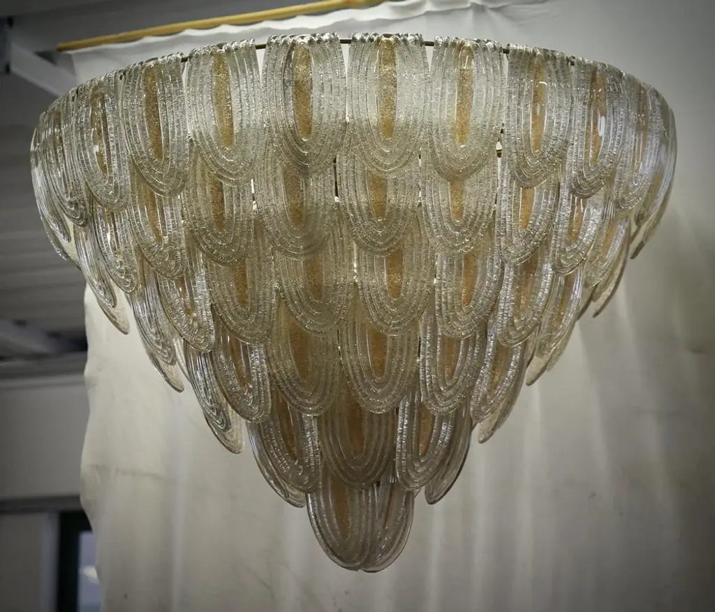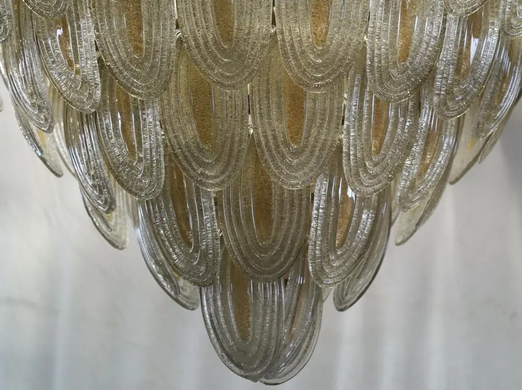 Fantastic Venetian gold and transparent color for a Cascade of Murano leaves. A striking color for this chandelier. All in Murano art glass with gold leaves placed all around. The color of this very Classic Murano chandelier is very light gold with a transparent one. Its construction is made of curved leaves hanging around an iron structure. Its gold color is really guessed for a different and original chandelier from others. A beautiful stain of color above your ceiling will drive anyone crazy into your home. Note the particularity of the processing of the leaf; an oval leaf with a particular folding glass. Refinement and style as it is in the style of Murano, one-of-a-kind pieces that always remain precious. When turned on, the chandelier is very bright having twelve bulbs inside, it will perfectly illuminate your home. European Plug (up to 250V).The wiring of this item may be original and might need replacement, if not specified otherwise.