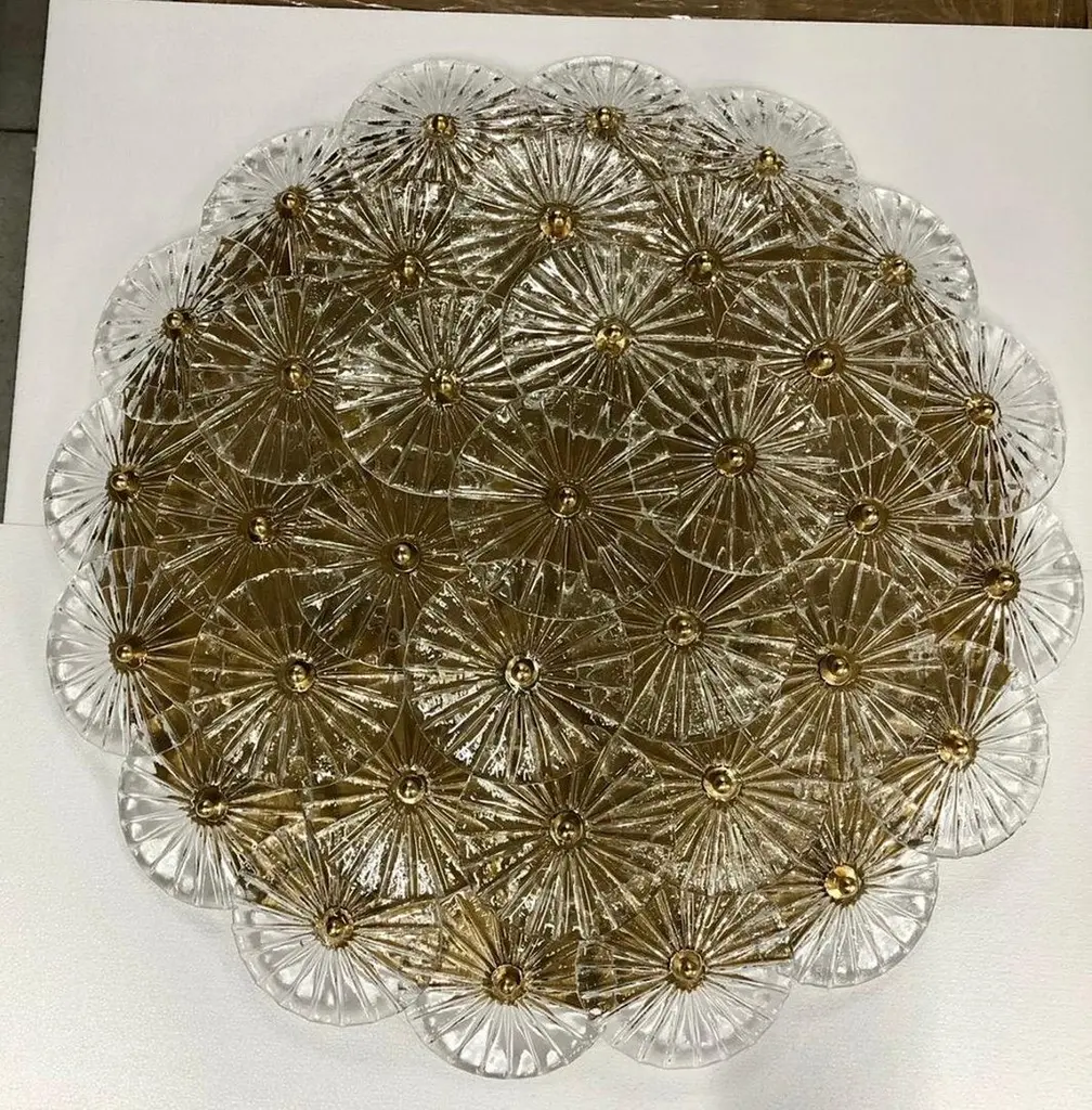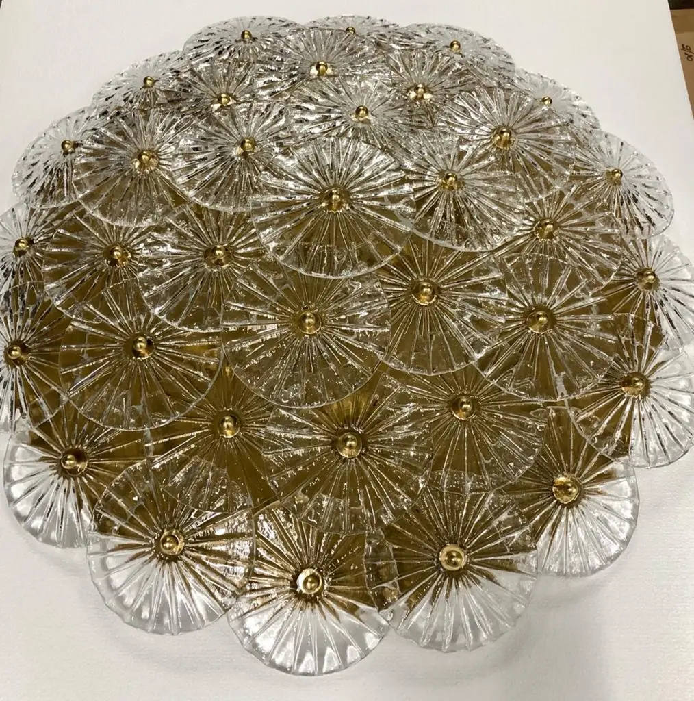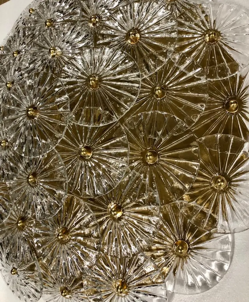 Splendid ceiling light in unique transparent Murano glass, compact and very bright.The ceiling lamp is composed of a metal structure with a round shape in gold color; about 36 glasses of round and transparent section are positioned on this. As you can see from the photos there are 9 bulbs, the chandelier is very bright.
