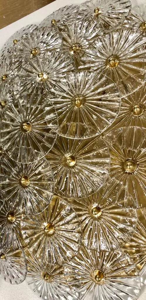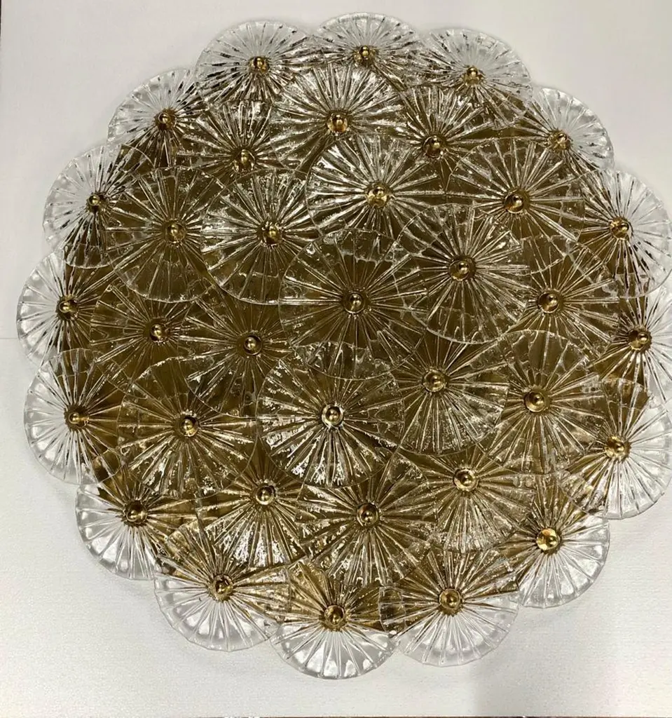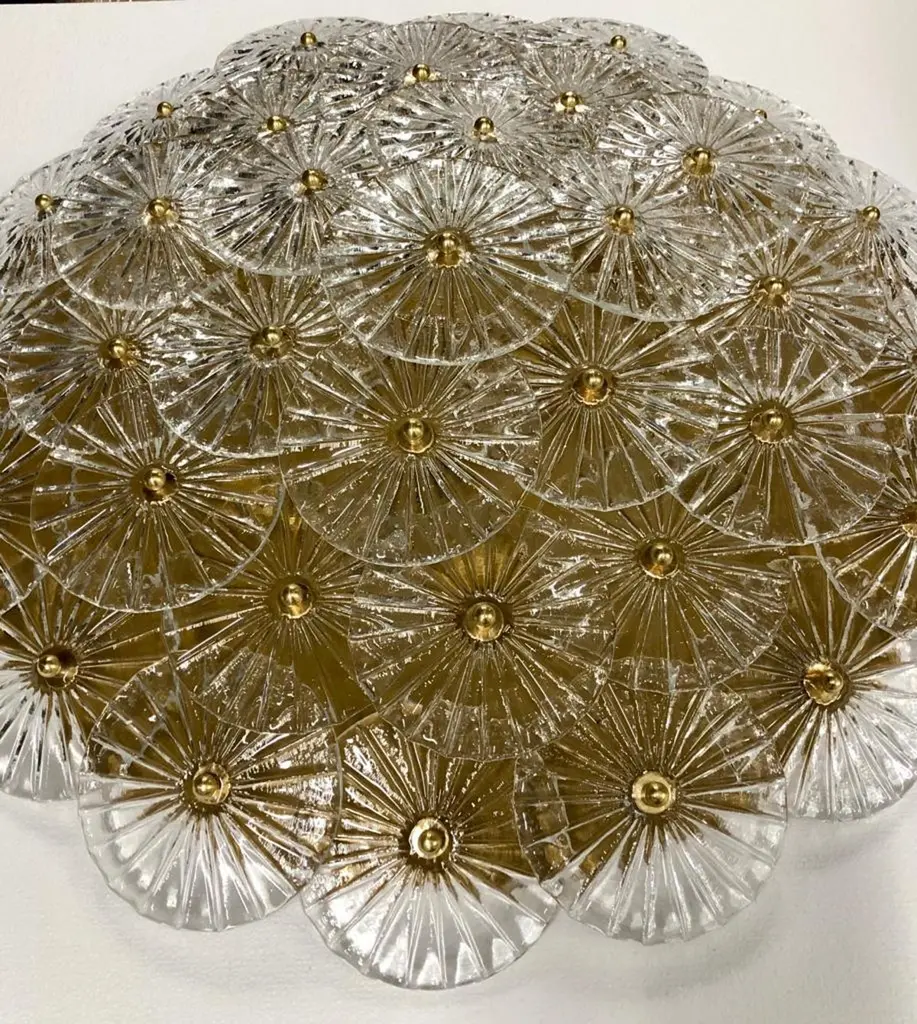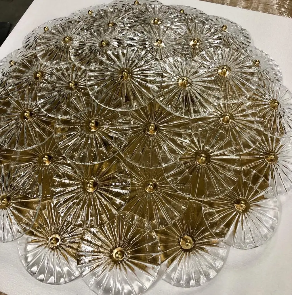 Splendid ceiling light in unique transparent Murano glass, compact and very bright.The ceiling lamp is composed of a metal structure with a round shape in gold color; about 36 glasses of round and transparent section are positioned on this. As you can see from the photos there are 9 bulbs, the chandelier is very bright.
