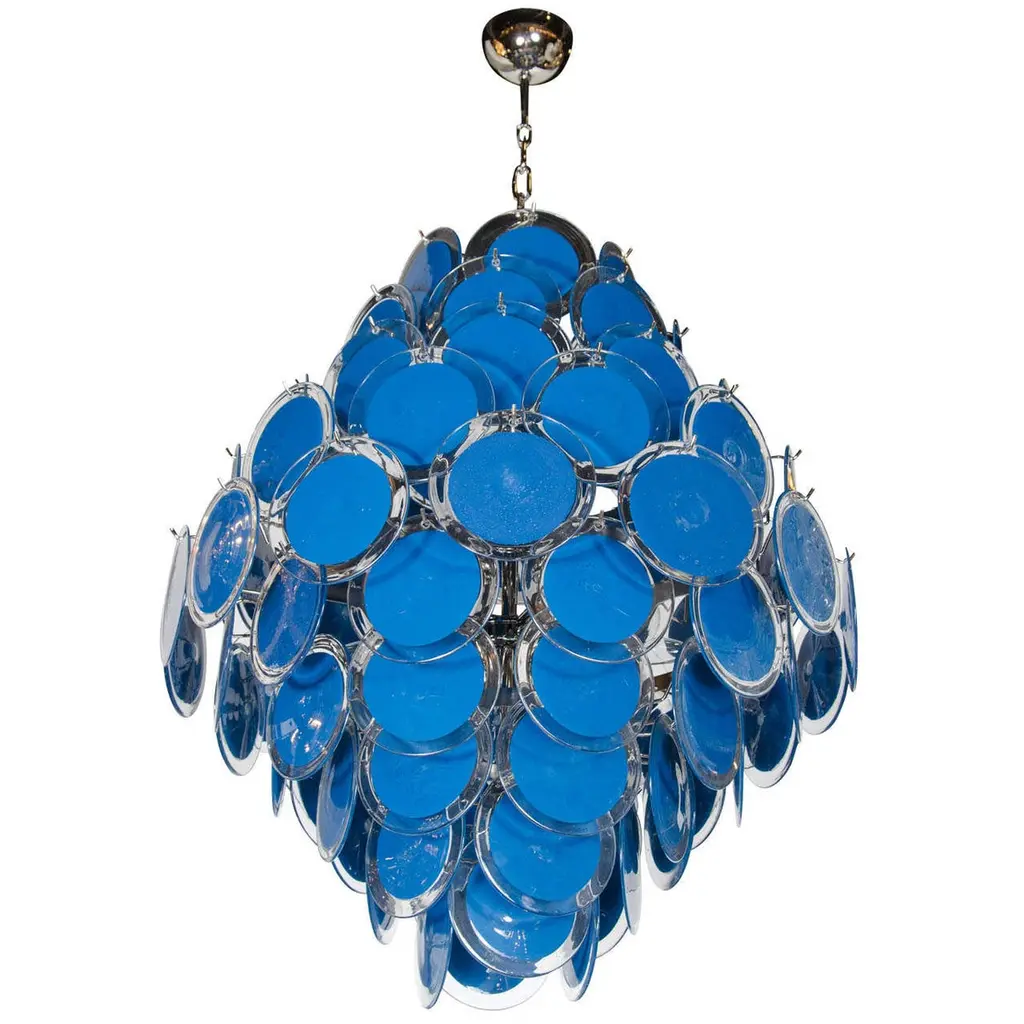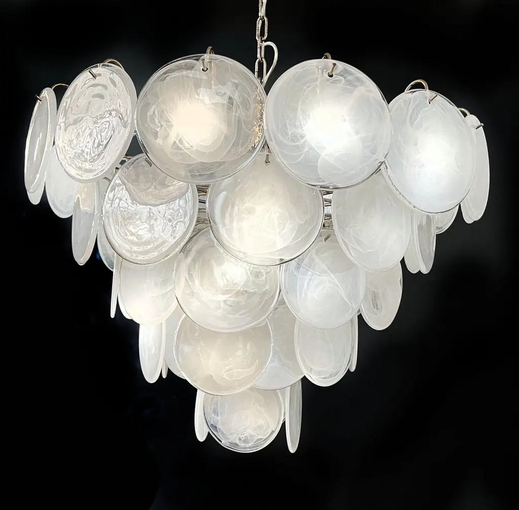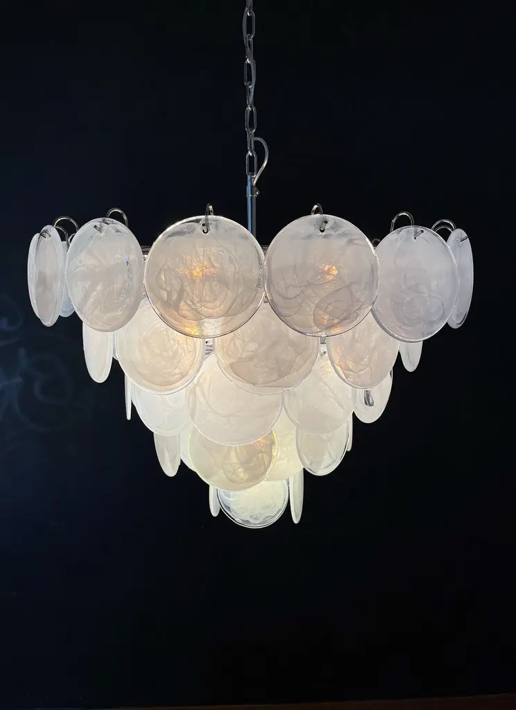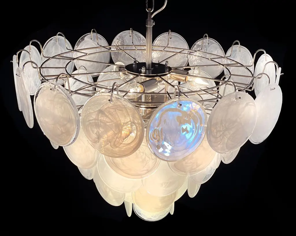 Italian Murano chandelier. The chandelier has 57 Murano white albaster iridescent glass disks. The glasses are now unavailable, they have the particularity of reflecting a multiplicity of colors, which makes the chandelier a true work of art. Nickel metal frame. Period:1980'SDimensions: 48,80 inches (126 cm) height with chain; 25,60 inches (65 cm) height without chain; about 27,50 inches (70 cm) diameter.Dimension glasses: about 5,90 inches (15 cm) diameterLight bulbs:10 light bulbs : 9 light bulb E14 dimension (not included in the sale) + 1 light bulb: E27 dimension (not included inthe sale) - - On request we can replace the lampholders with those suitable for the American electrical system.Condion:Glass in excellent condition. The structure has classical signs due to the passage of time, overall in perfect condition