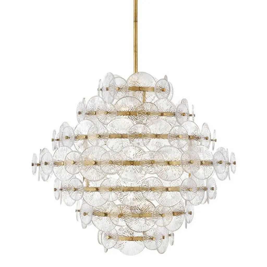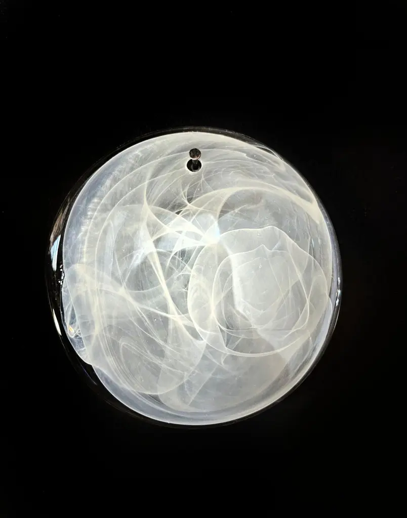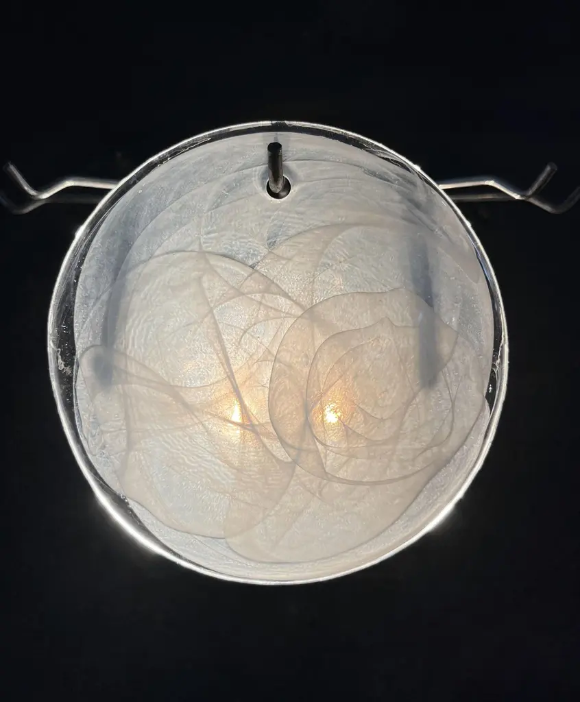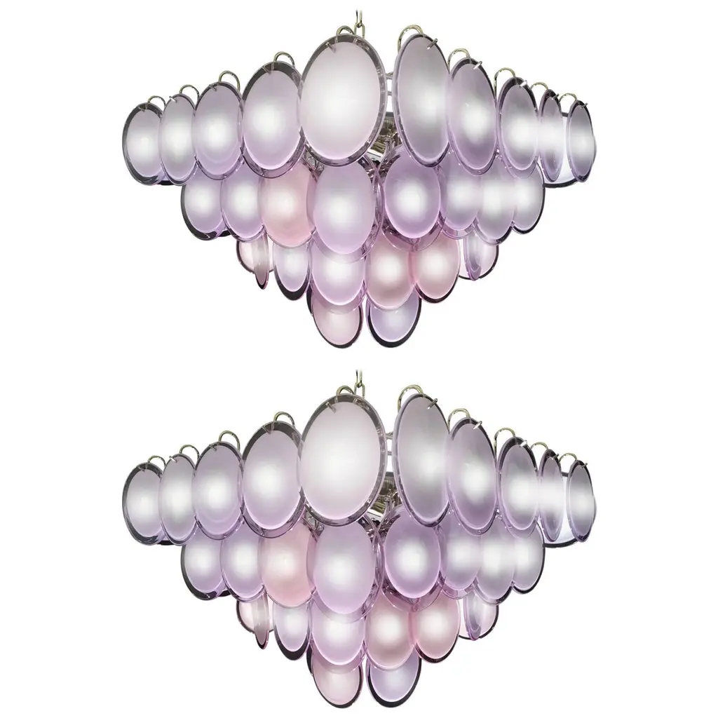 Italian Murano chandelier. The chandelier has 57 Murano white albaster iridescent glass disks. The glasses are now unavailable, they have the particularity of reflecting a multiplicity of colors, which makes the chandelier a true work of art. Nickel metal frame. Period:1980'SDimensions: 48,80 inches (126 cm) height with chain; 25,60 inches (65 cm) height without chain; about 27,50 inches (70 cm) diameter.Dimension glasses: about 5,90 inches (15 cm) diameterLight bulbs:10 light bulbs : 9 light bulb E14 dimension (not included in the sale) + 1 light bulb: E27 dimension (not included inthe sale) - - On request we can replace the lampholders with those suitable for the American electrical system.Condion:Glass in excellent condition. The structure has classical signs due to the passage of time, overall in perfect condition