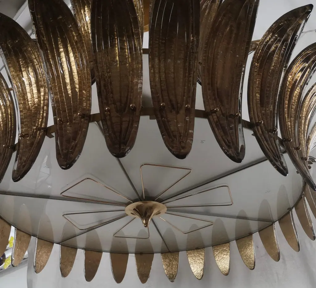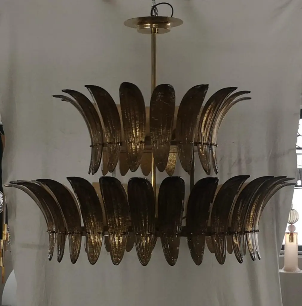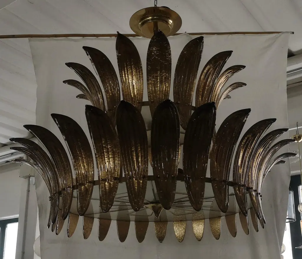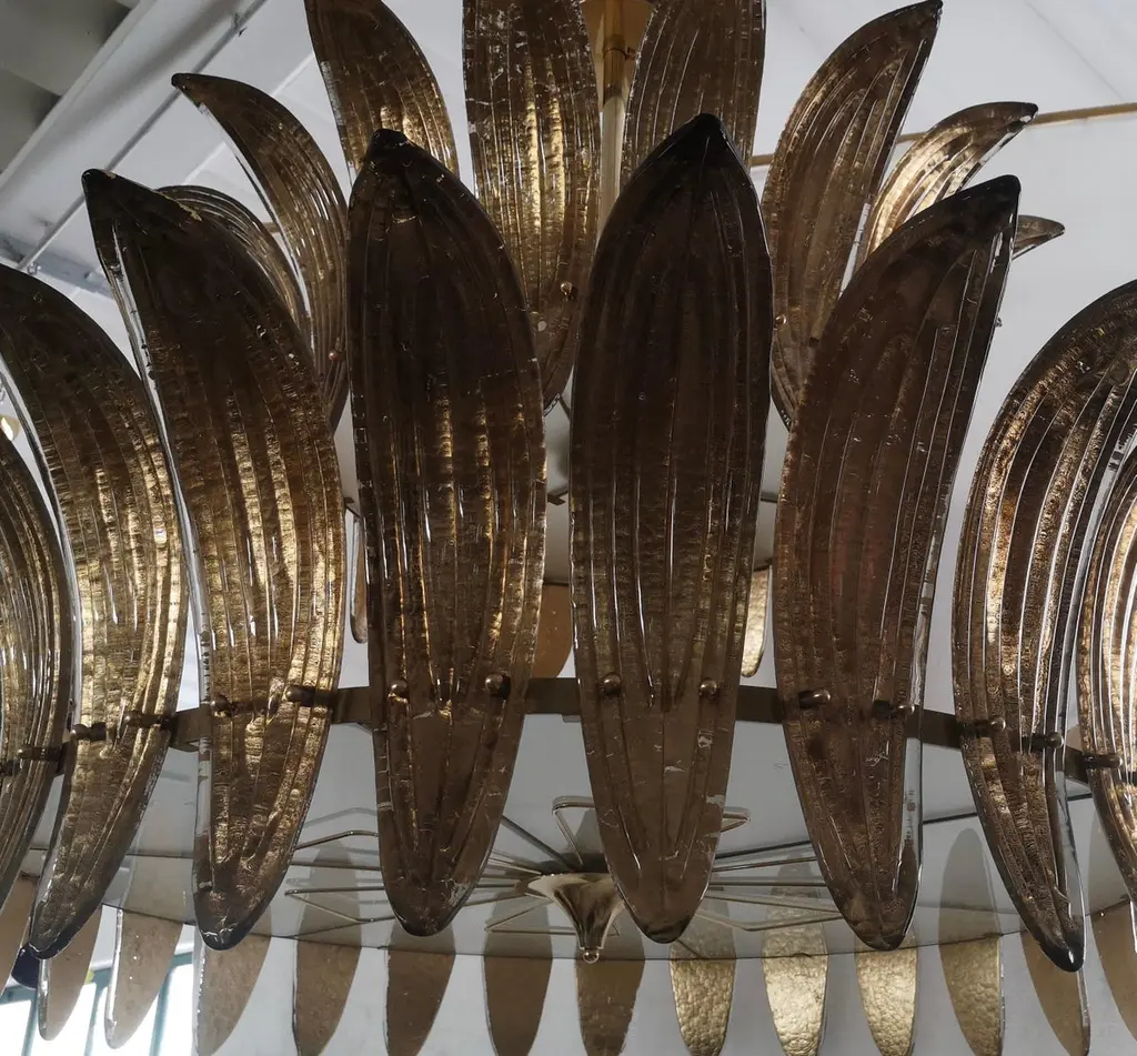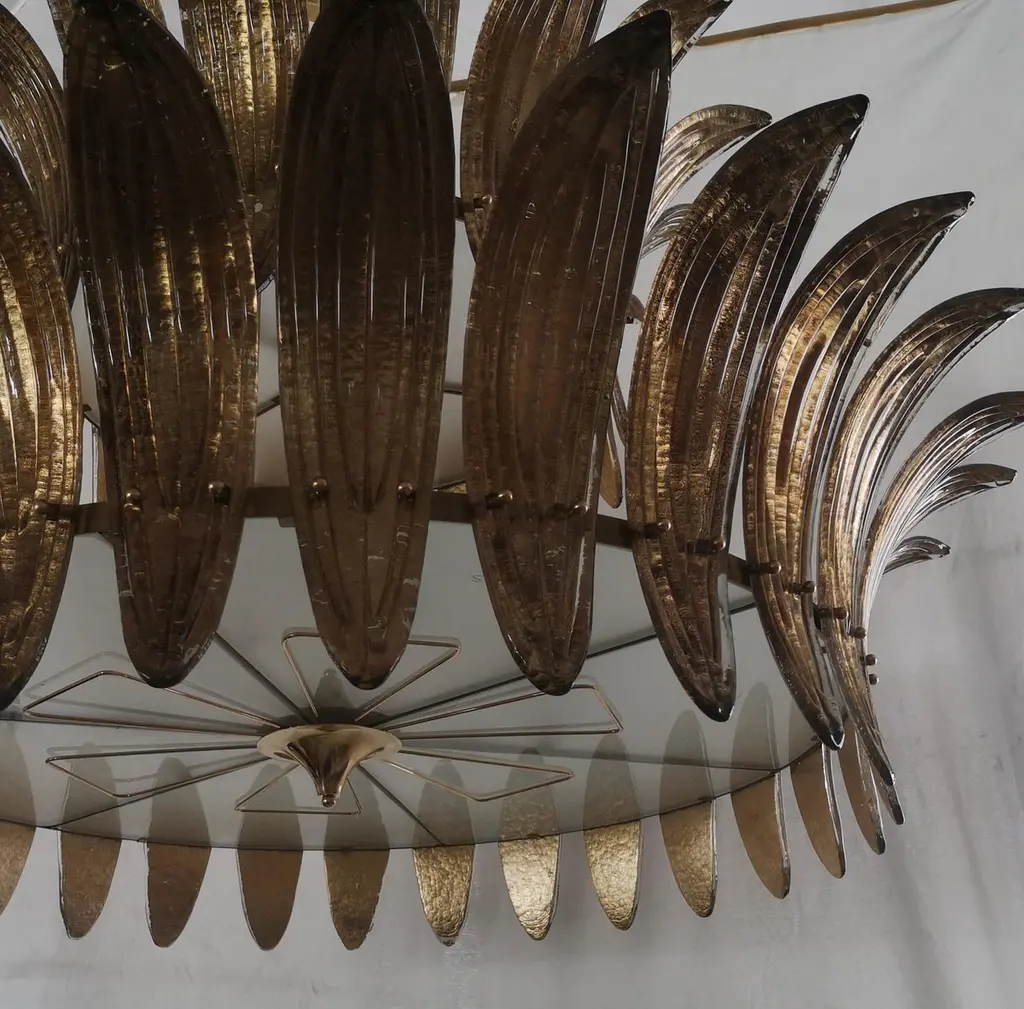Riot of leaves, from an elegant bronze color. Very nice, rich and original design.Gold iron and brass structure with all around the leaves in Murano glass, of bronze color. The leaf has a curved structure, and an elongated shape. The leaves in iridescent bronze color. Thus, the chandelier takes the form of a cascade of leaves; starting from the top it is as if they were two chandeliers one inside the other; a smaller one at the top inserted into a larger chandelier at the bottom. There are two concentric circles; starting with the smallest one from the top and arriving at the largest second at the bottom. The chandelier on is very bright, internally it has 9 lights. Refinement and style as it is in the style of Murano, one-of-a-kind pieces that always remain precious.