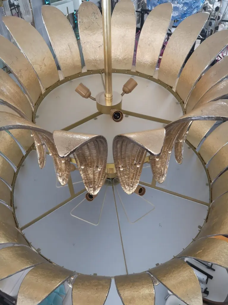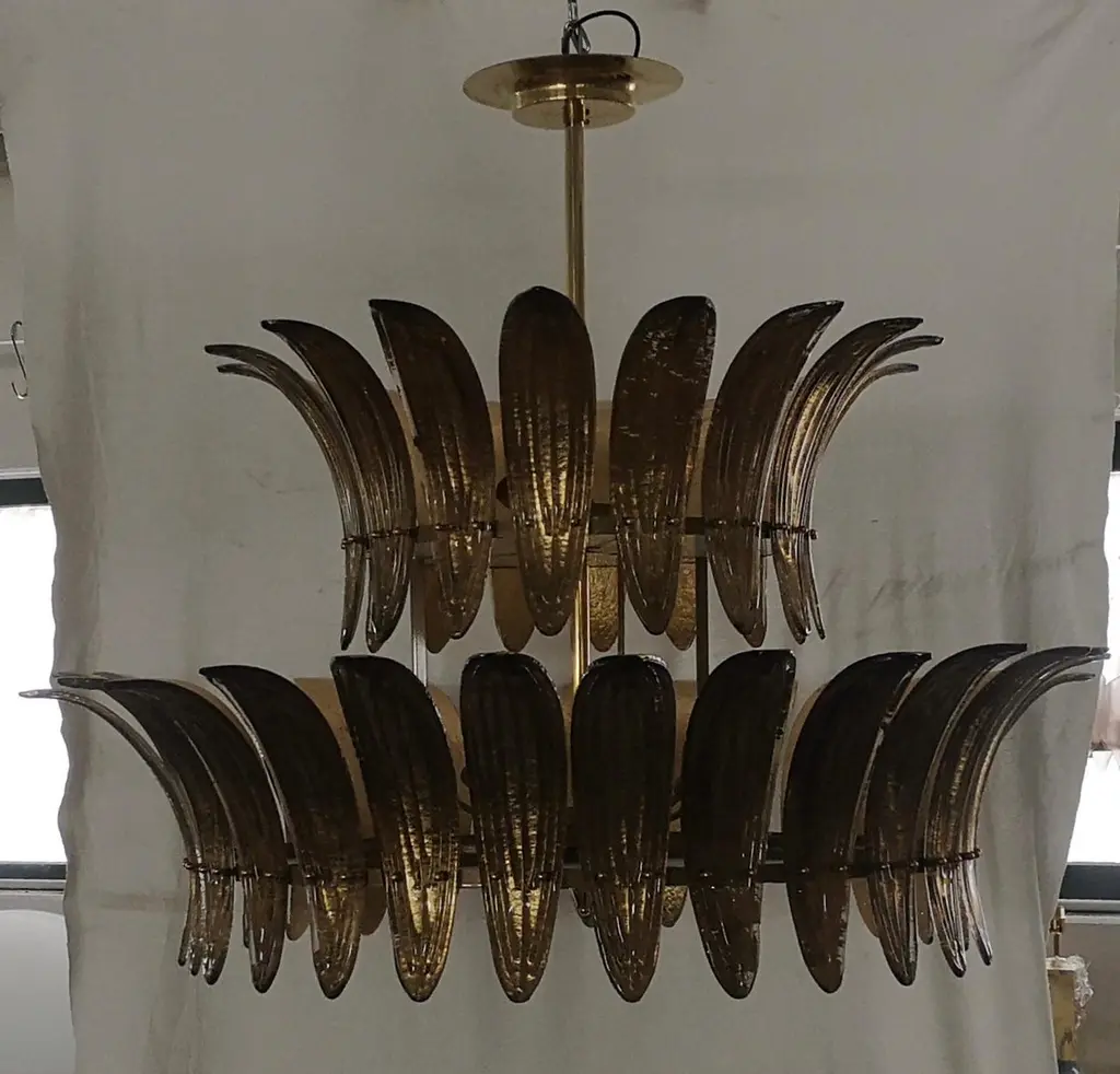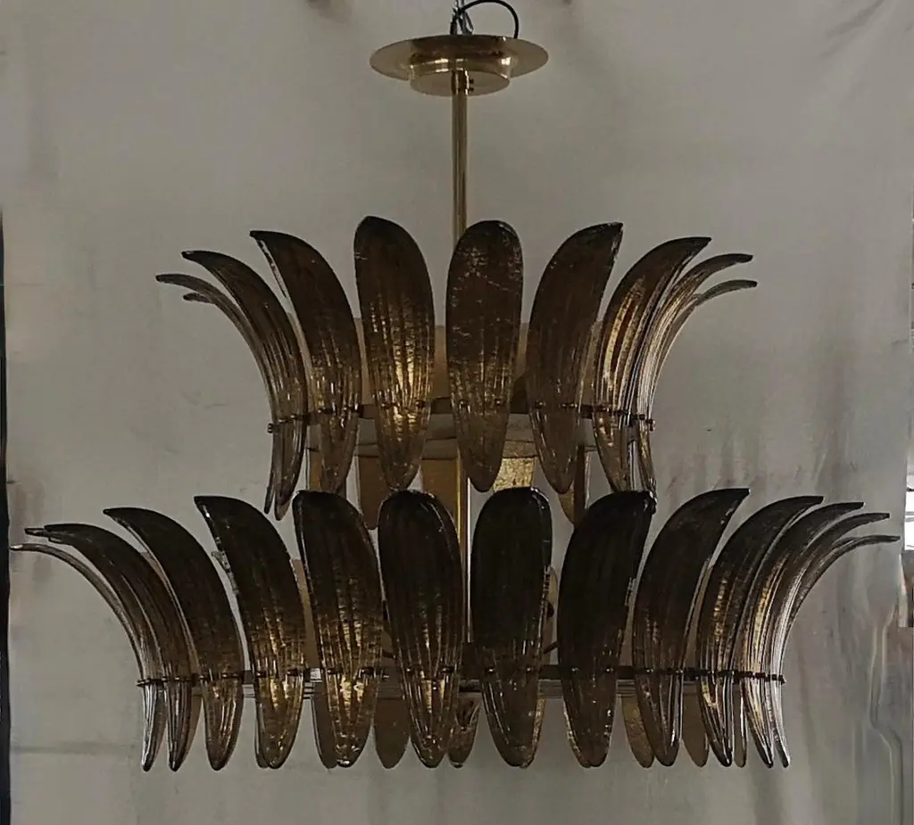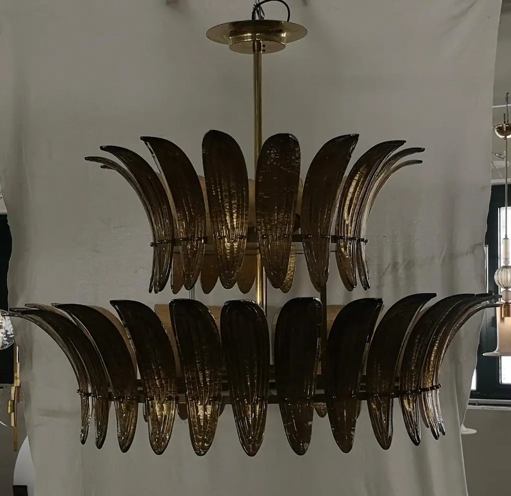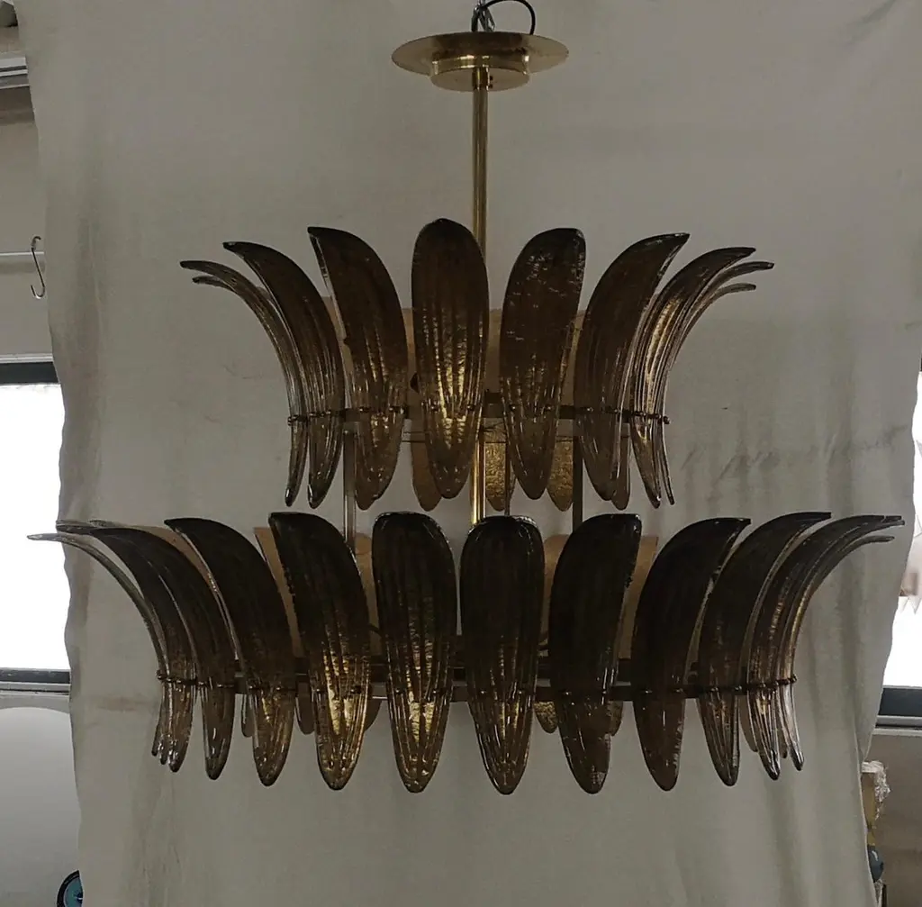 Riot of leaves, from an elegant bronze color. Very nice, rich and original design.Gold iron and brass structure with all around the leaves in Murano glass, of bronze color. The leaf has a curved structure, and an elongated shape. The leaves in iridescent bronze color. Thus, the chandelier takes the form of a cascade of leaves; starting from the top it is as if they were two chandeliers one inside the other; a smaller one at the top inserted into a larger chandelier at the bottom. There are two concentric circles; starting with the smallest one from the top and arriving at the largest second at the bottom. The chandelier on is very bright, internally it has 9 lights. Refinement and style as it is in the style of Murano, one-of-a-kind pieces that always remain precious.