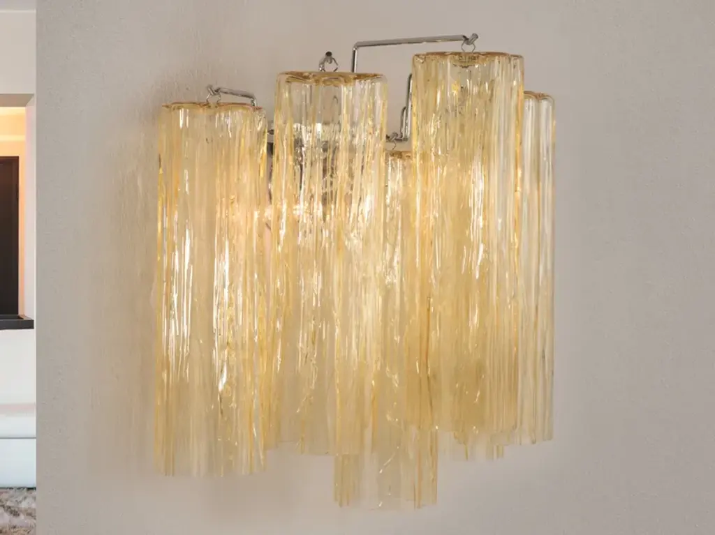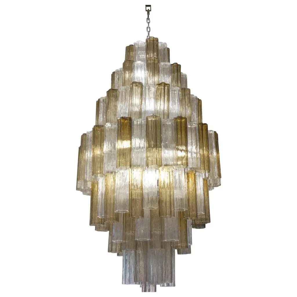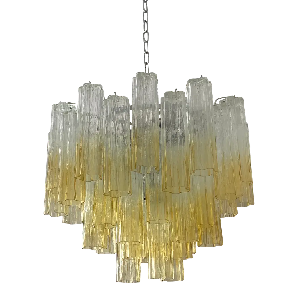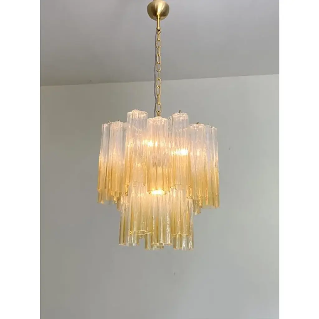 Contemporary murano glass “tronchi” chandelier whit an exclusive brushed-gold 24k metal frame. very rare light amber color tronchi murano glass. tronchi made in murano glass in vanished clear amber .all made in italy tronchi”are blown inside a wooden mold, into which the hot glass slides. Entirely made in italy, fruit of murano glass of high italian know-how in venini style. spare parts are included. All ship from italy bulbs not included, they are compatible with led sustainability. chain 19.7″ more canopy very bright and elegant chandelier. dimensions(cm/in): d 50 cm h 40cm/ d 17.7″ h 15.7″ finiture: gold 24k metal frame. chain 50 cm more ceiling metal cup = 19.7″ up to 250v (europe/uk standard).