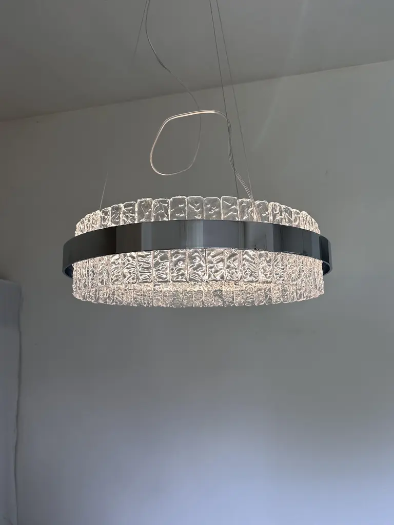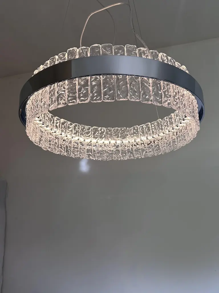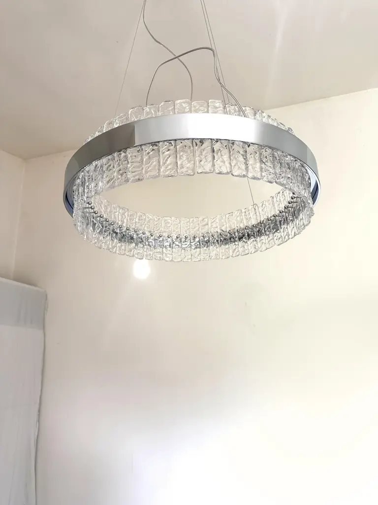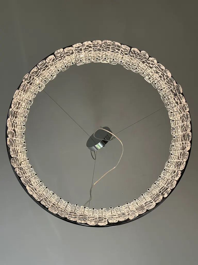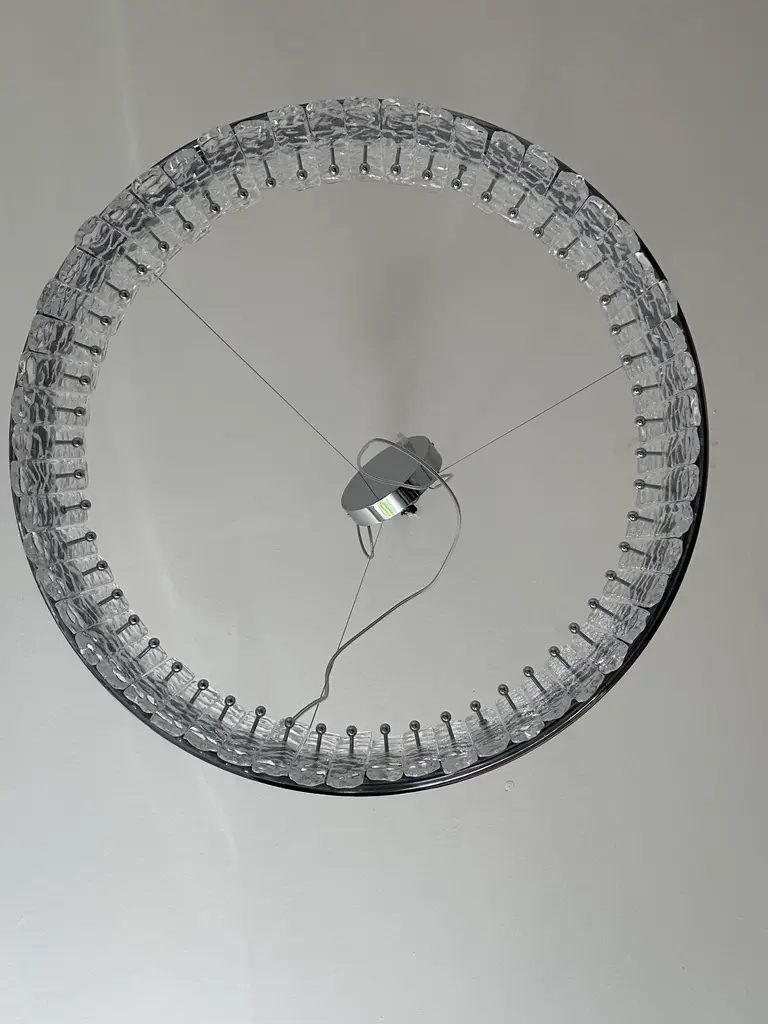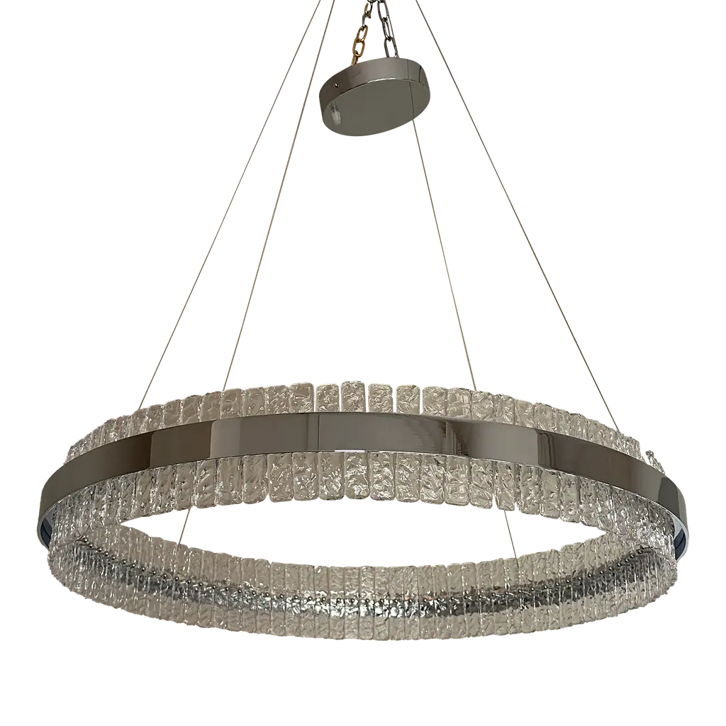 Contemporary polished kromo ring chandelier with hammered clear "Ice" Murano glass With Strip Led. The " ice" element in Murano glass is pinced one to one by hand, every element is different from another one. Canopy on ceiling, stell cable height 100cm /39.3". It can be custom height. A piece of hight italian handcraftmanship of Murano glass. Exclusive design By Simoeng. Diameter 60cm/D.23.6" Height only chandelier glass 15cm/5.90" No bulbs ma LED.Spare parts are included. ship not assembly in a strong wooden case box from ITALY LED for Europe .... ask me for USA led wiring in some weeks