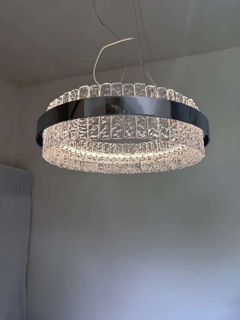 Murano Glass "Ice" Chandelier Hammered Clear Glass In Polish Kromo Ring With Strip Led