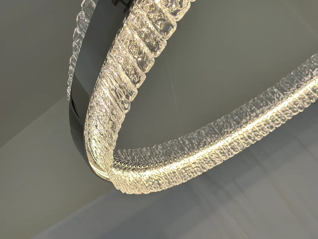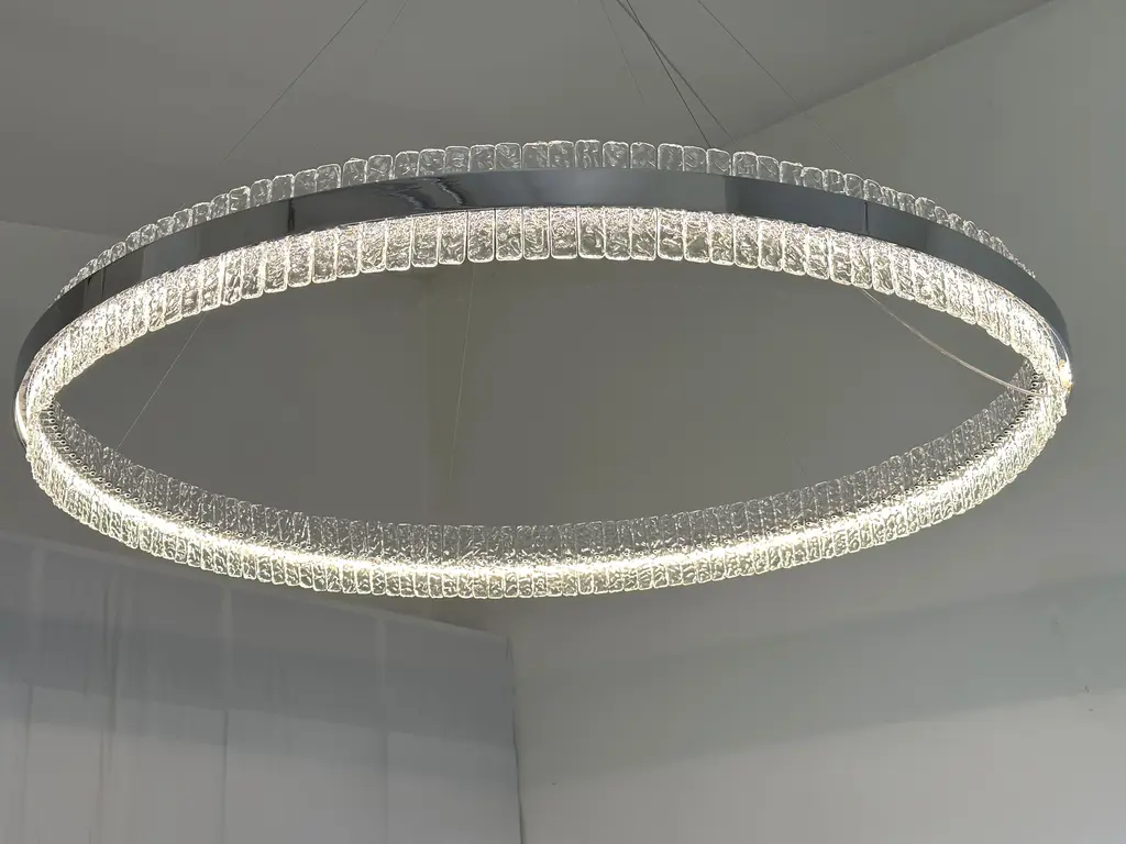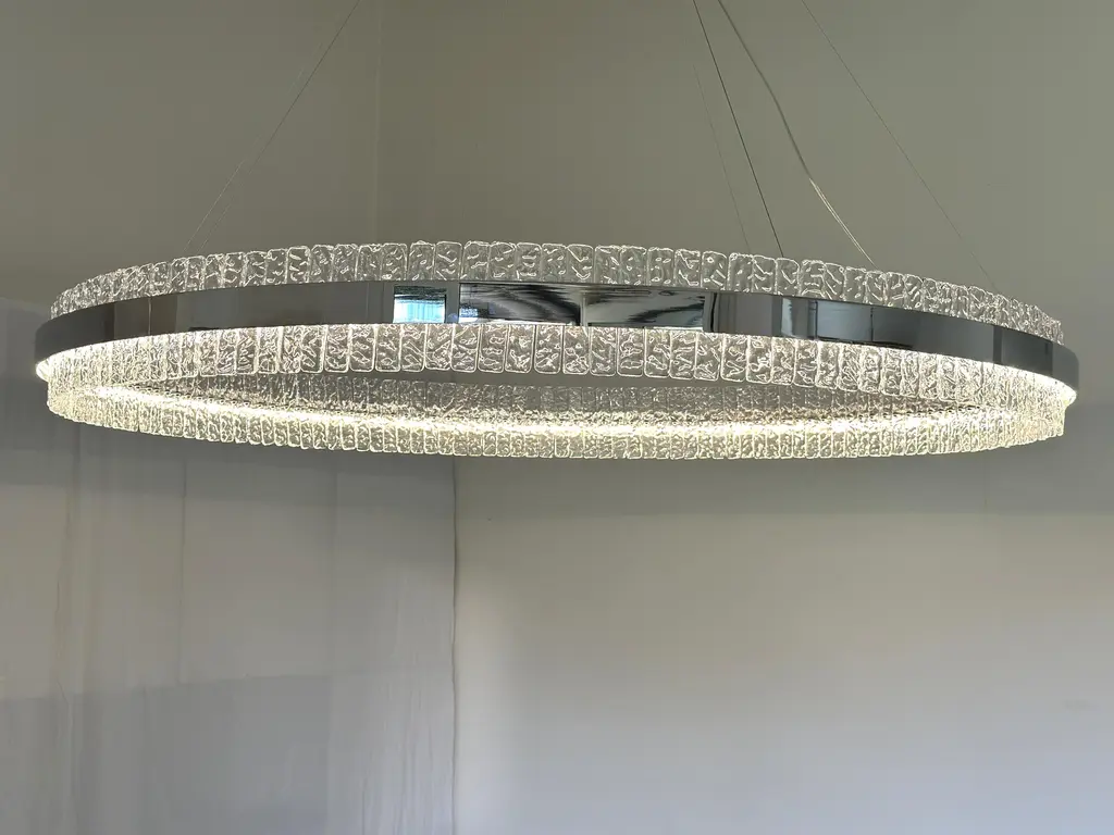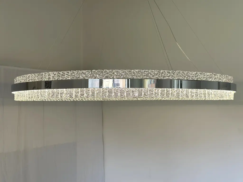Stunning polished kromo ring chandelier with hammered clear "Ice" Murano glass With Strip Led. The " ice" element in Murano glass is pinced one to one by hand, every element is different from another one. Canopy on ceiling, stell cable height 100cm /39.3". It can be custom height. A piece of hight italian handcraftmanship of Murano glass.Exclusive design By Simoeng. Diameter 160cm/D.63" Height only chandelier glass 15cm/5.90" No bulbs ma LED.Spare parts are included. ship not assembly in a strong wooden case box from ITALY LED for Europe .... ask me for USA led wiring in some weeks