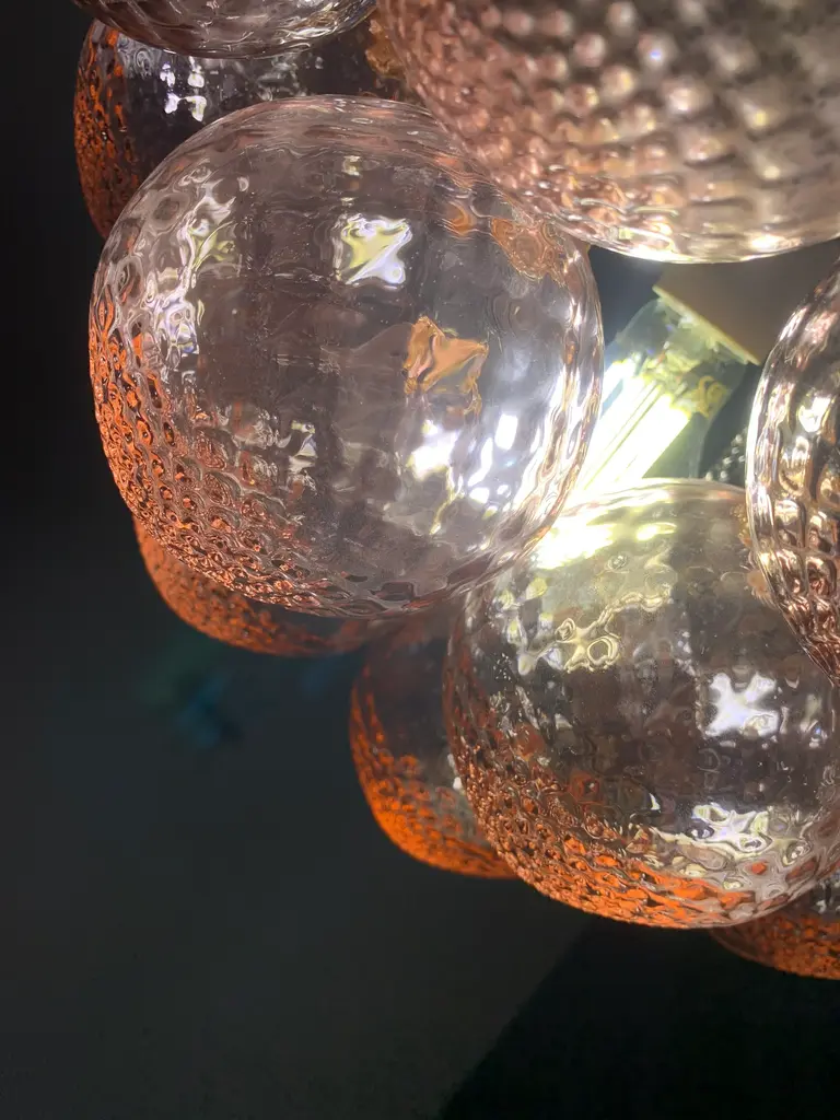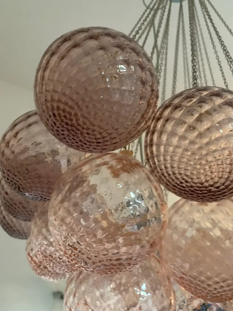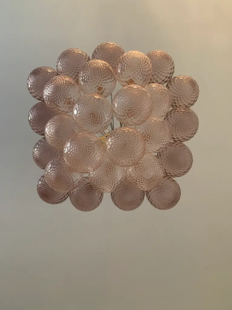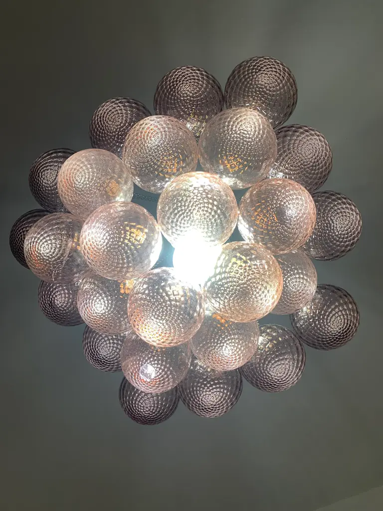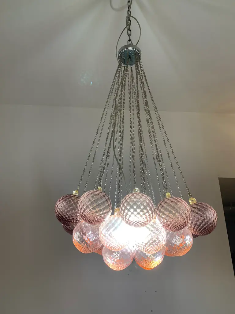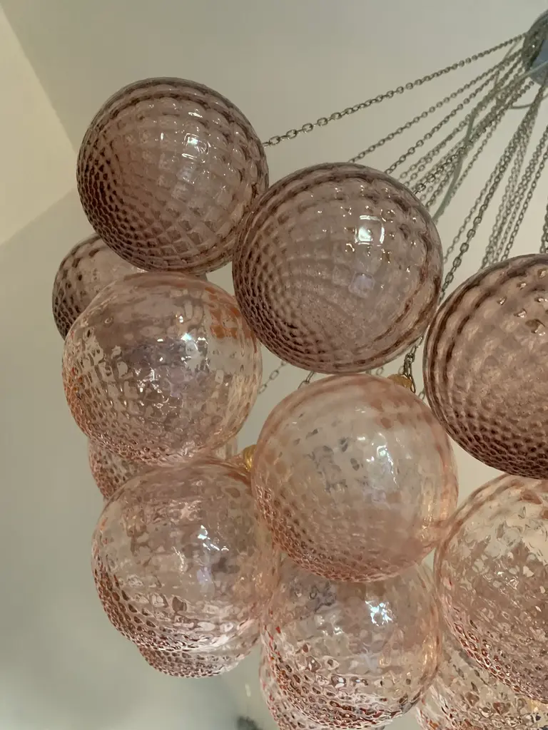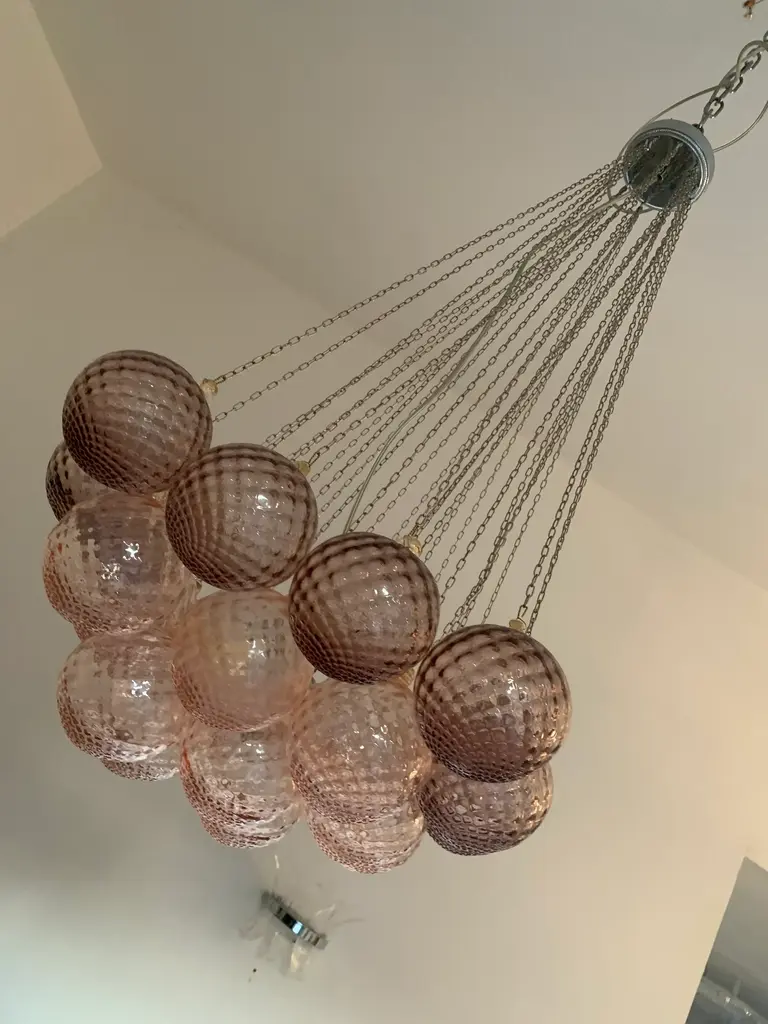 Impressive Murano Glass Sputnik Chandelier like mazzega zuccheri venini barovier style Diameter 60 cm = 23.6” Height 100 cm = 39.7” Murano glass pink and violet color ....are not painted ....are in true color !!!!! very hard to made All spheres are hanmade blow so will be little bit different one by one ....top colors Metal frame kromo 1 bulb (bulb not included) Spare parts murano glass included Ship from Italy and the sputnik murano glass is wire for USA