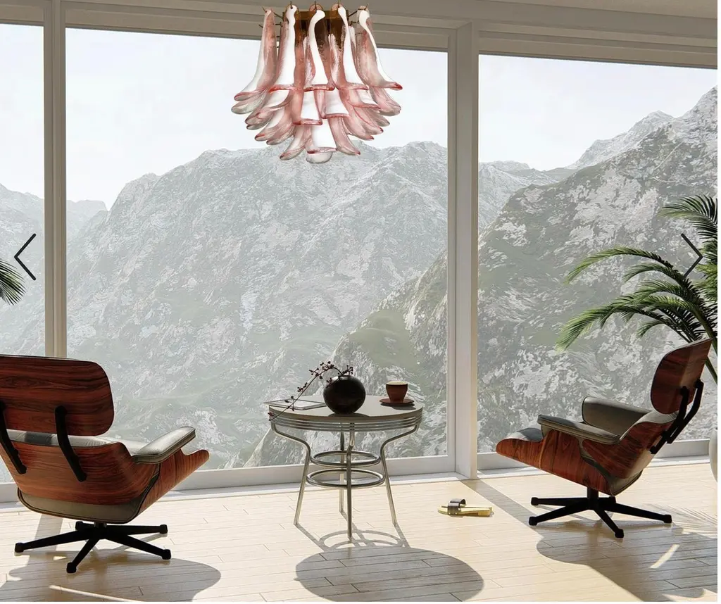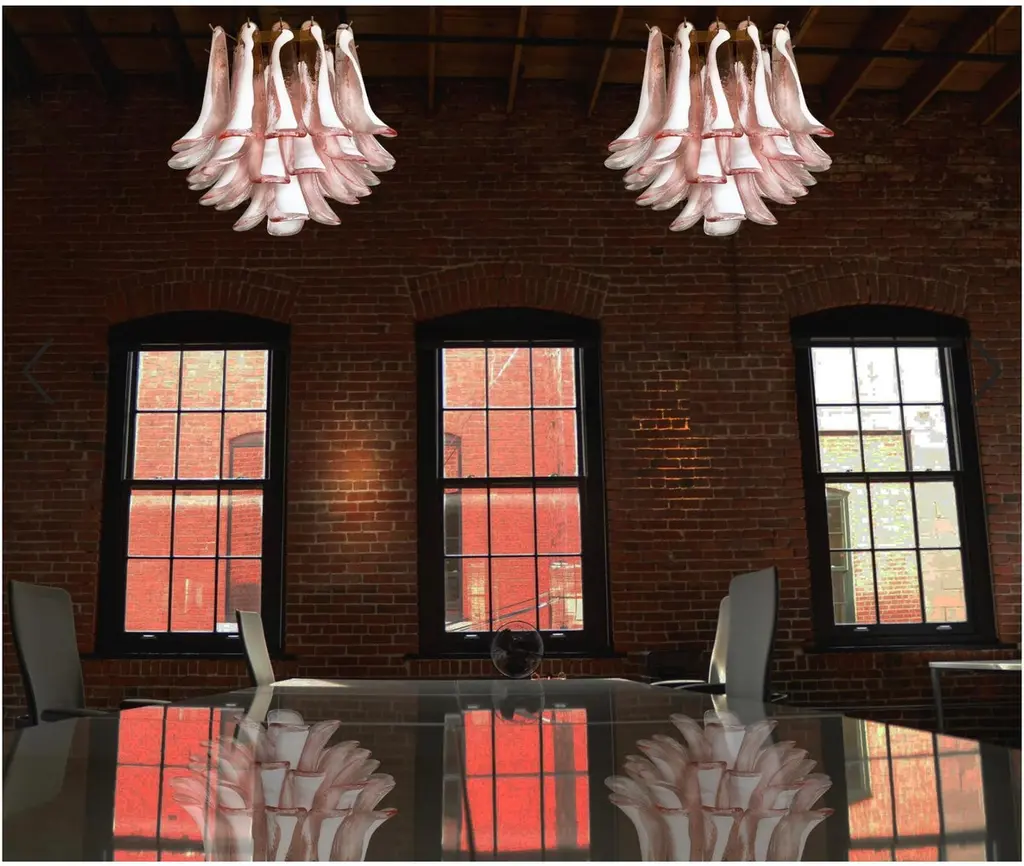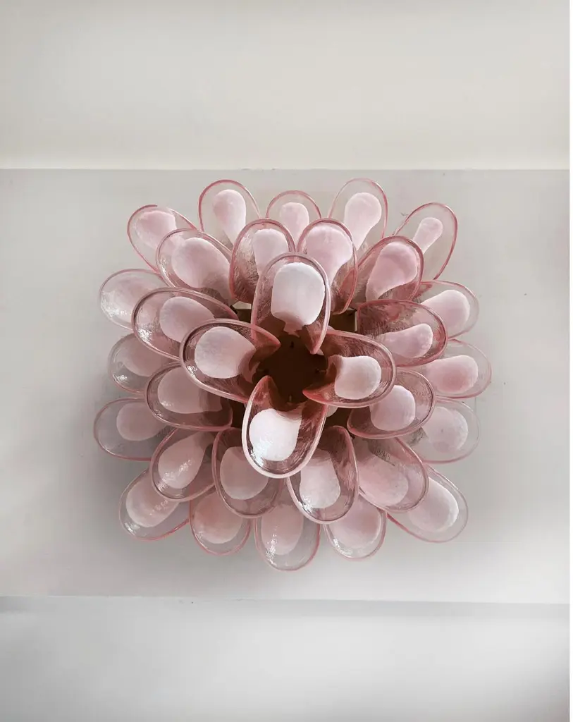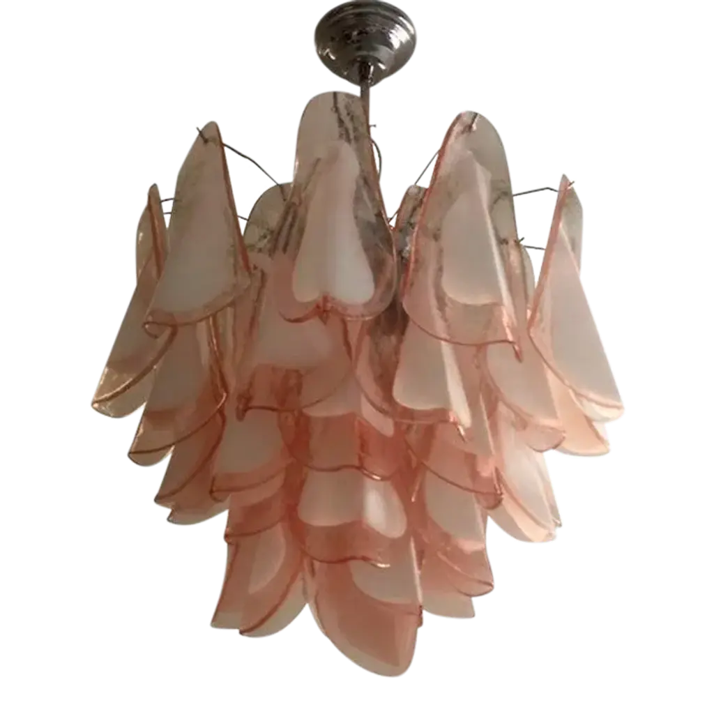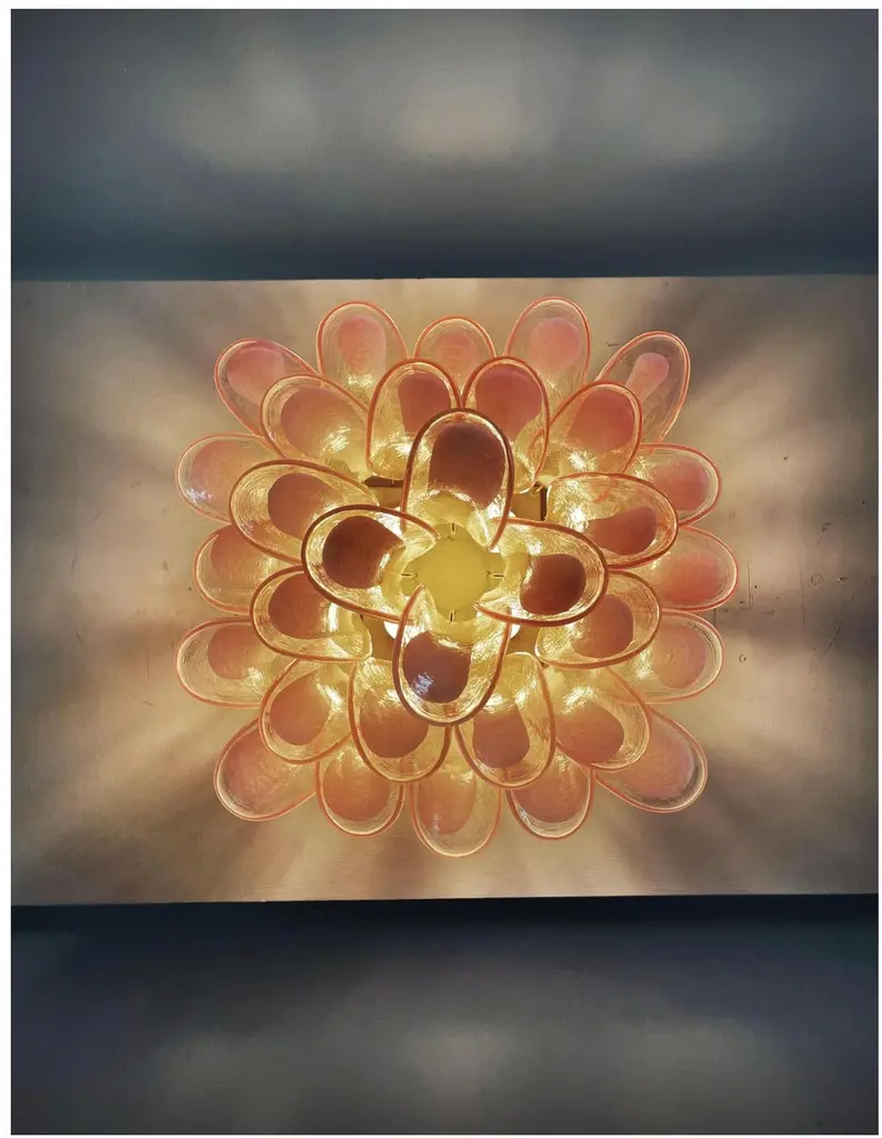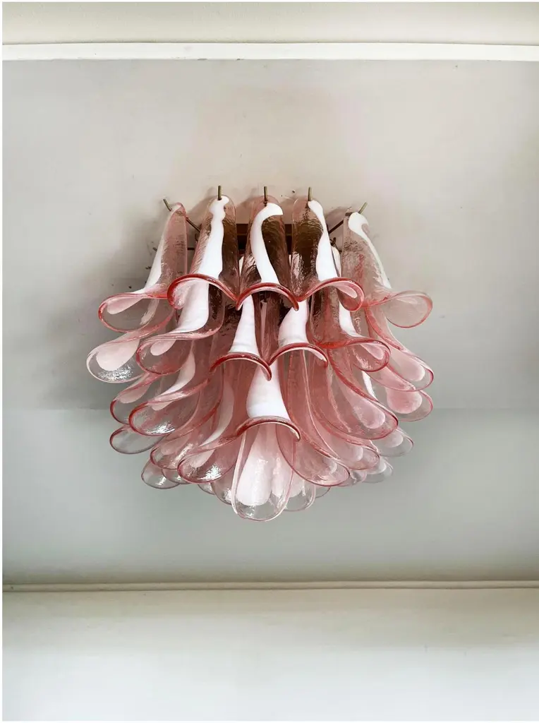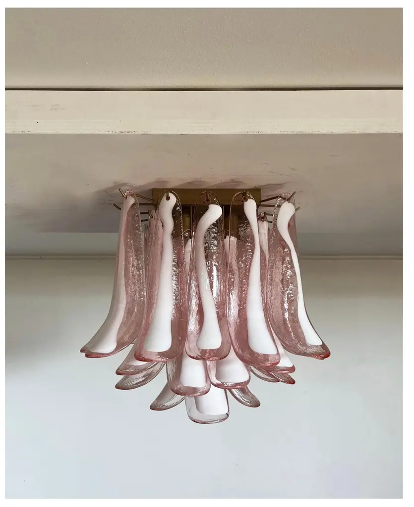 Spectacular ceiling lamp with 32 Murano pink glass petals (pink with white spot) in golden painted metal frame. Elegant lighting object.Period: late XX centuryDimensions: 19,20 inchs (50 cm) height; 19,20 inches (50 cm) width; 19,20 inches (50 cm) depth.Dimension glasses: 11,40 inches (29 cm) height; 3,15 inches (8 cm) maximum width.Light bulbs: 4 light bulbs: E27 dimension (not included in the sale) – – On request we can replace the lampholders with those suitable for the American electrical system.Condition: perfect vintage condition and fully working; the glasses are perfe, golden painted frame has some sign of opacity due to the passing of the years.