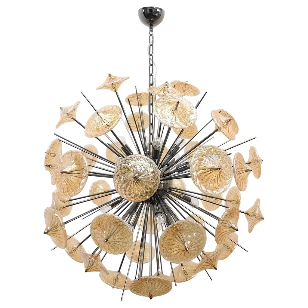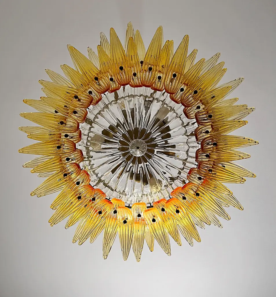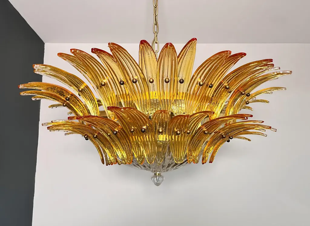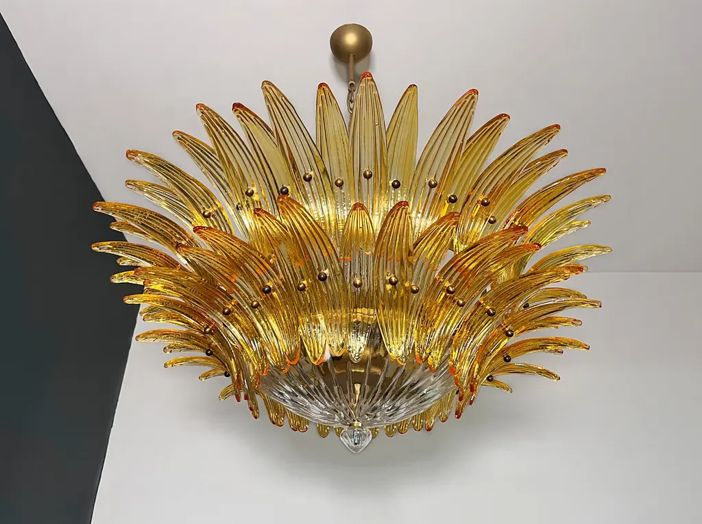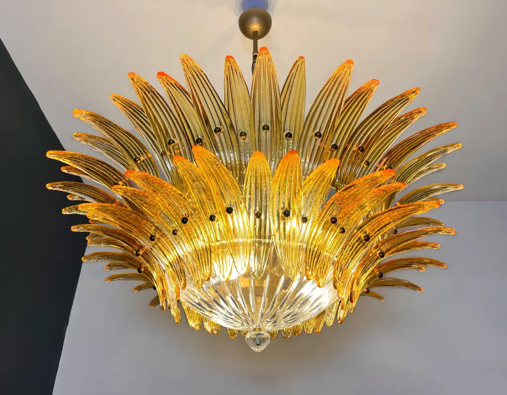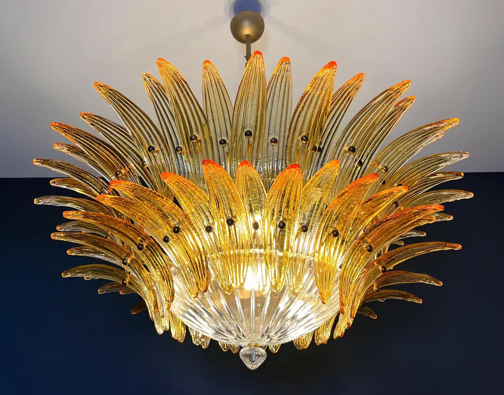 Murano Style Chandelier Ceiling Light Original Palmette, Two Levels, 82 Amber Glasses And Heart Blown