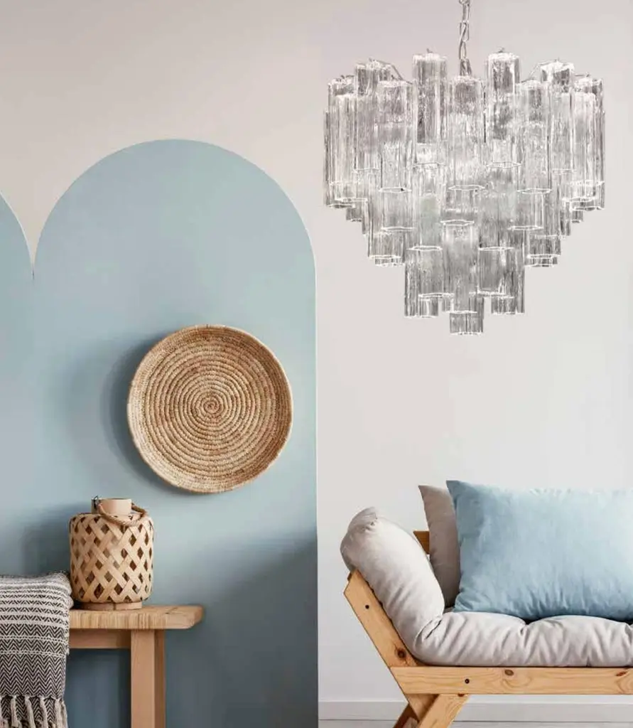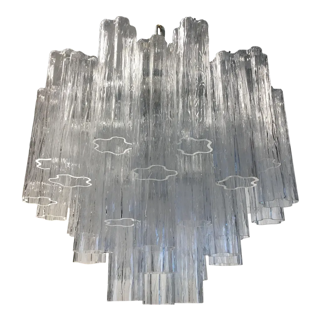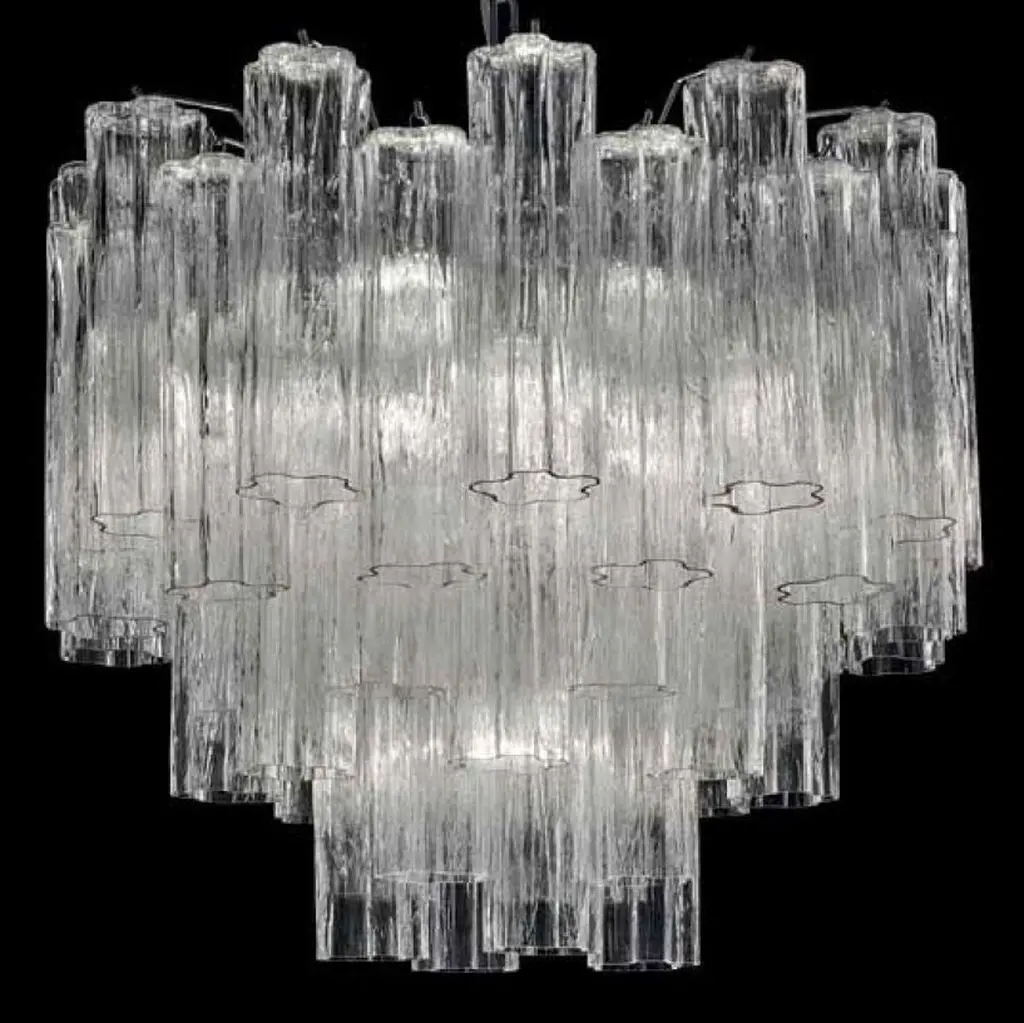 Italian chandelier with 49 clear Murano tronchi glasses of length 25cm, mounted on chrome finish metal frame / Made in Italy by Fabio LtdMeasures: diameter 23.5 inches, height 21.5 inches plus chain and canopy 6 lights, E26 or E27 type, max 60W each and 1 light, E12 or E14 type, max 40WOrder only / this item ships from ItalyOrder reference #: FABIOLTD C869