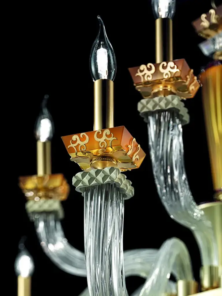 Metal finish: shiny gold 24K - satin gold - shiny silver - satin silver.Colours: Museum ruby: transparent with crystal bobeche, cup and central body in satin ruby.Museum Transparent: transparent with crystal bobeche, cup and central body in satin transparent.Museum Amber: transparent with crystal bobeche, cup and central body in satin amber.Museum amethyst: transparent with crystal bobeche, cup and central body in satin amethyst.Particular: chandelier patented and registered with its individual components.Square arm and other components made in Venice.Decorative elements with shaped diamond are in colored beech wood.Embellished with Swarovski® crystals, pendants and circle application.Laser cutting element with personalized drawing in gold foil and silver foil.