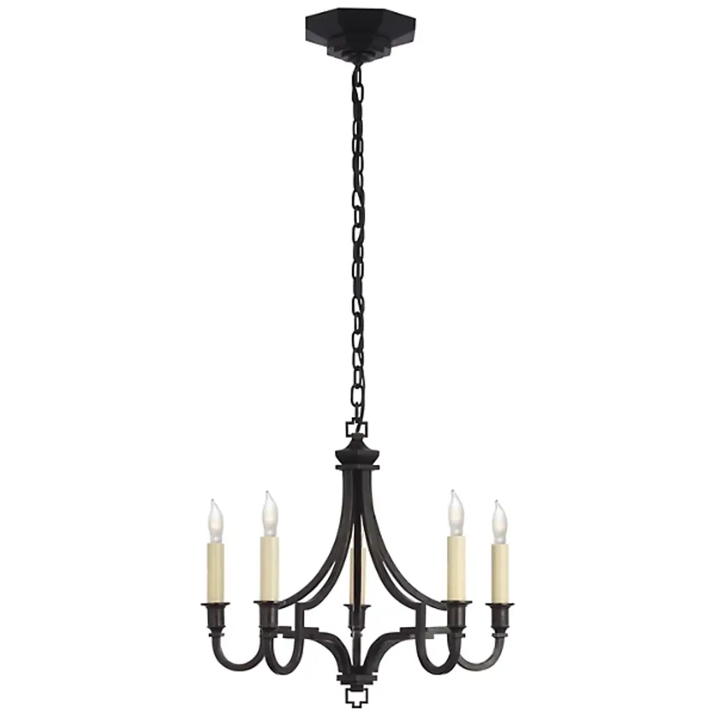 The Mykonos Chandelier from Visual Comfort Signature, formerly known as Visual Comfort, adds a vintage enhancement to indoor spaces. Well-suited to high ceilings, it uses a stepped, faceted canopy and long central chain to support an airy lower structure of swooping metal rods that extend from a central finial. Each arm sweeps down, out, and up, terminating in a stylized candelabra style lamp oriented upwards and in the open, enhancing its surroundings with a broad crown of bright light.
