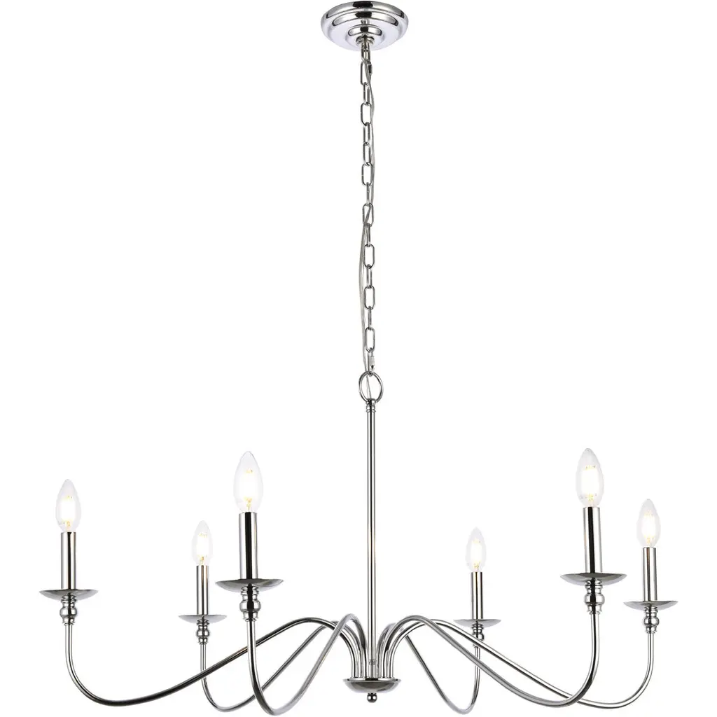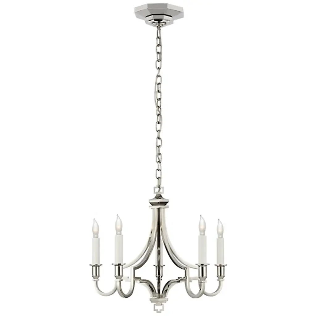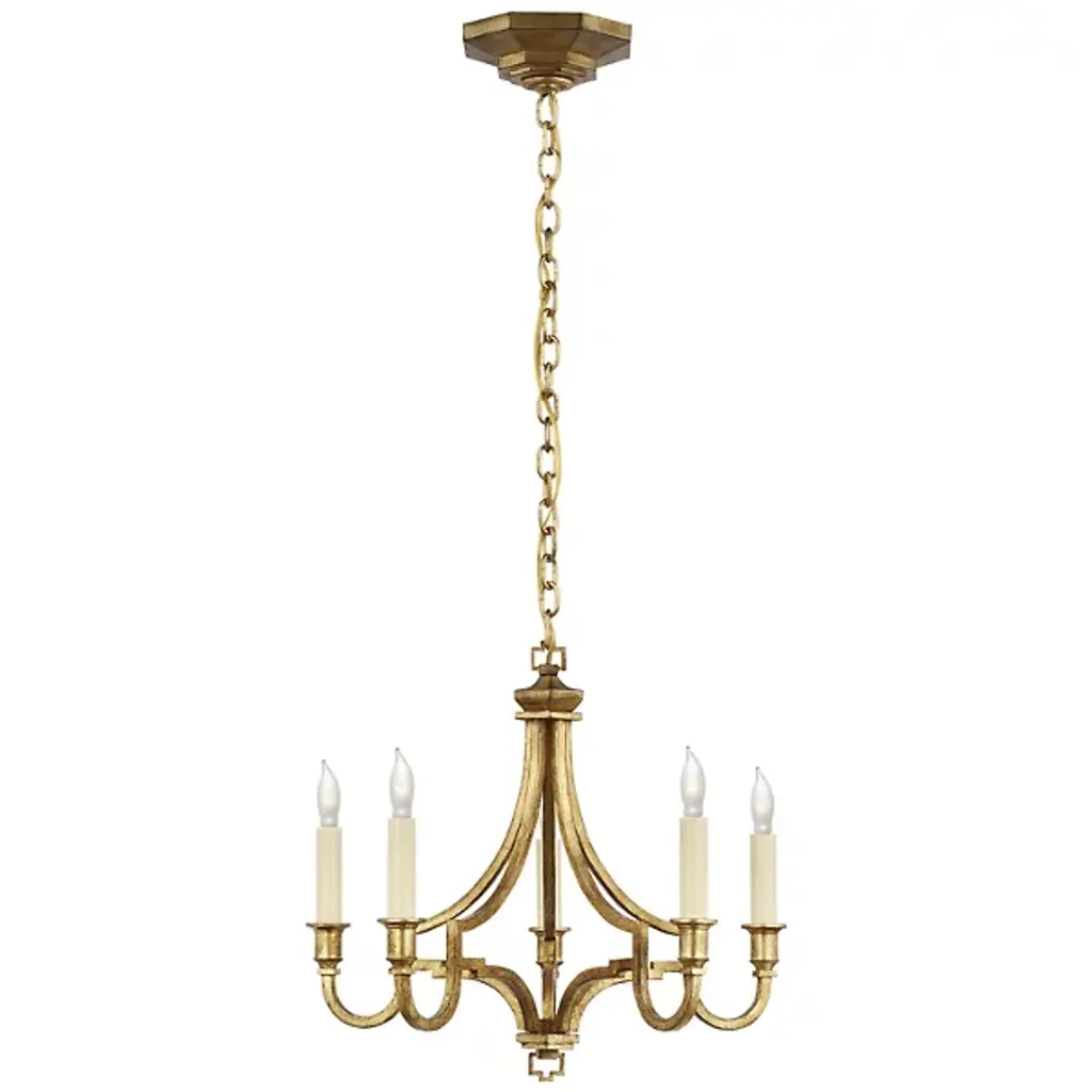 The Mykonos Chandelier from Visual Comfort Signature, formerly known as Visual Comfort, adds a vintage enhancement to indoor spaces. Well-suited to high ceilings, it uses a stepped, faceted canopy and long central chain to support an airy lower structure of swooping metal rods that extend from a central finial. Each arm sweeps down, out, and up, terminating in a stylized candelabra style lamp oriented upwards and in the open, enhancing its surroundings with a broad crown of bright light.
