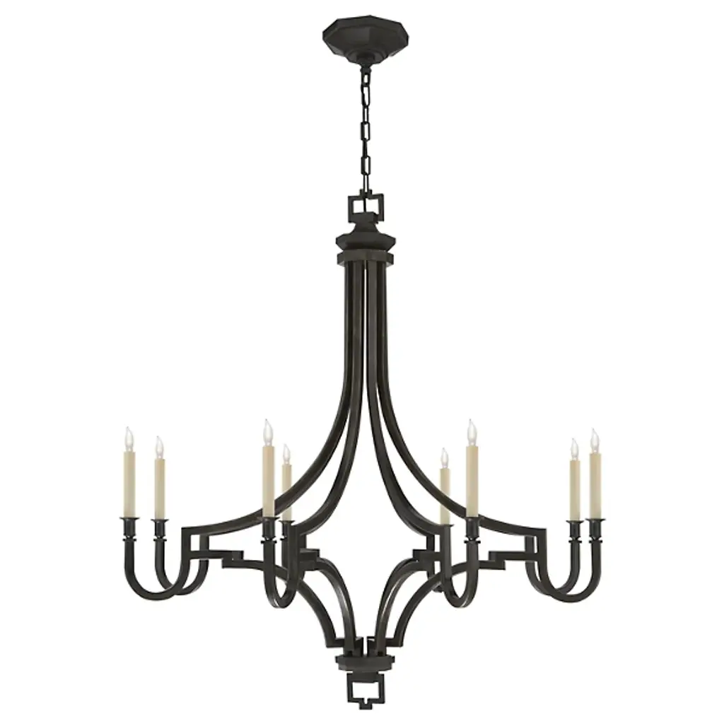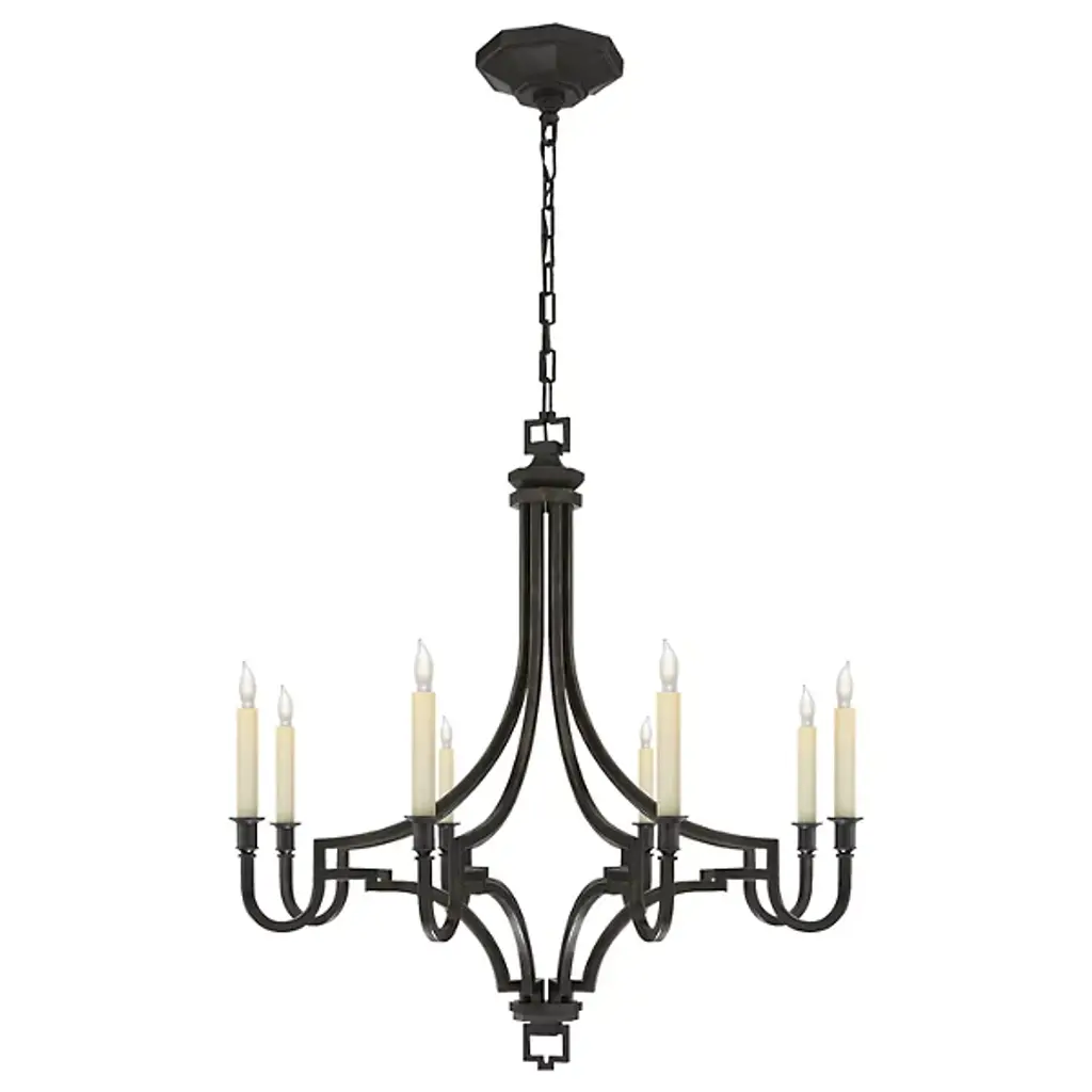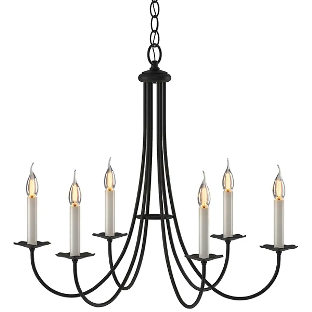 Seduction through repetition. The Mykonos Chandelier from Visual Comfort Signature, formerly known as Visual Comfort, pulls one closer with overflowing curves and heartfelt, candle-inspired lighting. Mid-century modern design comes calling in this chandelier’s simply stunning structure. Made from steel, the main structure produces sweeping curves that mirror each other for a beautiful tapering silhouette. The arms swing out tightly with vintage bobeche accents. Speaking of throwback, the tubular lamp holders combine with candelabra bulbs to create a charming candle display. This display delivers a bright, gripping aura.