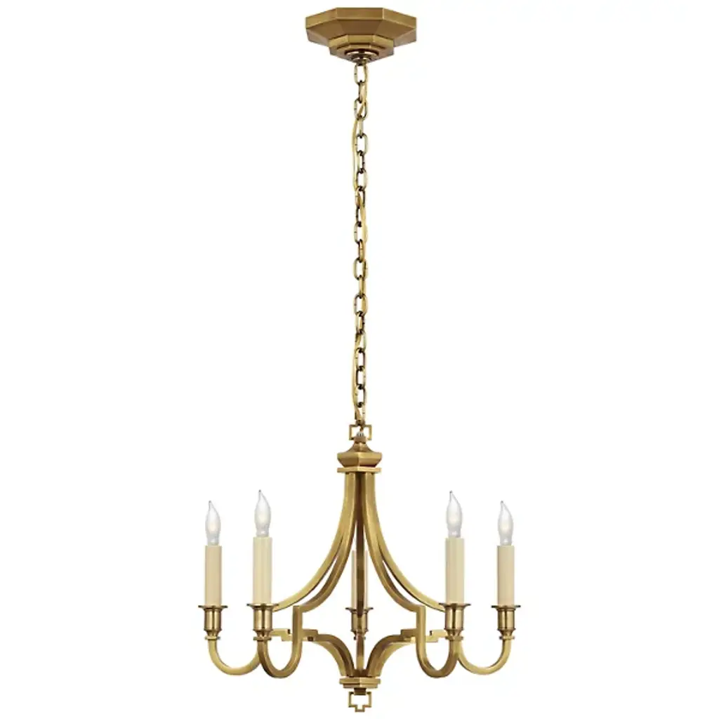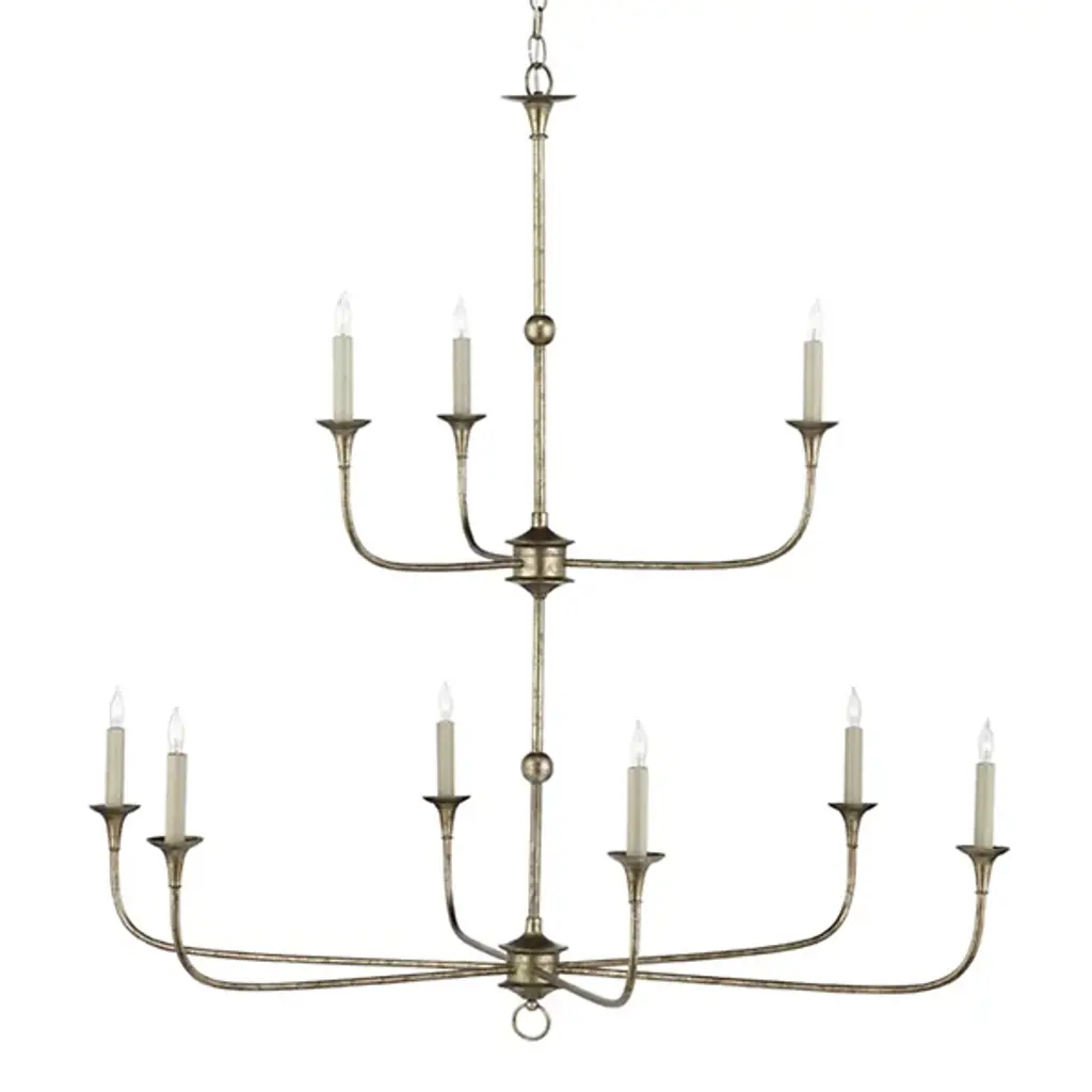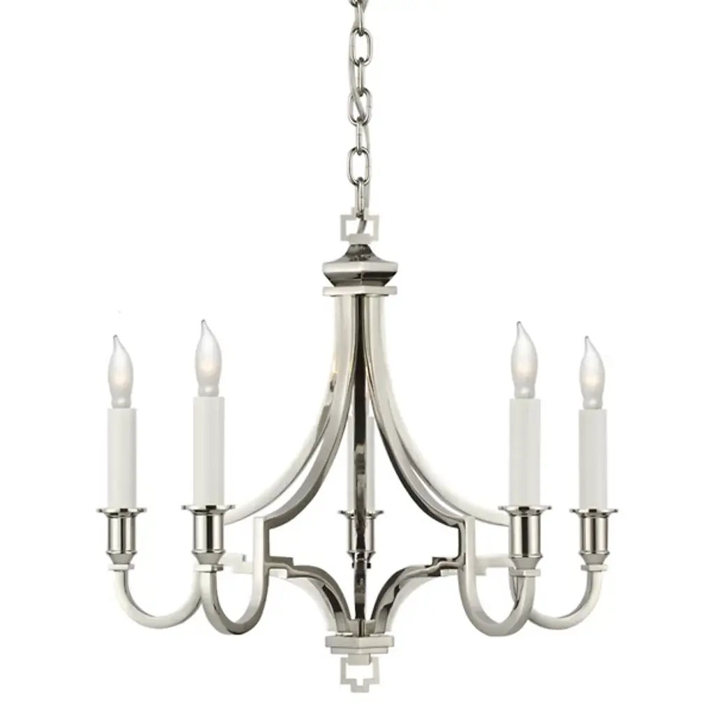 The Mykonos Chandelier from Visual Comfort Signature, formerly known as Visual Comfort, adds a vintage enhancement to indoor spaces. Well-suited to high ceilings, it uses a stepped, faceted canopy and long central chain to support an airy lower structure of swooping metal rods that extend from a central finial. Each arm sweeps down, out, and up, terminating in a stylized candelabra style lamp oriented upwards and in the open, enhancing its surroundings with a broad crown of bright light.