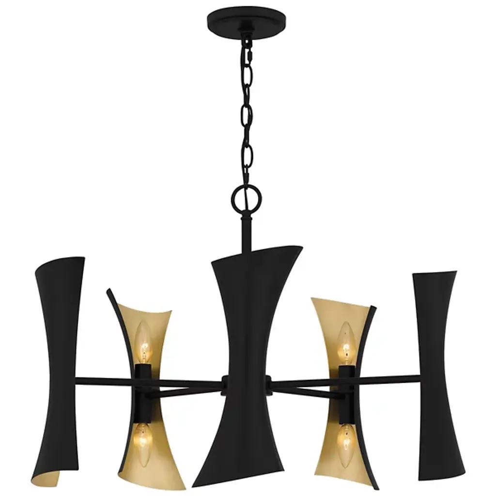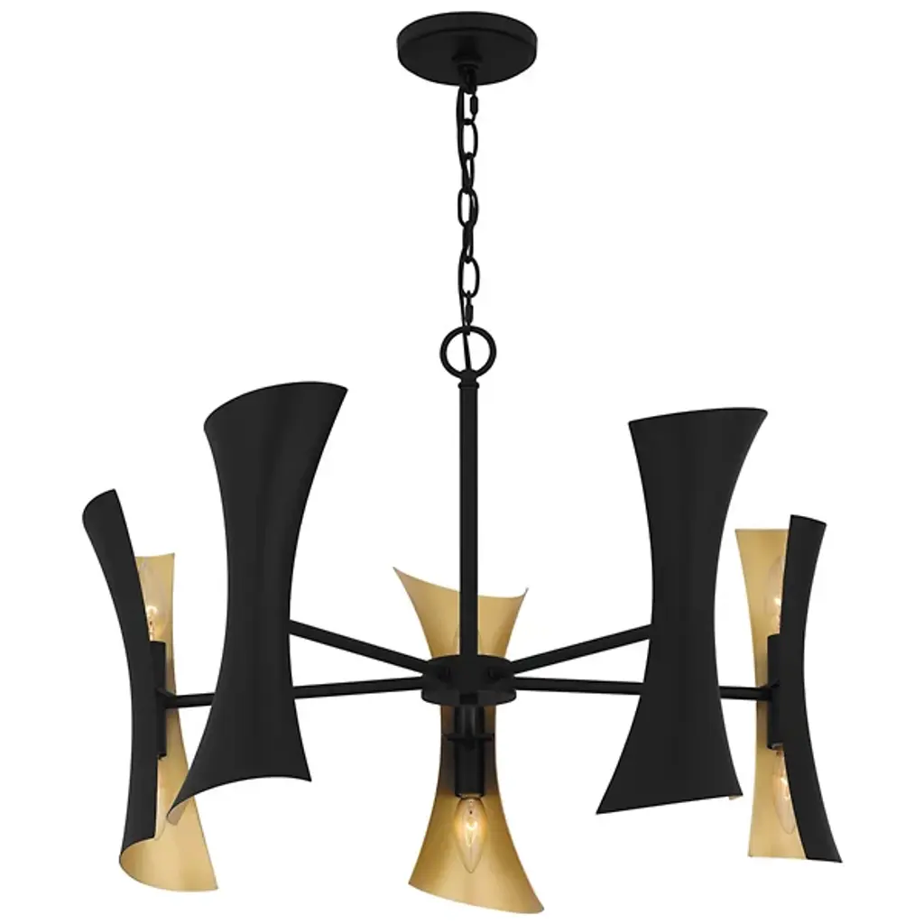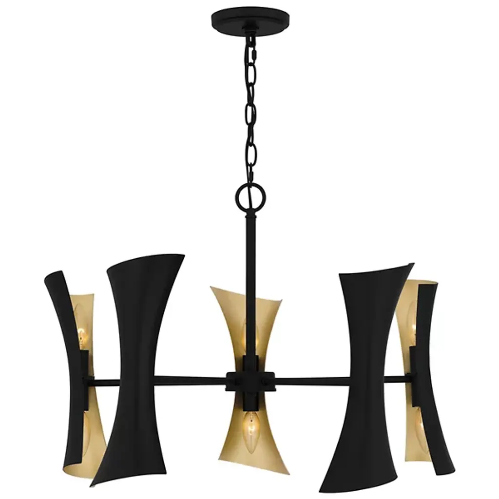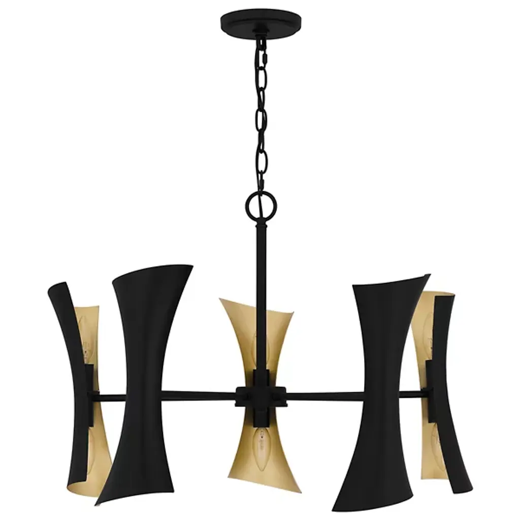 The Myla Chandelier by Quoizel is a modern fixture that commands attention with its bold geometric design. Featuring angular steel panels arranged in an hourglass outline, this chandelier has contrasting finishes on the interior and exterior of each shade. Its unique shape draws the eye upward, perfect for accentuating high ceilings in foyers, dining rooms, or open-concept living spaces. The adjustable chain allows for versatile placement to suit various ceiling heights.