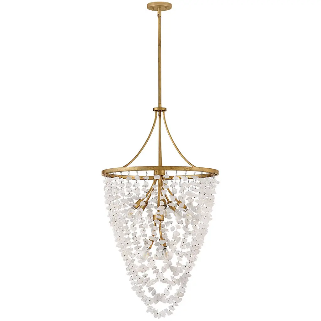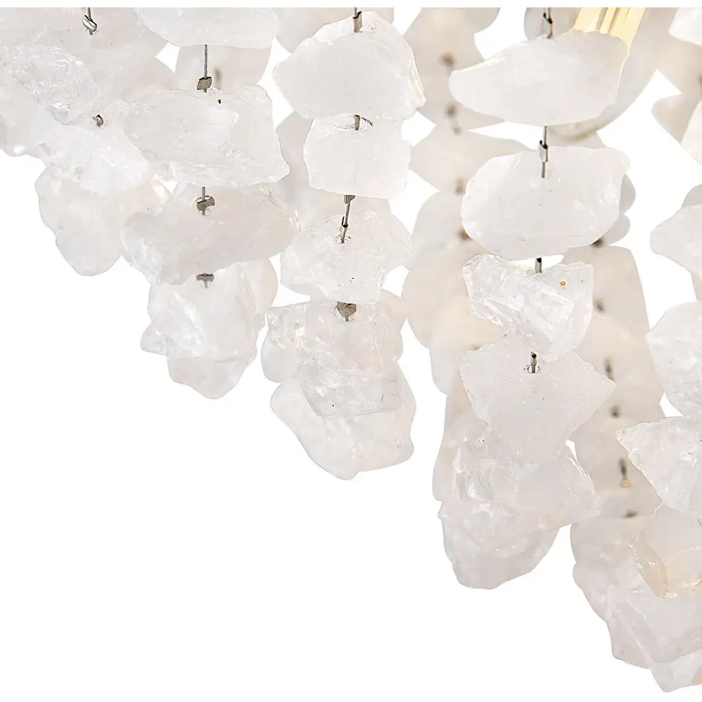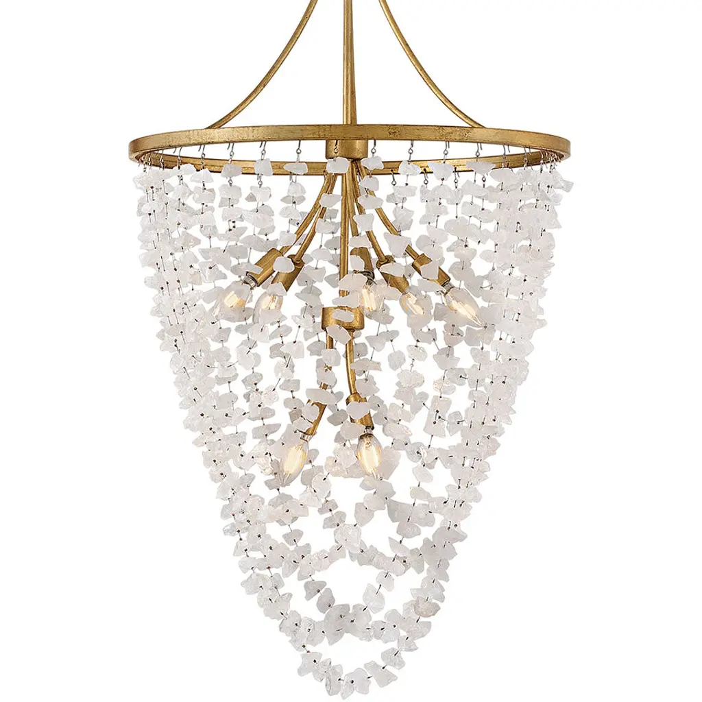 Glamorous strands of rock crystal hang delicately from Myras gold-toned Distressed Brass frame, creating a beautiful curtain of uniquely shaped stones. Each naturally formed facet reflects light from elegant, dimmable candelabra lamps.