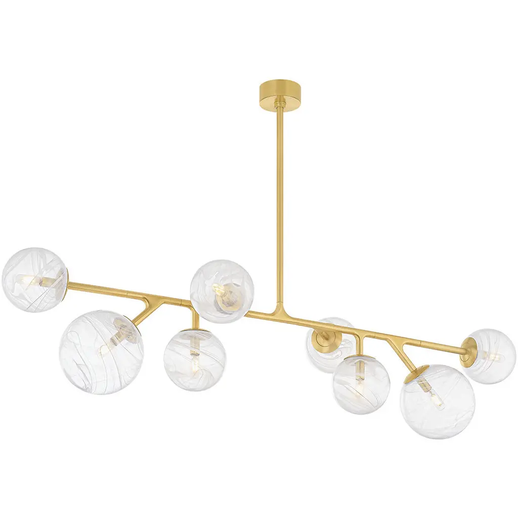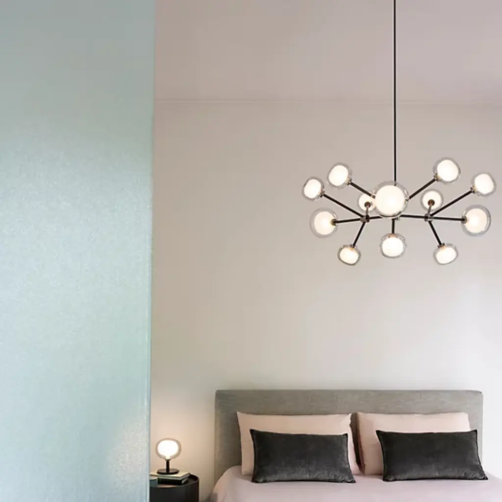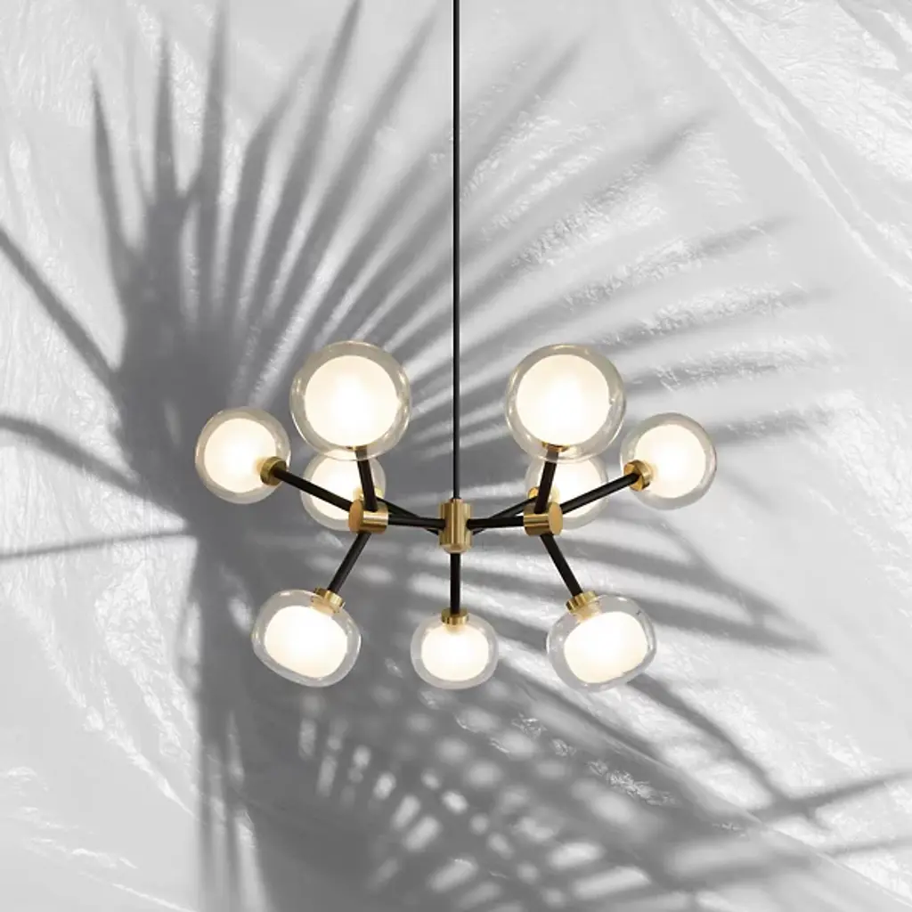 Bring an artistic sensibility to your living space with the Nabila Chandelier by Tooy. This chandelier is the realized vision of designer Corrado Dotti. This light fixture is composed of fine metal. A linear framework allows the lights to be presented in a splayed manner, with clusters of globe-shaped shades of glass maintaining suspension in midair. Within these shades, LED lamps project vibrant light throughout your surroundings. The eye is drawn to the cylindrical embellishments which surround the metalwork’s points of convergence.