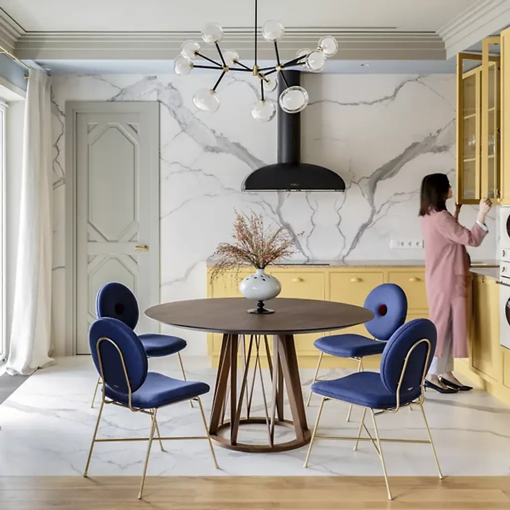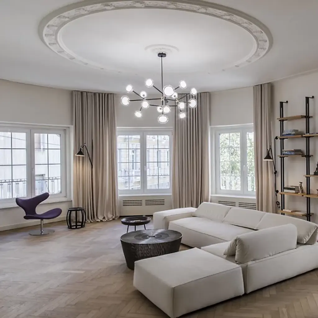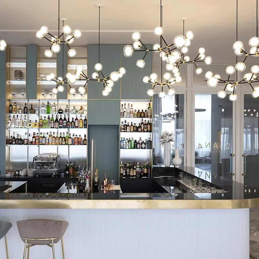 Bring an artistic sensibility to your living space with the Nabila Chandelier by Tooy. This chandelier is the realized vision of designer Corrado Dotti. This light fixture is composed of fine metal. A linear framework allows the lights to be presented in a splayed manner, with clusters of globe-shaped shades of glass maintaining suspension in midair. Within these shades, LED lamps project vibrant light throughout your surroundings. The eye is drawn to the cylindrical embellishments which surround the metalwork’s points of convergence.
