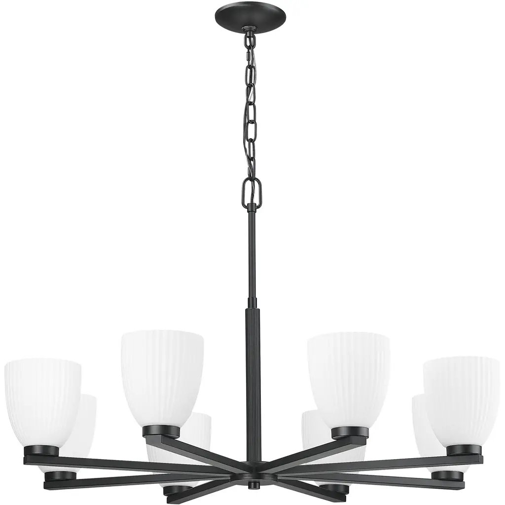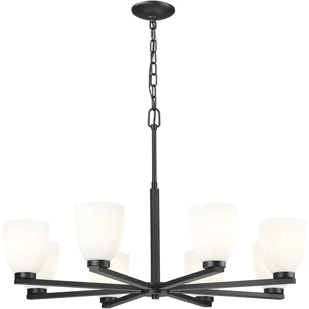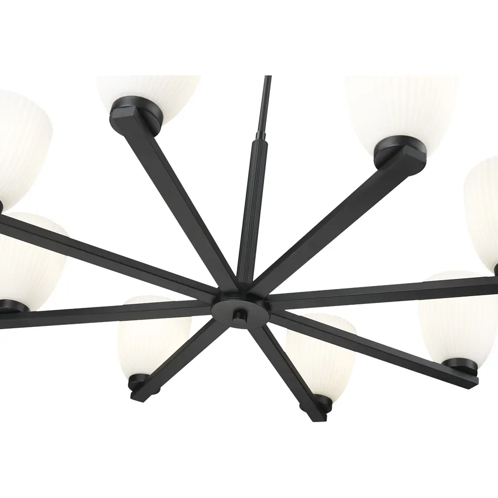 This eight-light chandelier pairs a dramatic matte black finish with the soft, sculptural presence of matte opal glass. Ribbed shades add depth to the glow, diffusing light into smooth, layered ambiance. Its bold, architectural lighting that centers the room with intention.