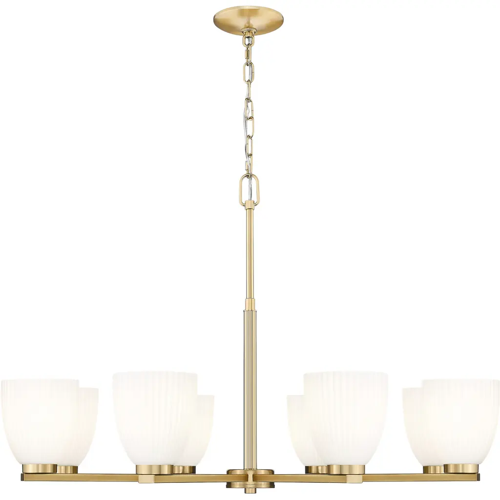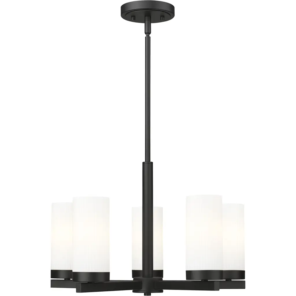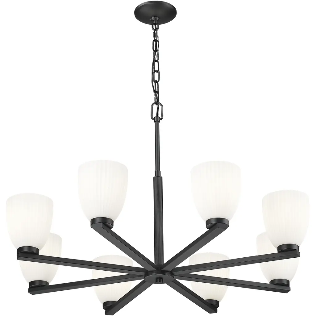 This eight-light chandelier pairs a dramatic matte black finish with the soft, sculptural presence of matte opal glass. Ribbed shades add depth to the glow, diffusing light into smooth, layered ambiance. Its bold, architectural lighting that centers the room with intention.