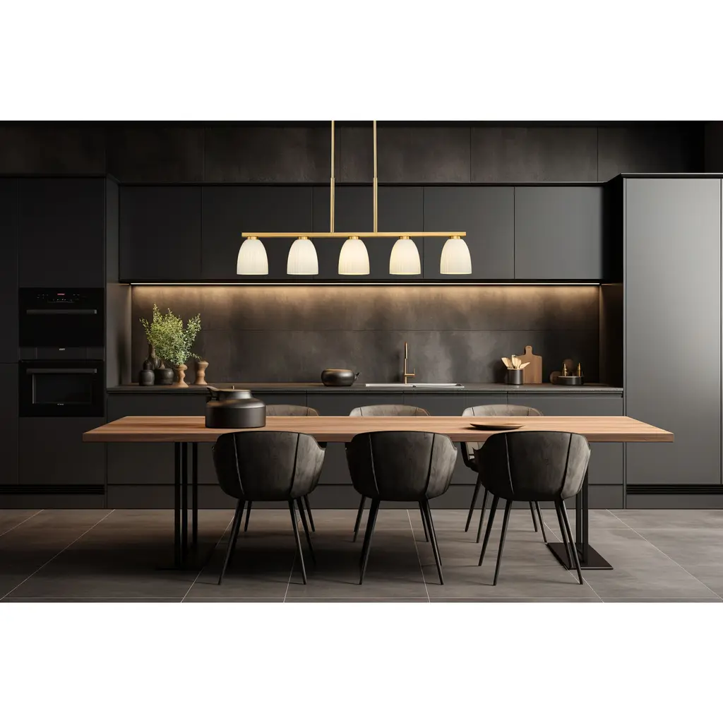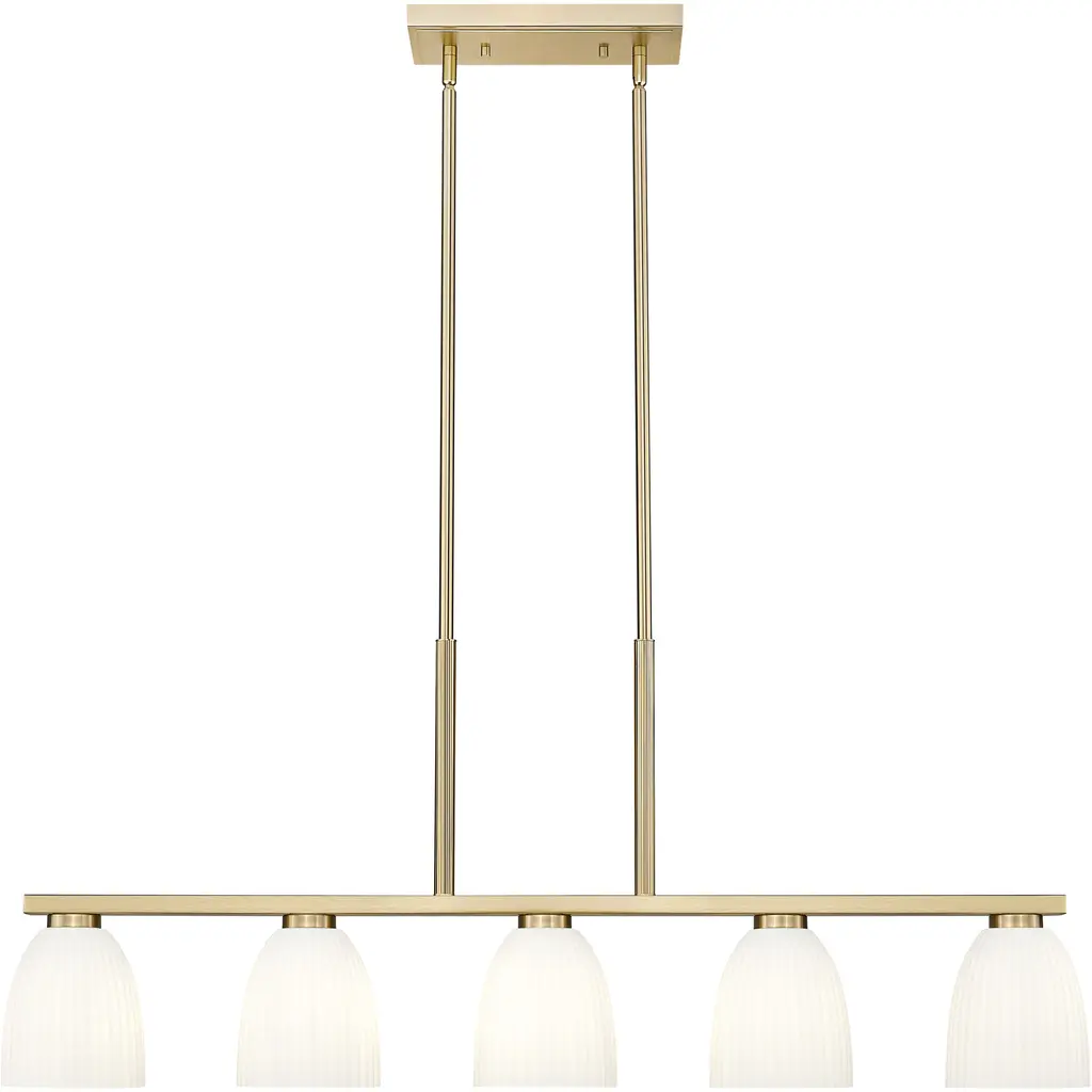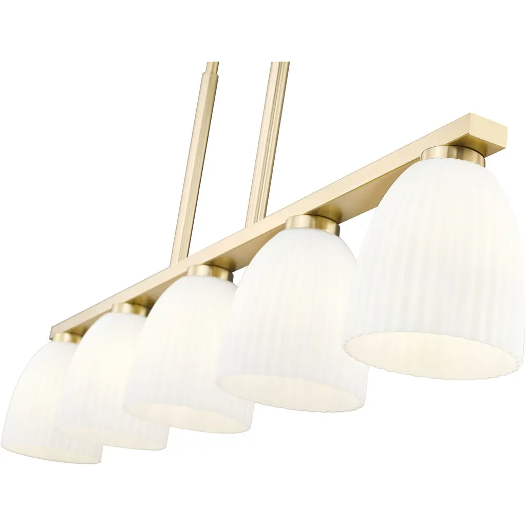 Dressed in a modern gold finish, this five-light linear chandelier stretches across the space with graceful balance and warmth. Ribbed matte opal glass shades diffuse the light into soft, ambient layers that feel calm and elevated. Its a refined anchor for dining rooms, islands, or anywhere a little glow goes a long way.