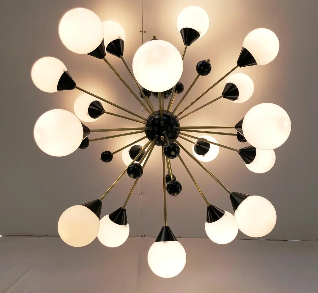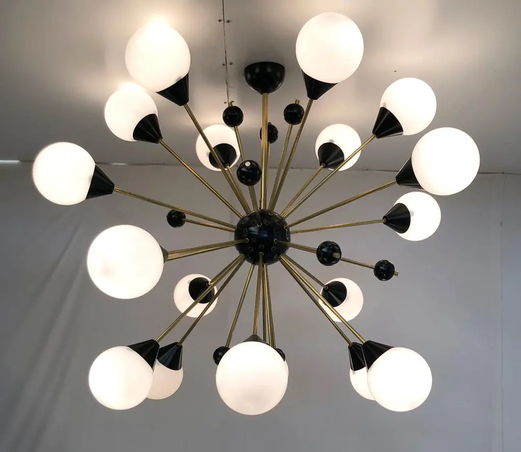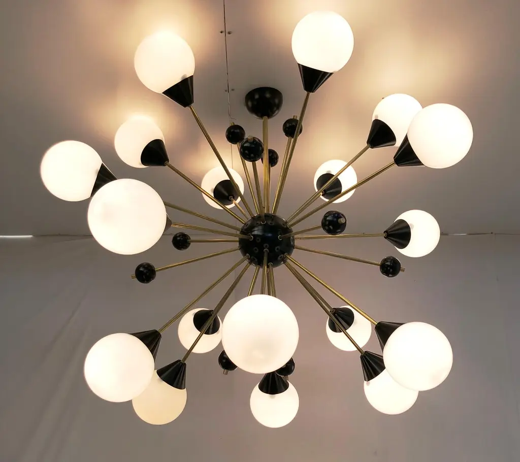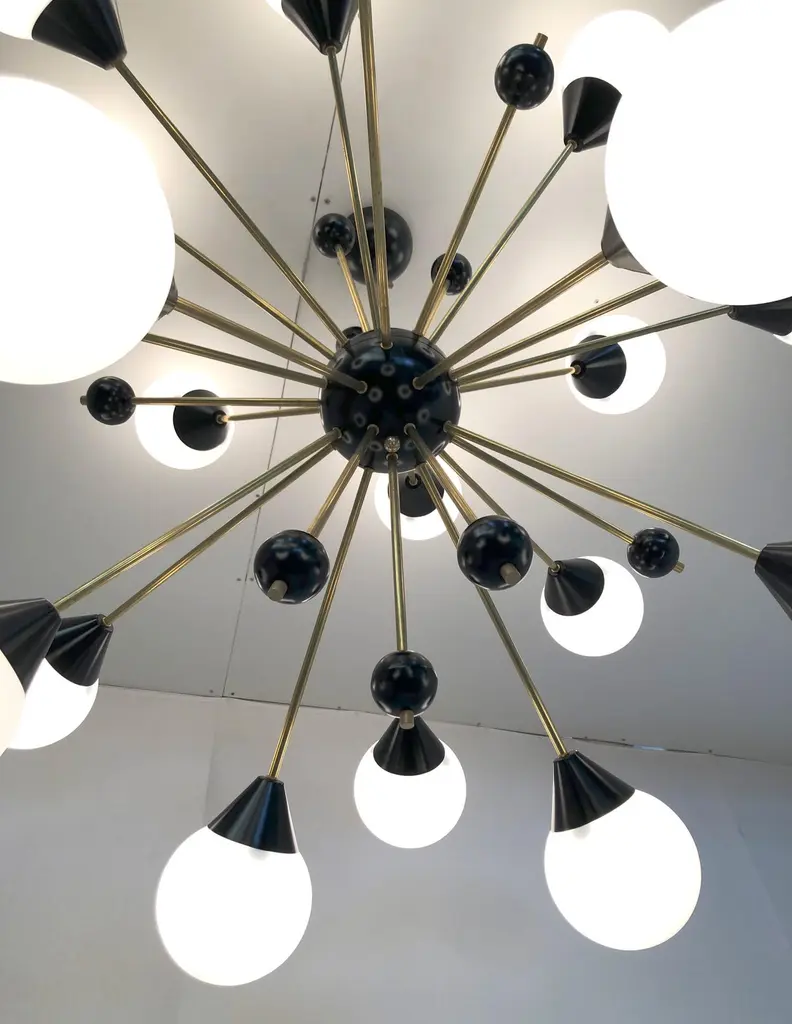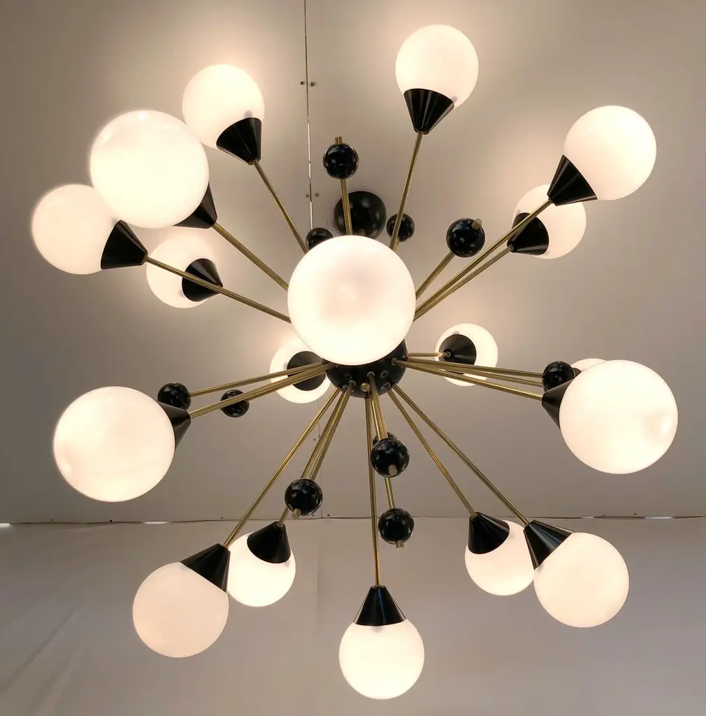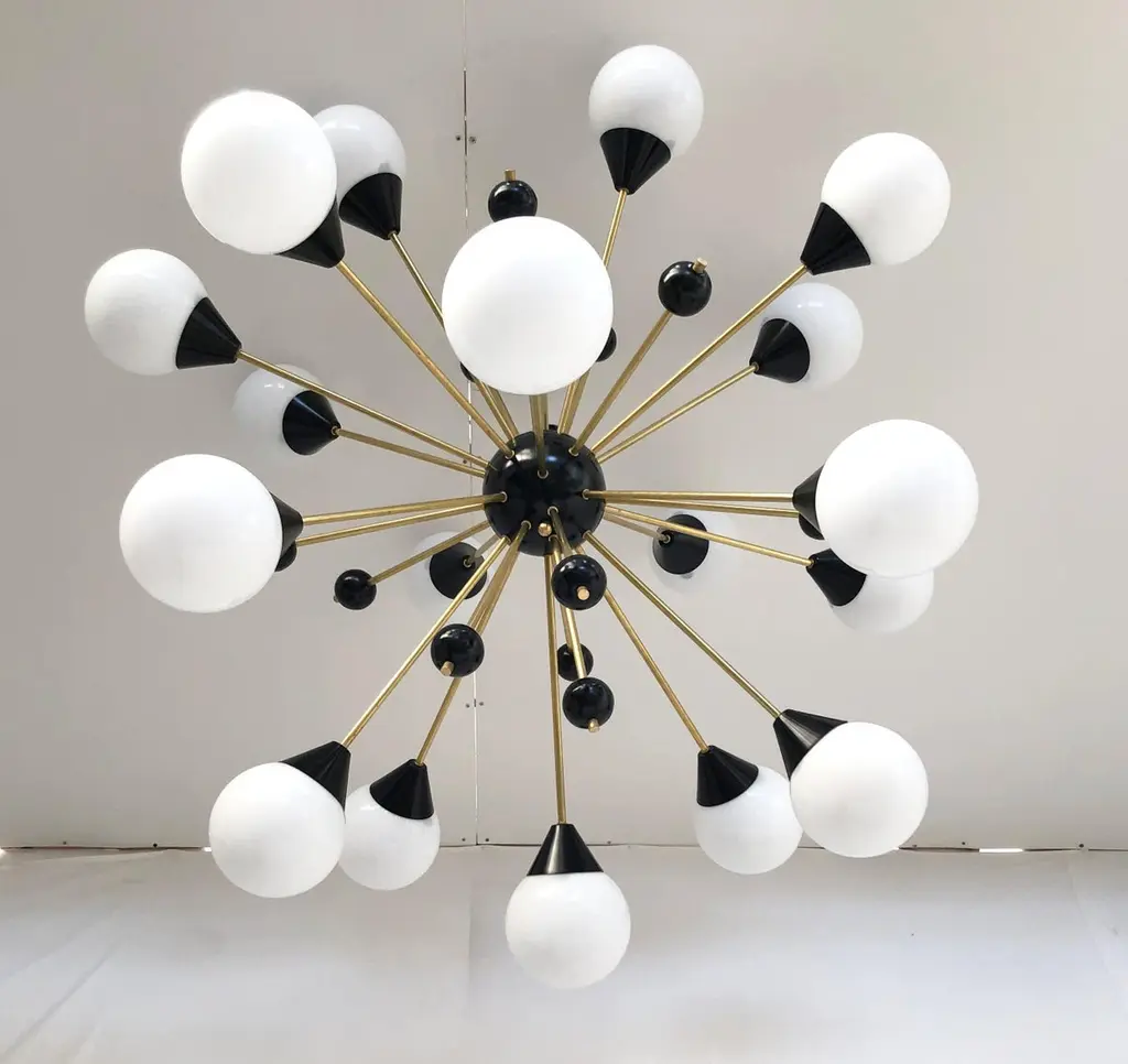Italian midcentury style Sputnik chandelier with 18 glossy white Murano glass globes on unlacquered natural brass stems, with small black decorative globes, black center and ceiling canopy / designed by Fabio Bergomi for Fabio Ltd, made in Italy18-light / E12 or E14 type / max 40W eachMeasures: Diameter 48 inches, height 39.5 inches including rod and canopyOrder only / this item ships from ItalyOrder Reference #: FABIOLTD C735 WHITE