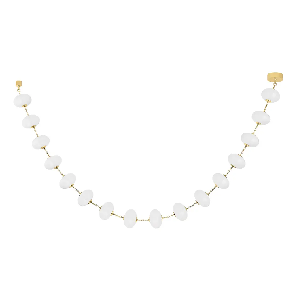 Echoing the artistry of bespoke installations and the graceful allure of fine jewelry, Nephele floats elegantly in space, resembling a string of luminous pearls suspended in perfect harmony. Each softly glowing cloud glass orb is held in place by intricately detailed Vintage Polished Brass links, creating a striking interplay of light and form. Nephele captivates the senses with its fluid silhouette and exquisite craftsmanship. This artful statement piece offers a refined elegance that elevates interiors with its sculptural presence. Features