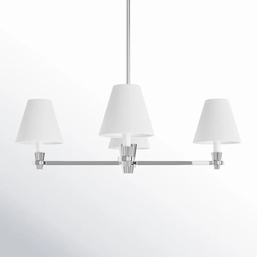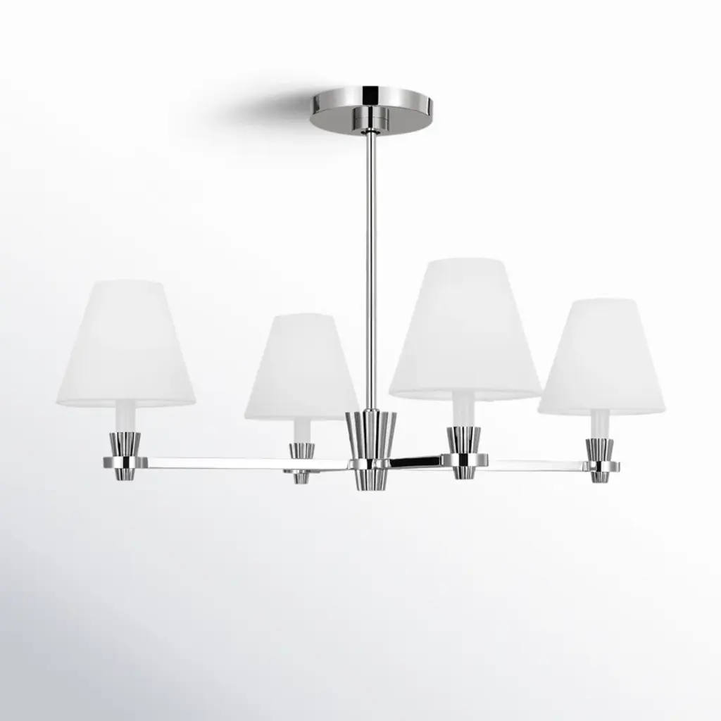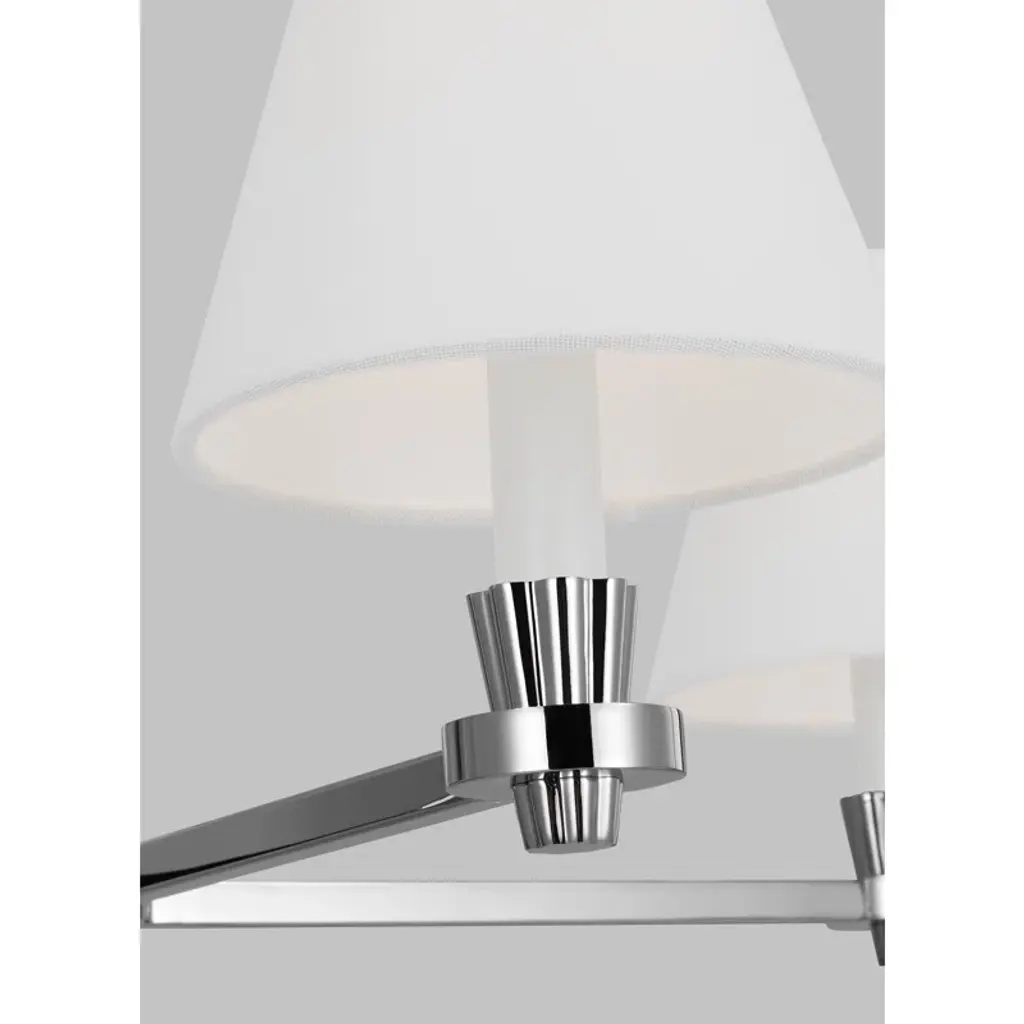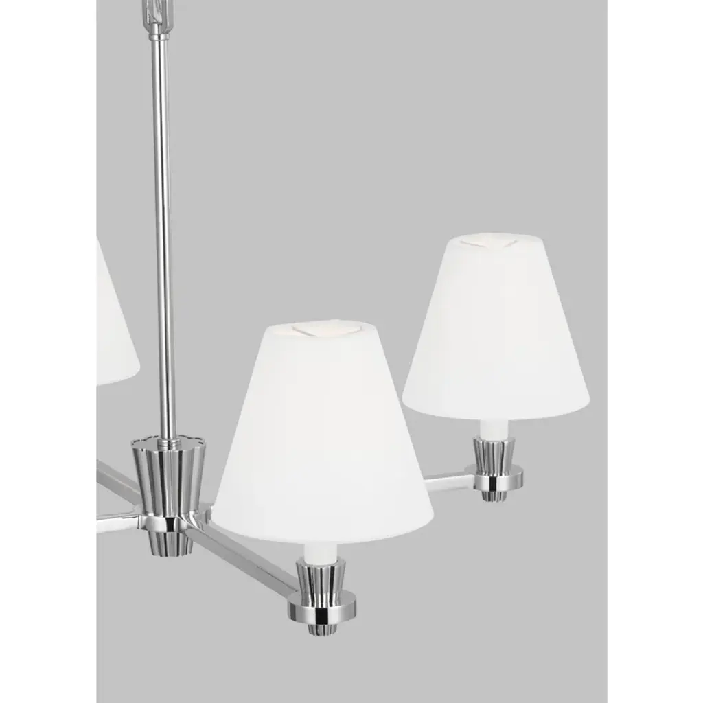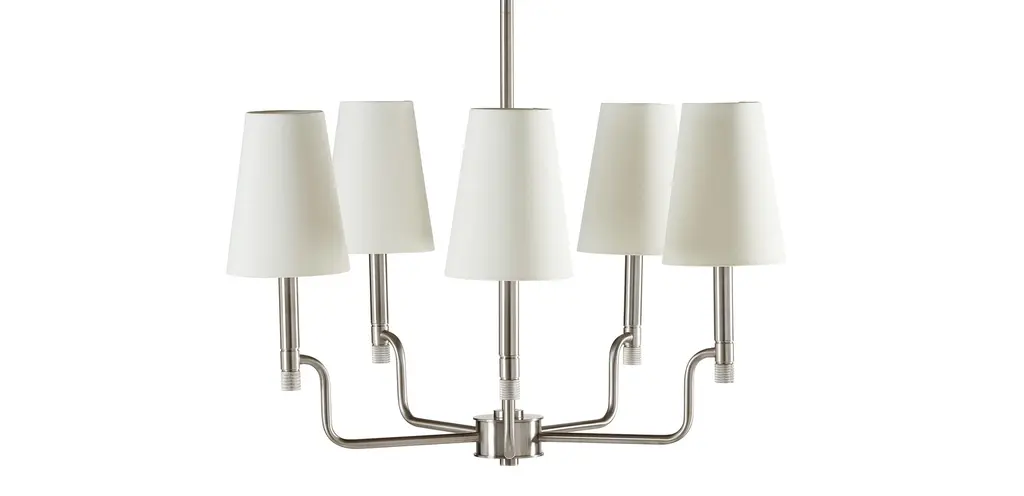 Nevis is a classic shaded series with intentional contemporary details. On the chandelier, the eye is instantly drawn to the hub, whose soft riveted design extends to candle tubes that share the same design element.